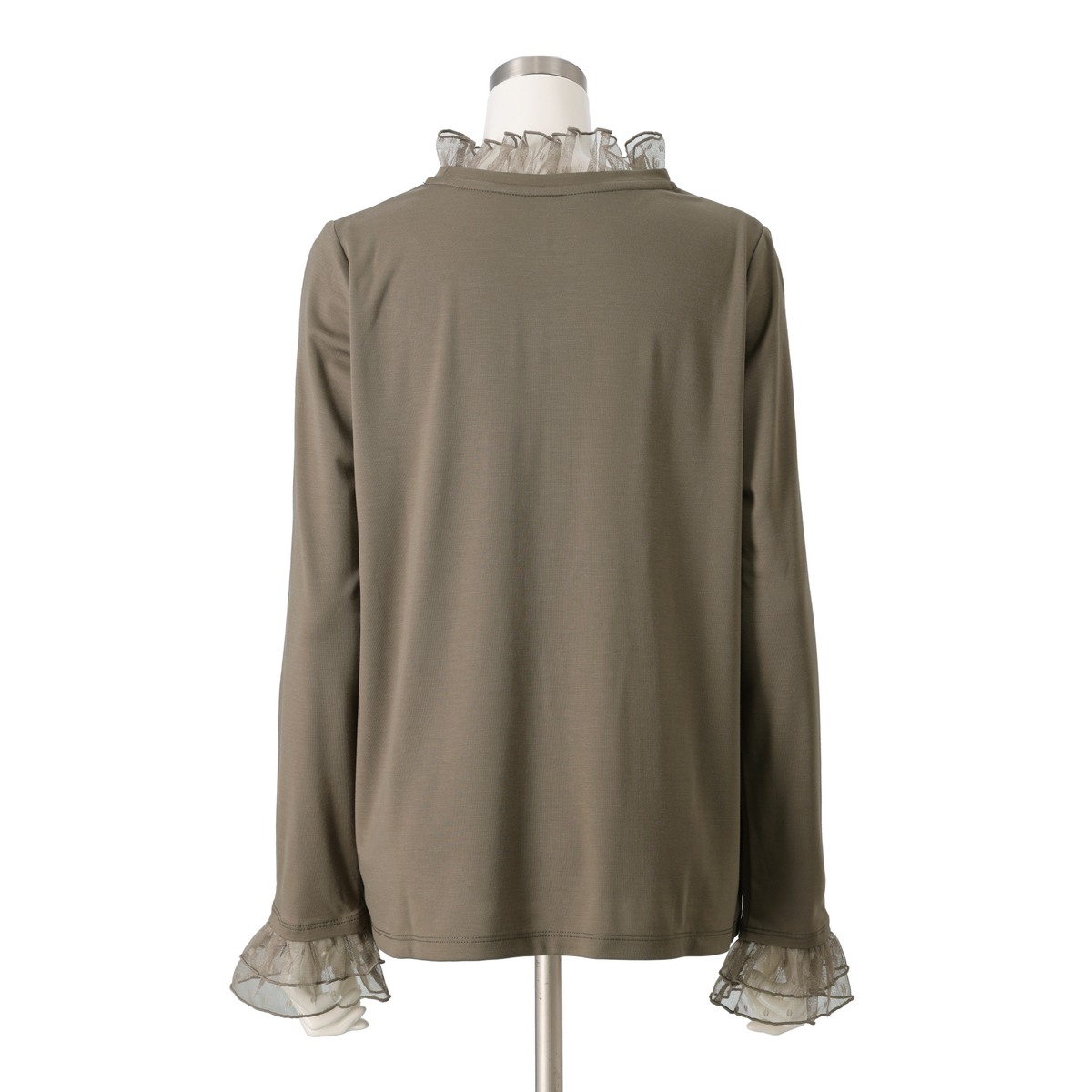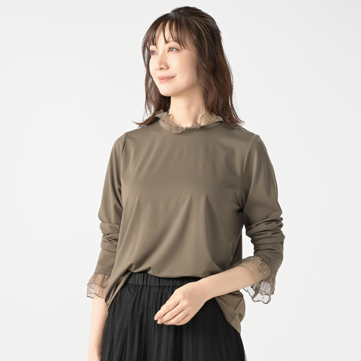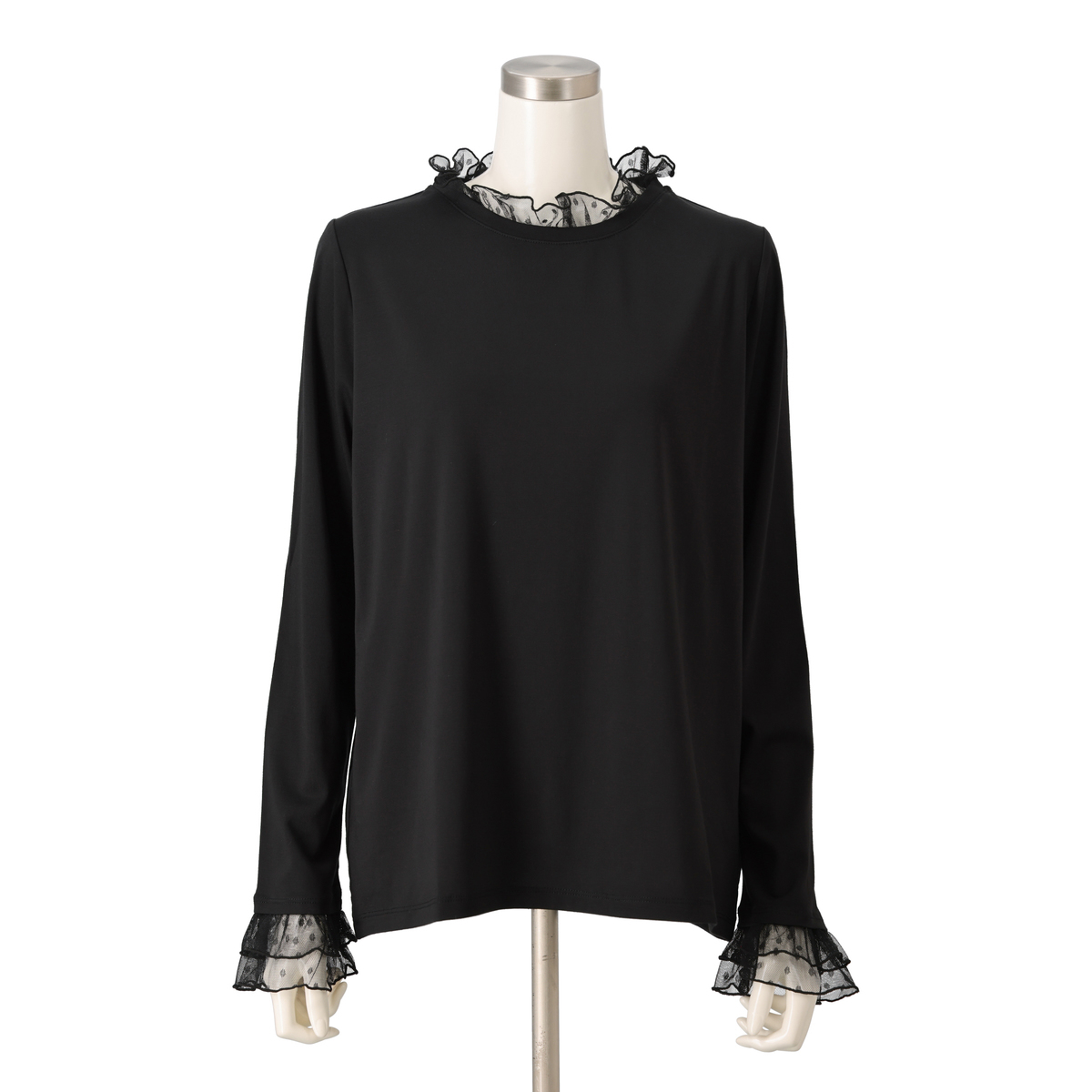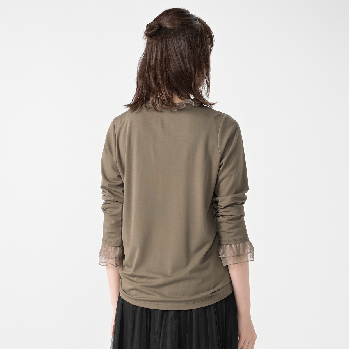 襟元と袖口にチュールをあしらい、華やかに仕上げたプルオーバー。首元はメロー仕上げで軽やかな立ち上がりを表現し、チュールギャザーがふんわりと広がる袖口で手元を華奢見せしてくれます
