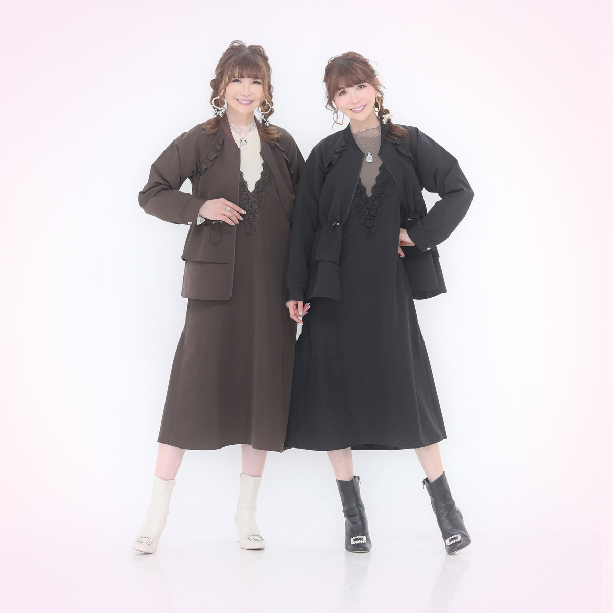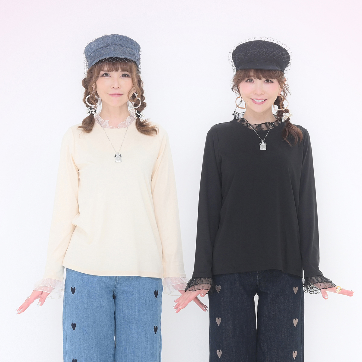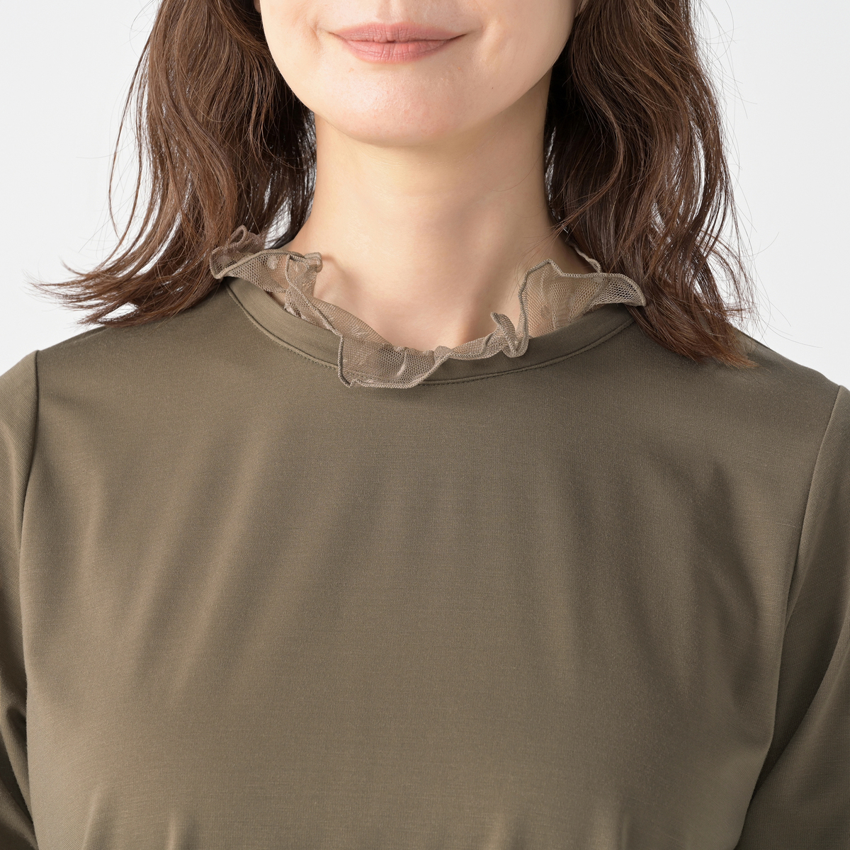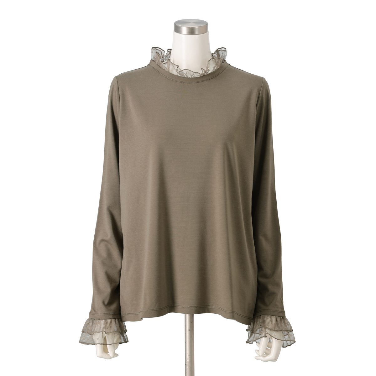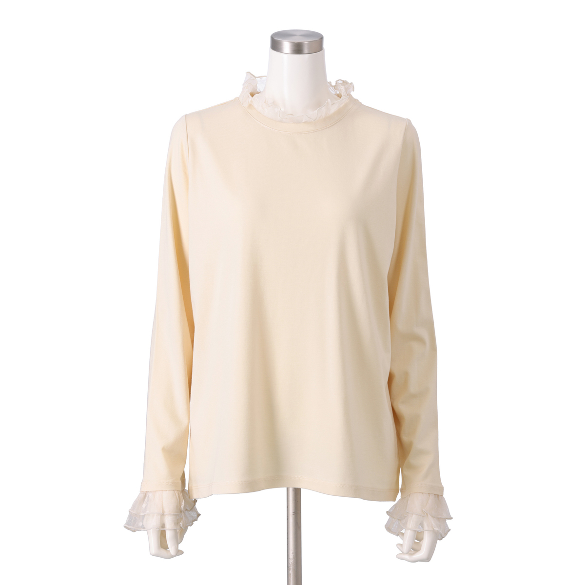 襟元と袖口にチュールをあしらい、華やかに仕上げたプルオーバー。首元はメロー仕上げで軽やかな立ち上がりを表現し、チュールギャザーがふんわりと広がる袖口で手元を華奢見せしてくれます