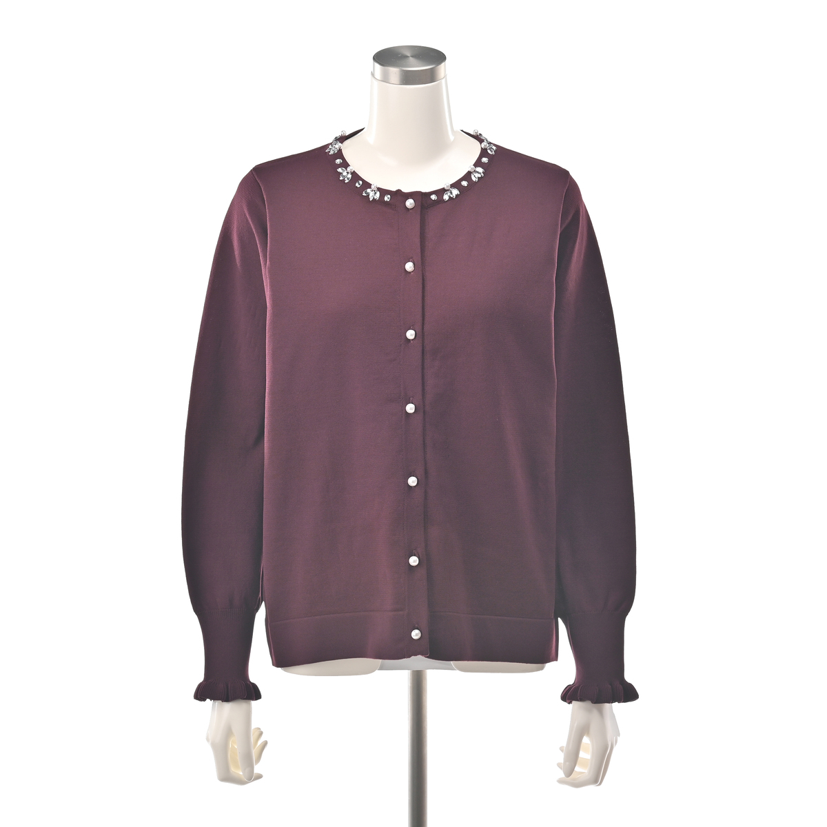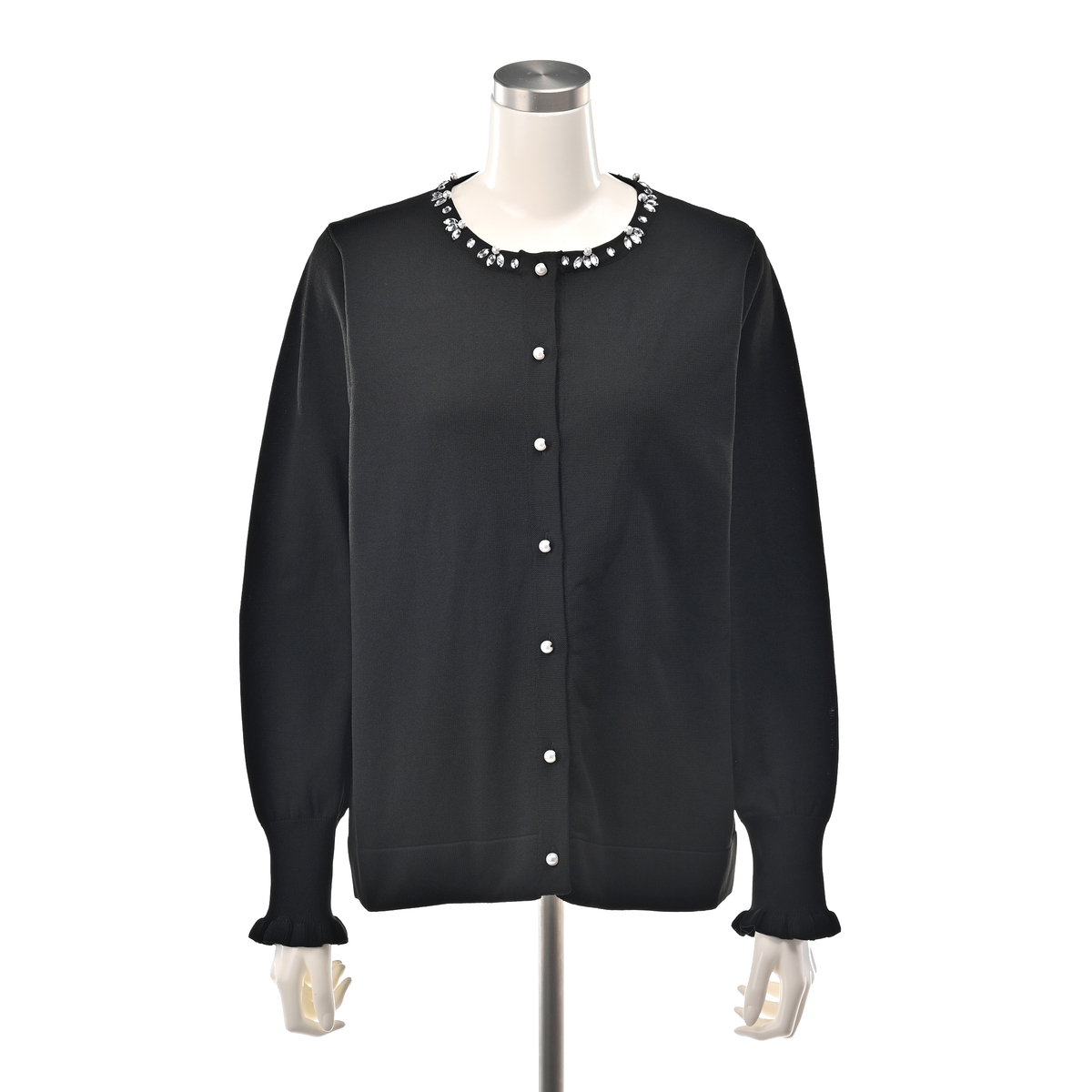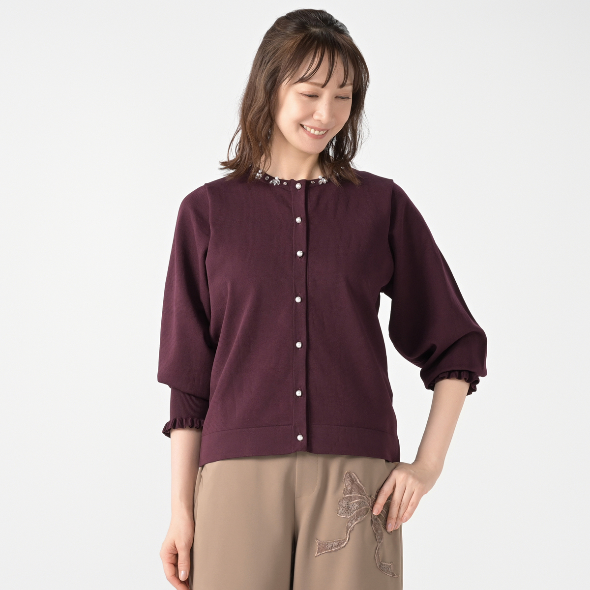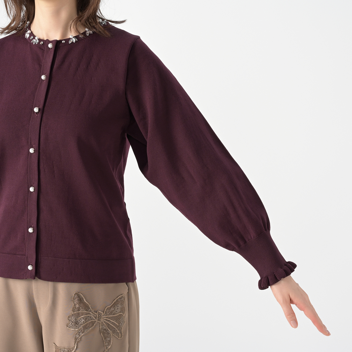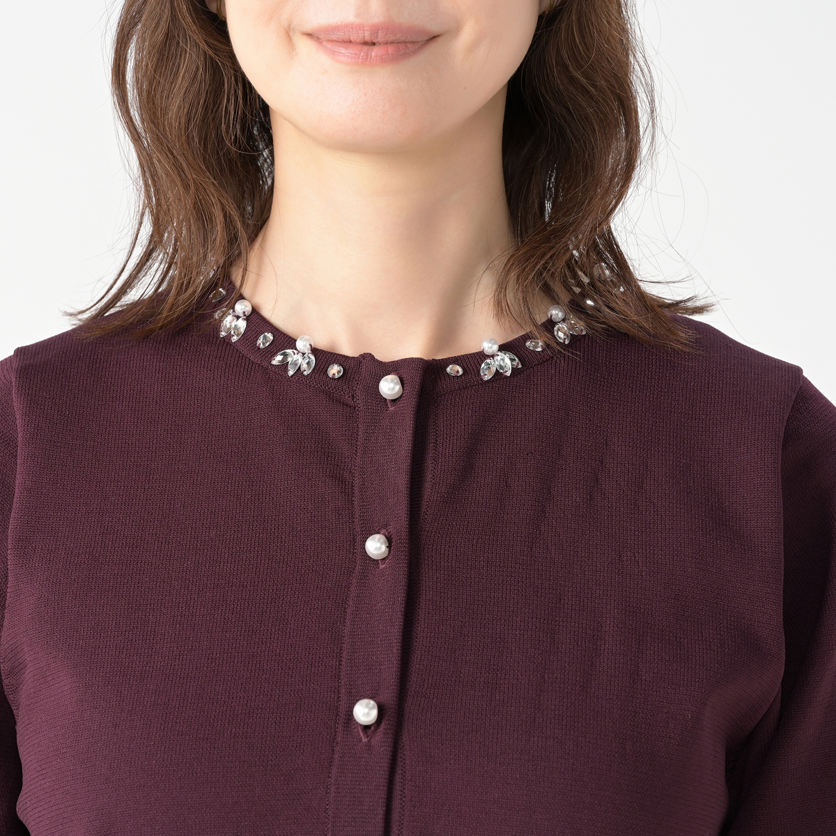キラキラ輝くクリアビジューや上品なパール調ビジューを衿元に贅沢にあしらったニットカーディガン。顔周りを華やかに演出してくれるエレガントなアイテムです