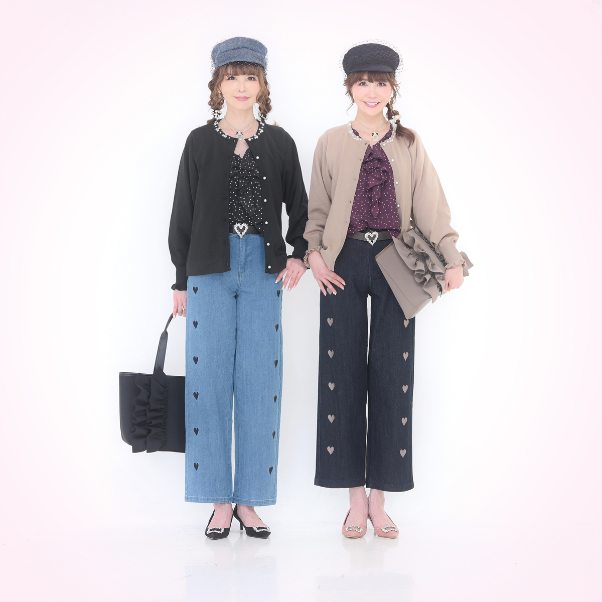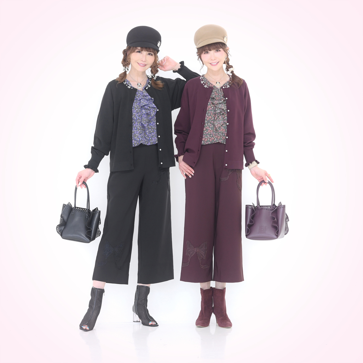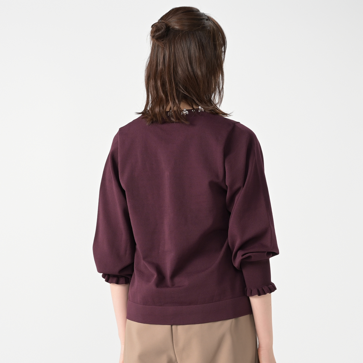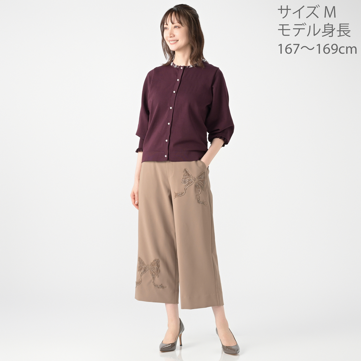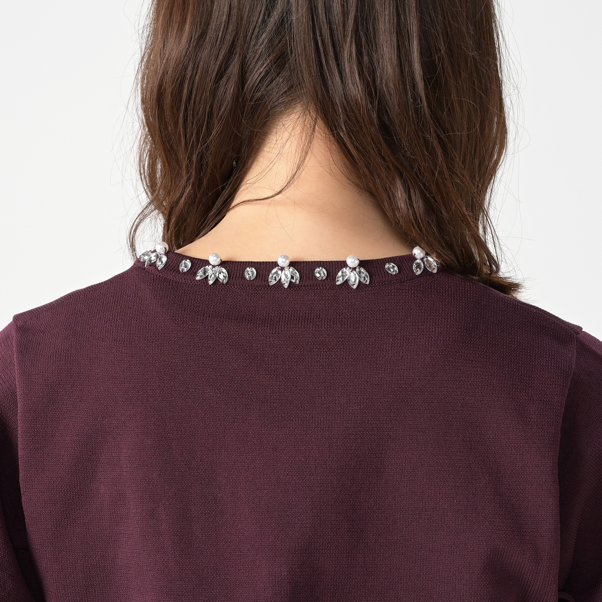 キラキラ輝くクリアビジューや上品なパール調ビジューを衿元に贅沢にあしらったニットカーディガン。顔周りを華やかに演出してくれるエレガントなアイテムです