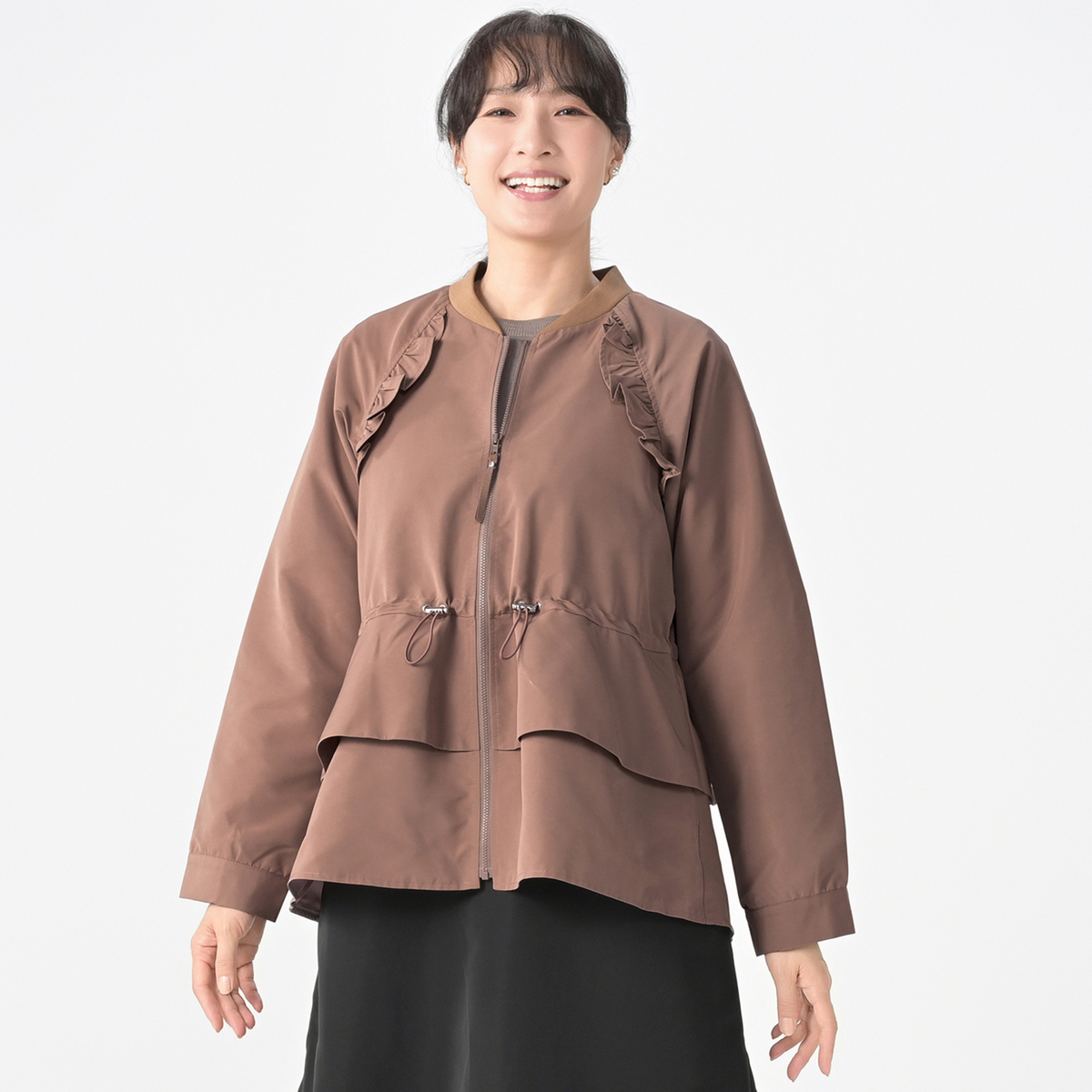 ペプラムシルエットが魅力の大人可愛いブルゾン。アーム部分にはフリルをあしらい、フェミニンなアクセントに。胸下の切り替えにはストッパー付きの丸ゴムを通し、シルエットの調整が可能です。後ろ身頃は少し長めの丈でヒップまわりもカバーできます