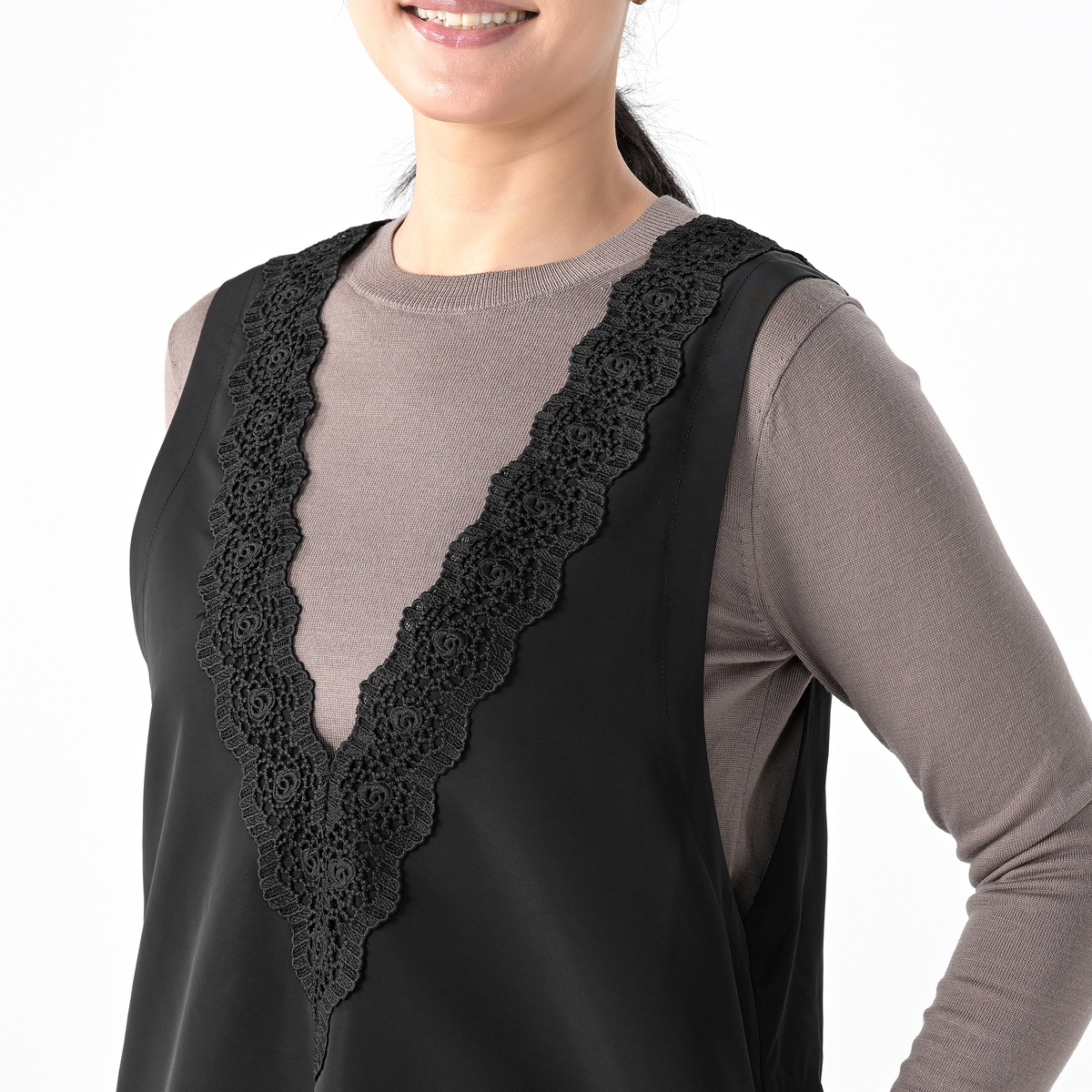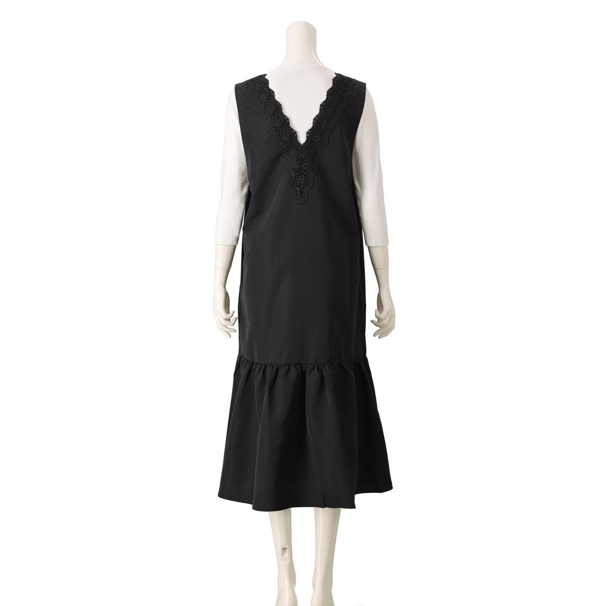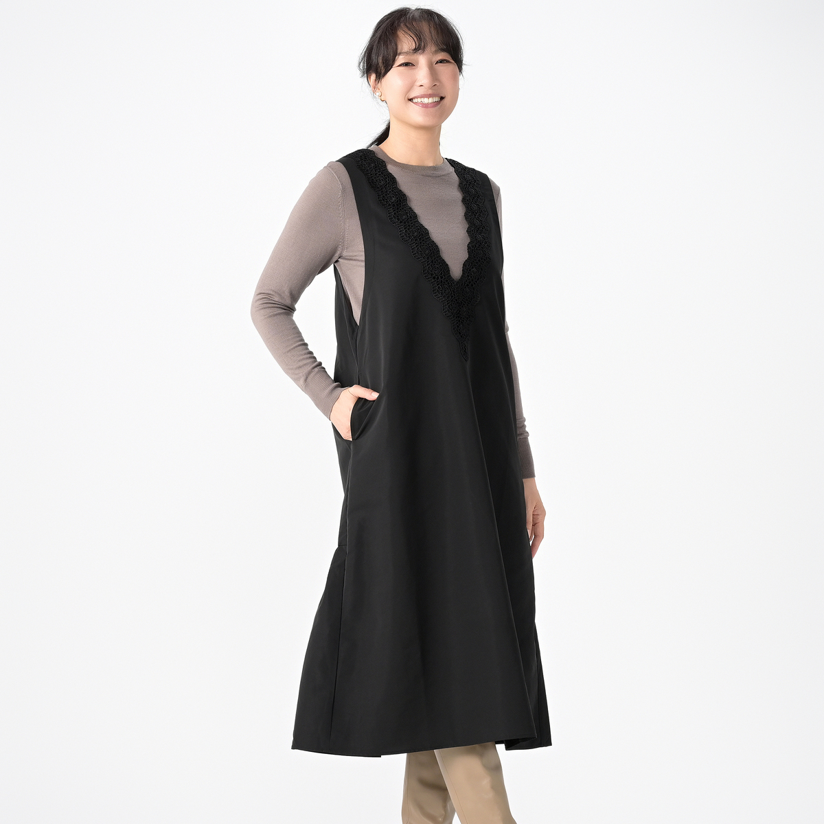 胸元に太めスカラップレースをあしらった華やかで上品なジャンスカ。深めのVネックと少し広めの肩幅がきちんと感のある仕上がり。すとんと裾に向かって自然に落ちる広がりを抑えたAラインシルエットで、年齢問わず品良く着用していただけます
