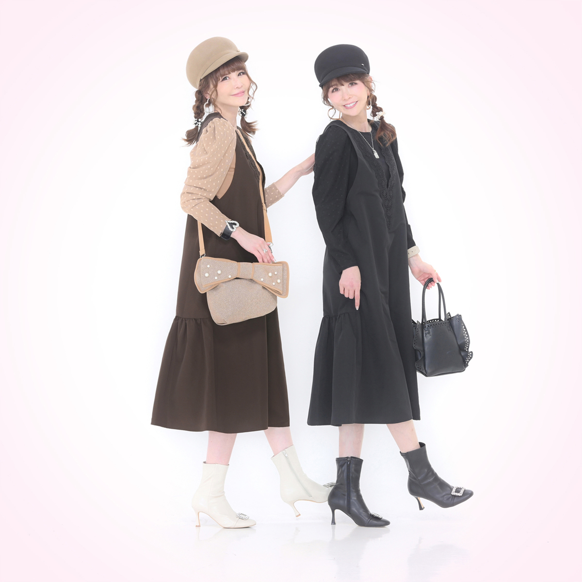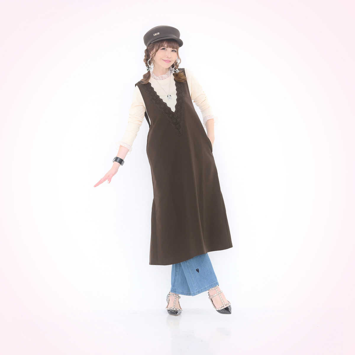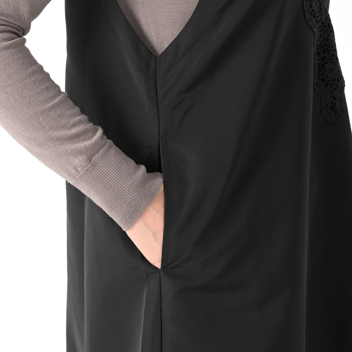 胸元に太めスカラップレースをあしらった華やかで上品なジャンスカ。深めのVネックと少し広めの肩幅がきちんと感のある仕上がり。すとんと裾に向かって自然に落ちる広がりを抑えたAラインシルエットで、年齢問わず品良く着用していただけます