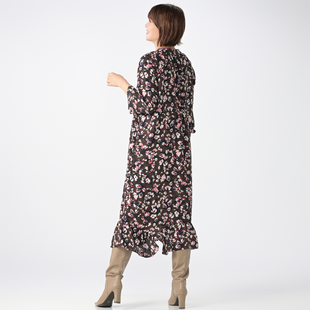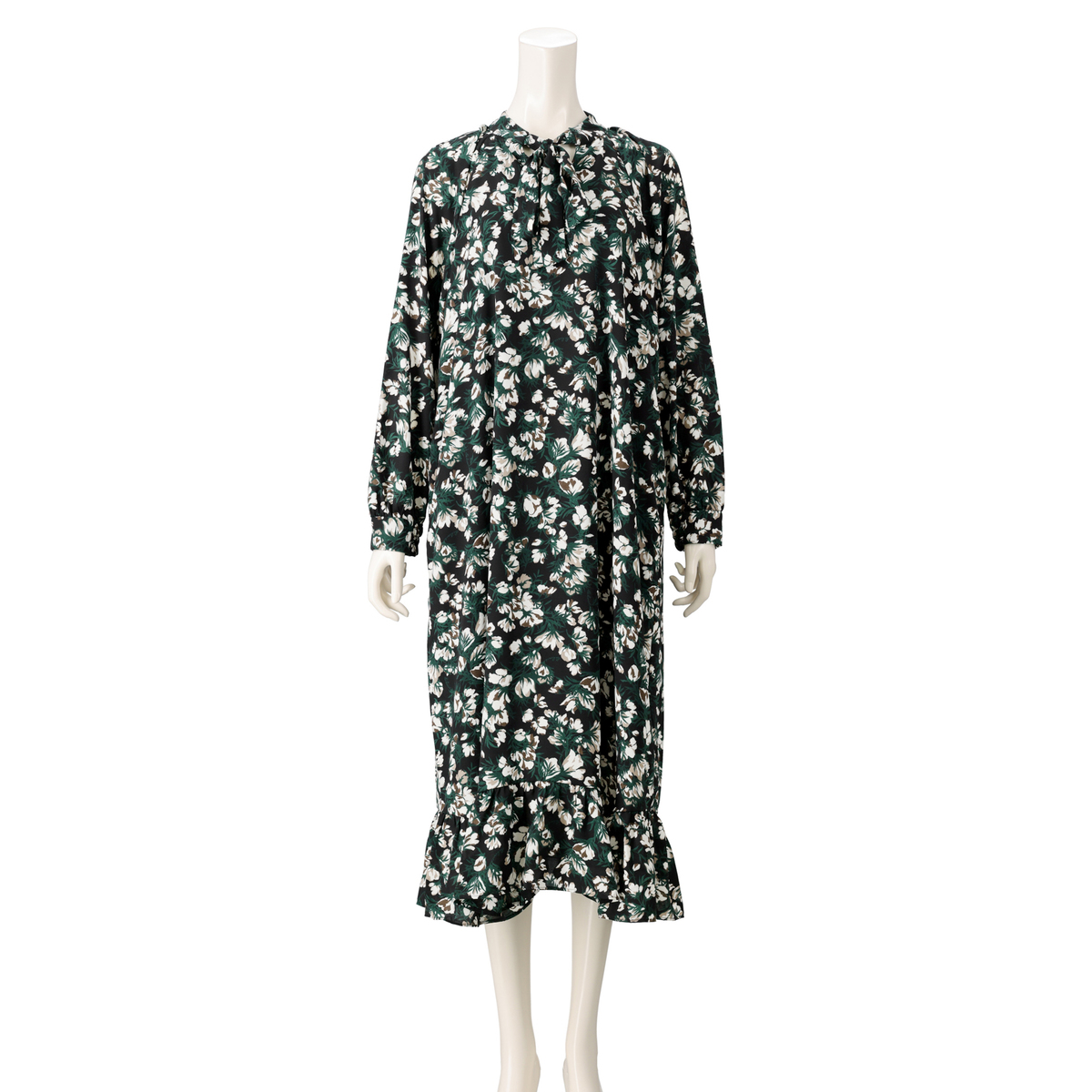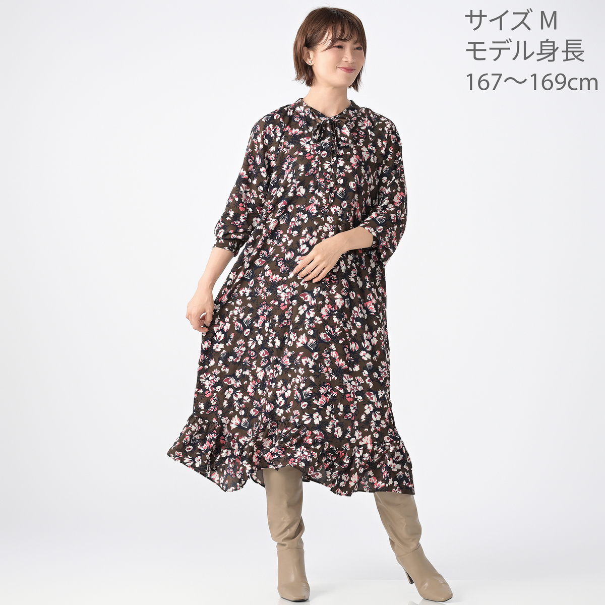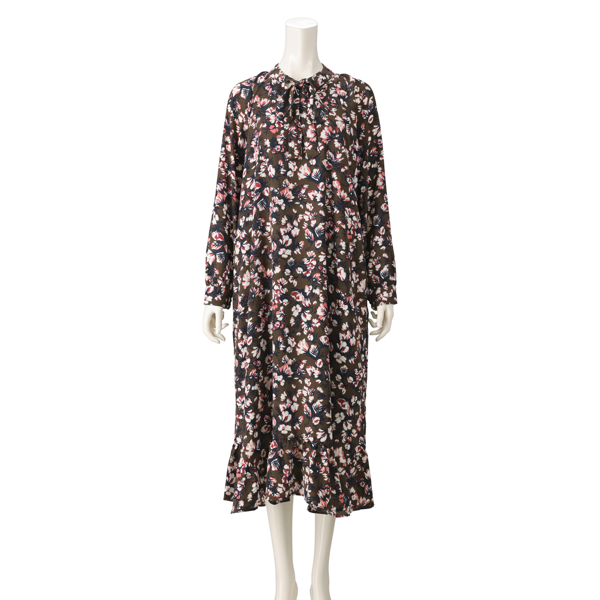 こっくりとした色合いのフラワー柄をプリントしたワンピース。花びらの中に隠れハートをふんだんに散りばめ、柄に馴染ませた&LOVEのロゴはさり気ないポイントに*。裾の切替え部分が動くたびに揺れ、体のラインを拾いにくくすっきりとラフに着こなせるAラインシルエットです