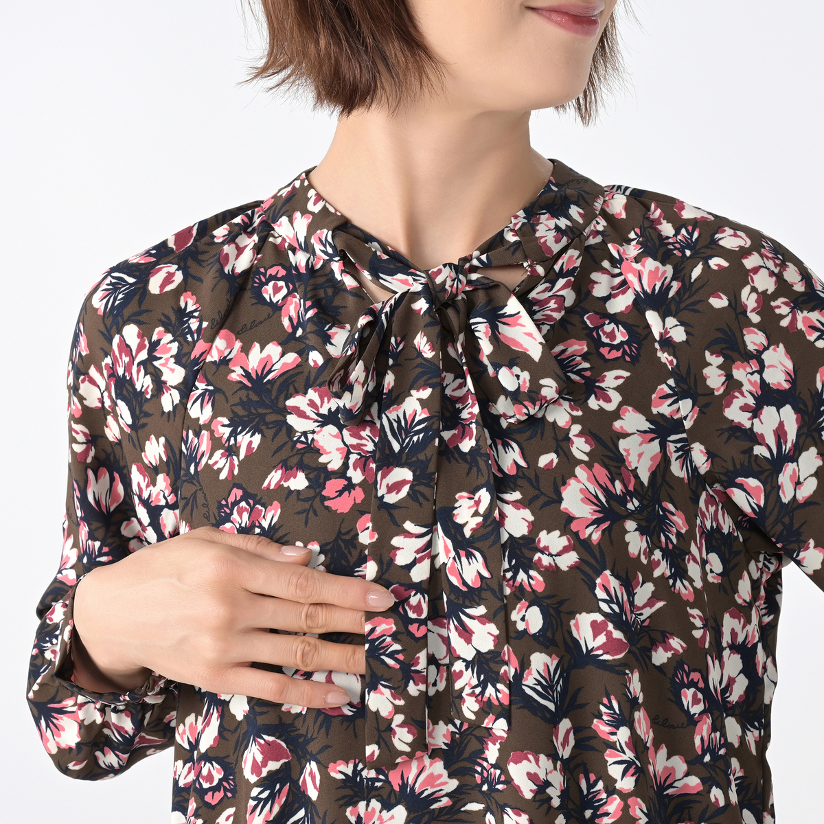 ボウタイが顔まわりを華やかに映し、V開き部分をリボンが覆うので、下着が見える心配もありません。ラグラン切替えの袖はゆったりとしたドレープ感が上品で、程よいパフ感が柔らかい印象に。両脇にはポケット付きです