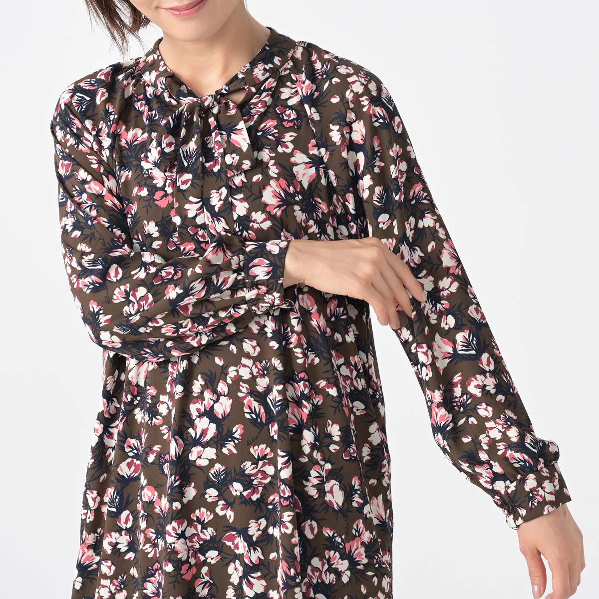 表地はさらりとした肌触りが特徴のジョーゼット素材を使用。細かいシボ感が優しい印象を与え、程よい落ち感が上質な雰囲気を演出。裏地は織りによるナチュラルなストレッチ感のあるタフタ素材で、しなやかな着心地です