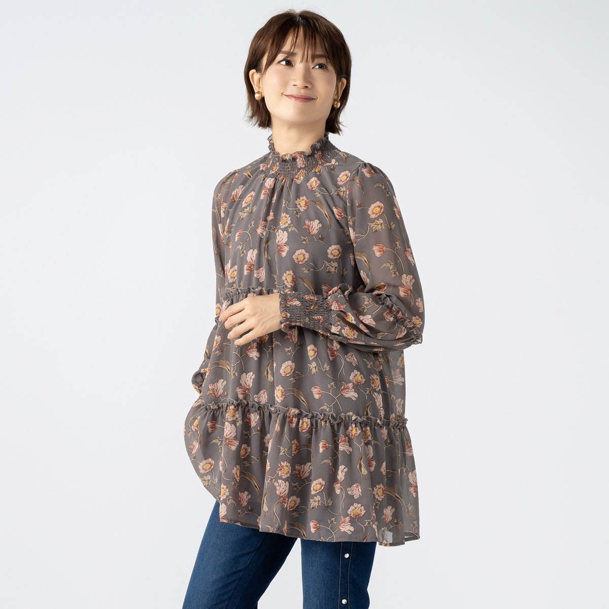 シフォン素材のティアードチュニック。軽くて柔らかく、繊細な透け感がある素材で、身頃には裏地が付いています。衿まわりと袖口まわりをシャーリングギャザーで絞ったガーリーなデザインで、フラワー柄がコーデを華やかに演出します