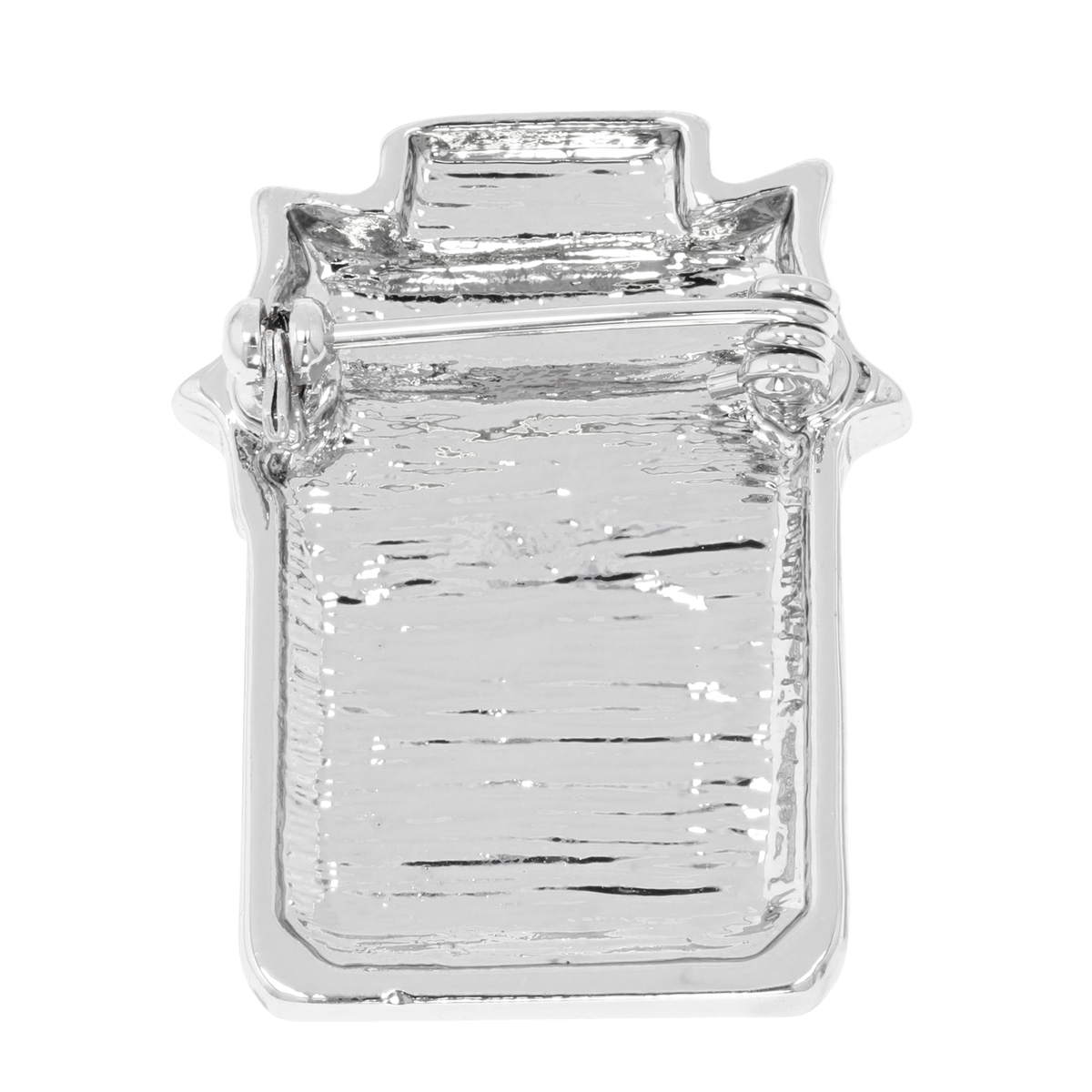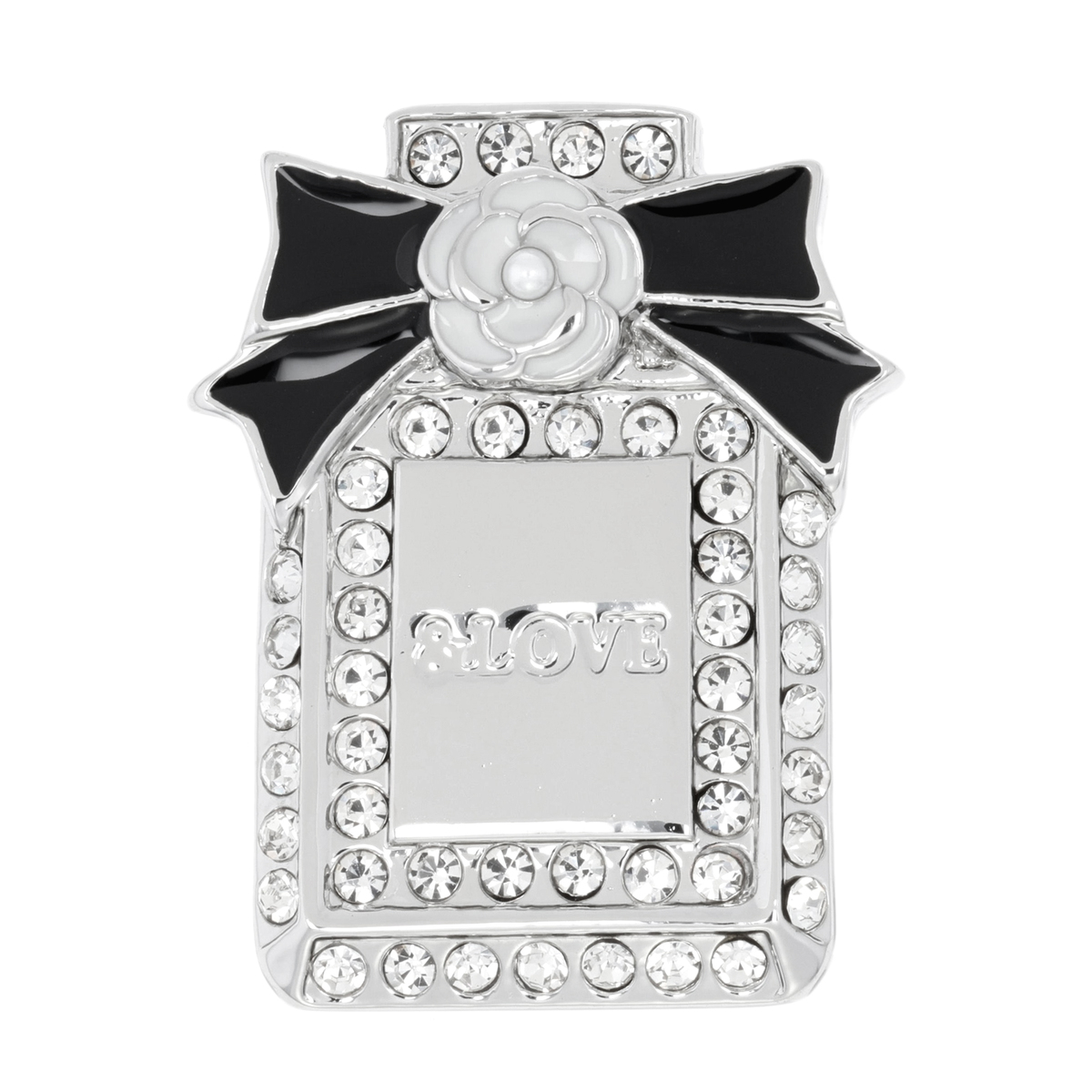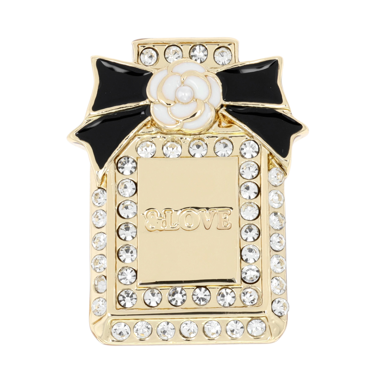 香水瓶をモチーフにしたブローチ。カメリアリボンが大人の華やかさを演出し、繊細なラインストーンが上品なきらめきを添えます