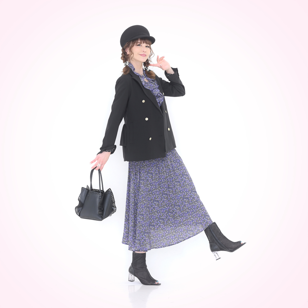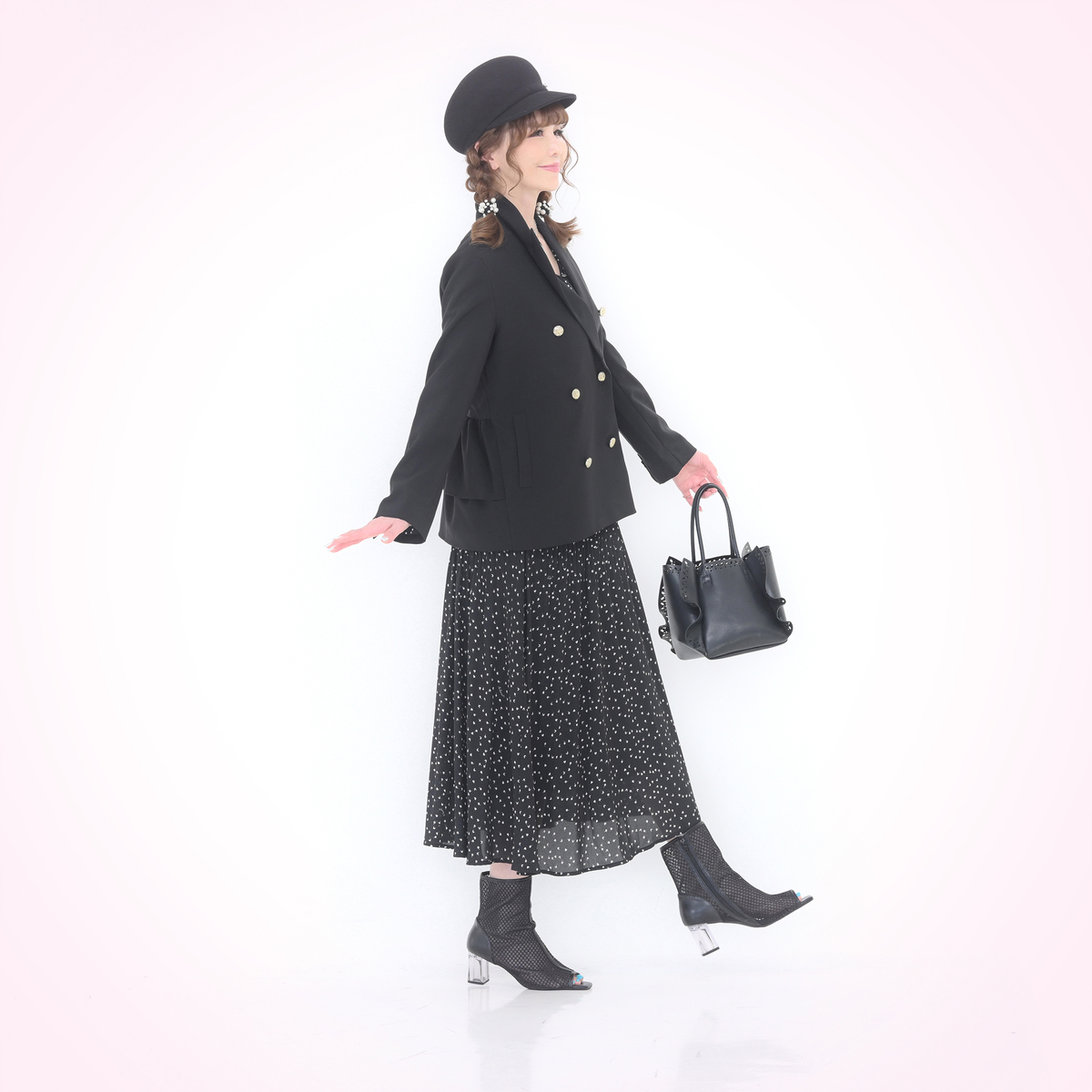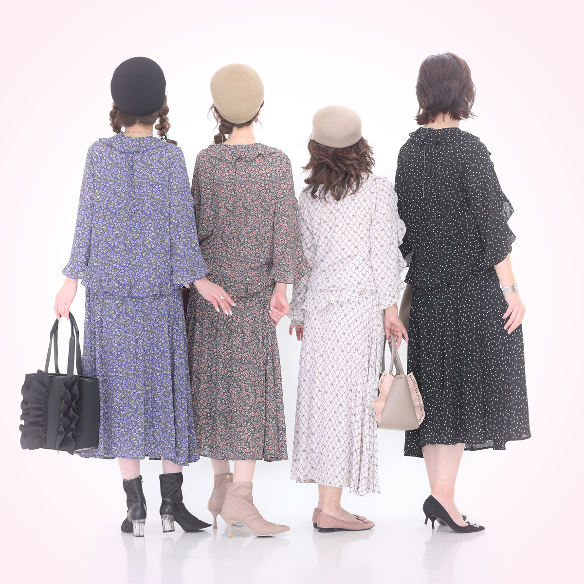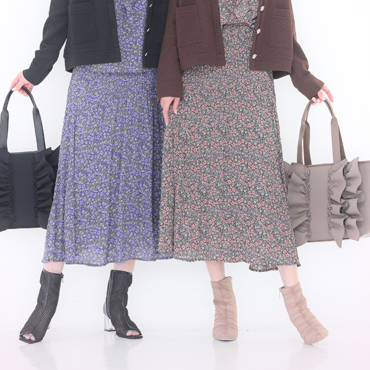 軽やかなシフォンジョーゼット素材をたっぷり使い、ミドルヒップあたりまでのプリーツで細見えを意識したフレアシルエットのスカートです。動きに合わせて美しく揺れるドレープが、毎日の装いを一層華やかに演出します