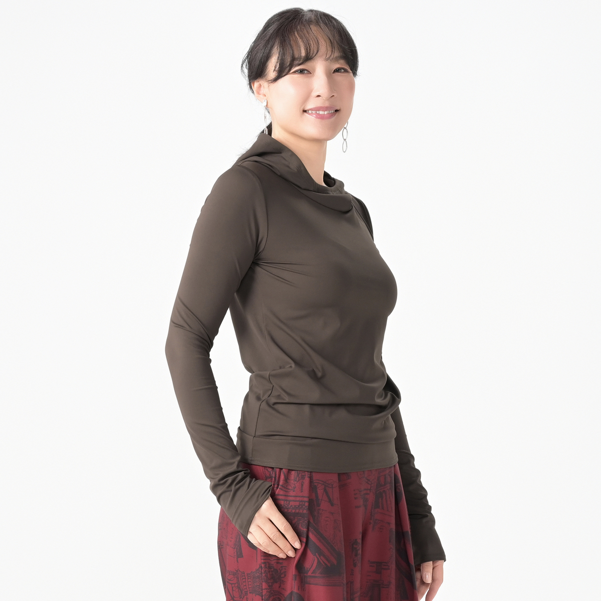 ブラウンMサイズ頂きました。ピタッとしてしまうかもと心配しましたが、ジャストサイズでシルエットが気に入りました。66歳ですがフードが付いているのが大好きです。以前はハイネックの同じ生地のを頂きましたが、ハイネックが着こなせなくて返品させて頂きました。今回は気に入りました。追加でブラックも考えています。