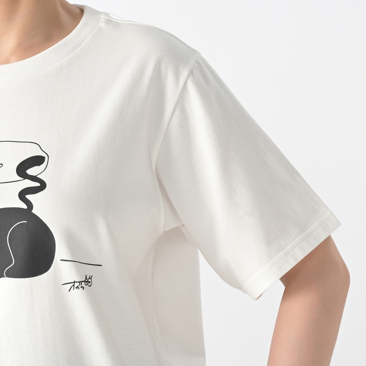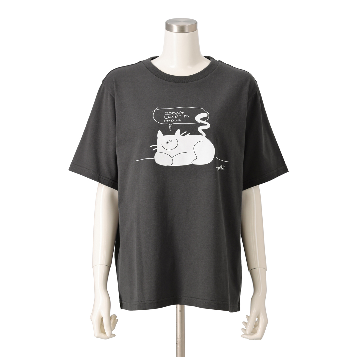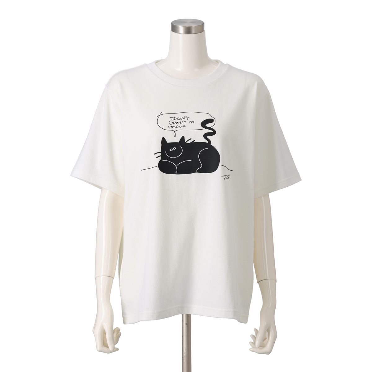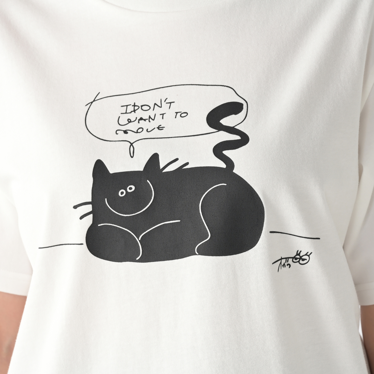 誰にでもある「動きたくない!何もしたくない!」という気持ちを、ニッコリとどっしりとくつろぐ猫の姿に重ねて表現。「そんな日があってもいいんだよ」と少し気持ちを肯定してくれるようなイメージで描かれた、イラストレーターのオガワナツミさんの作品プリントTEEです