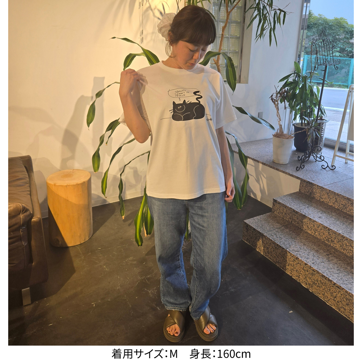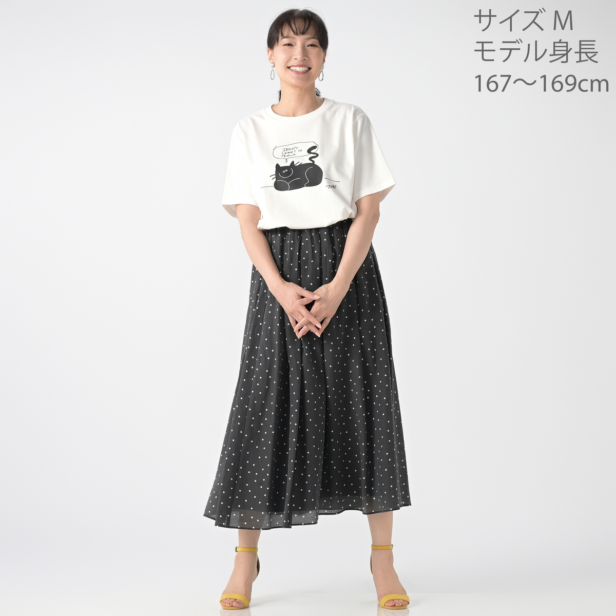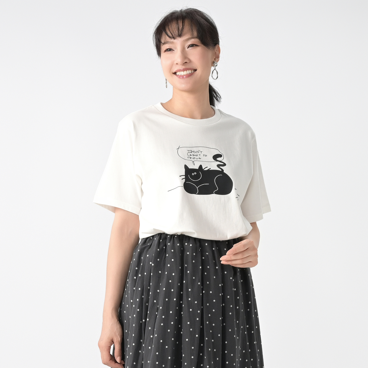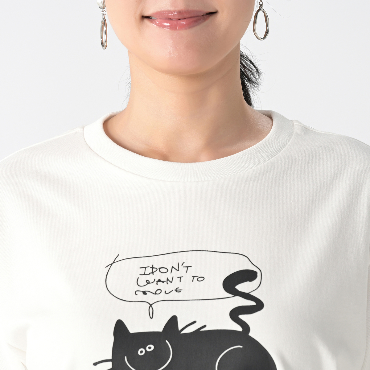 誰にでもある「動きたくない!何もしたくない!」という気持ちを、ニッコリとどっしりとくつろぐ猫の姿に重ねて表現。「そんな日があってもいいんだよ」と少し気持ちを肯定してくれるようなイメージで描かれた、イラストレーターのオガワナツミさんの作品プリントTEEです