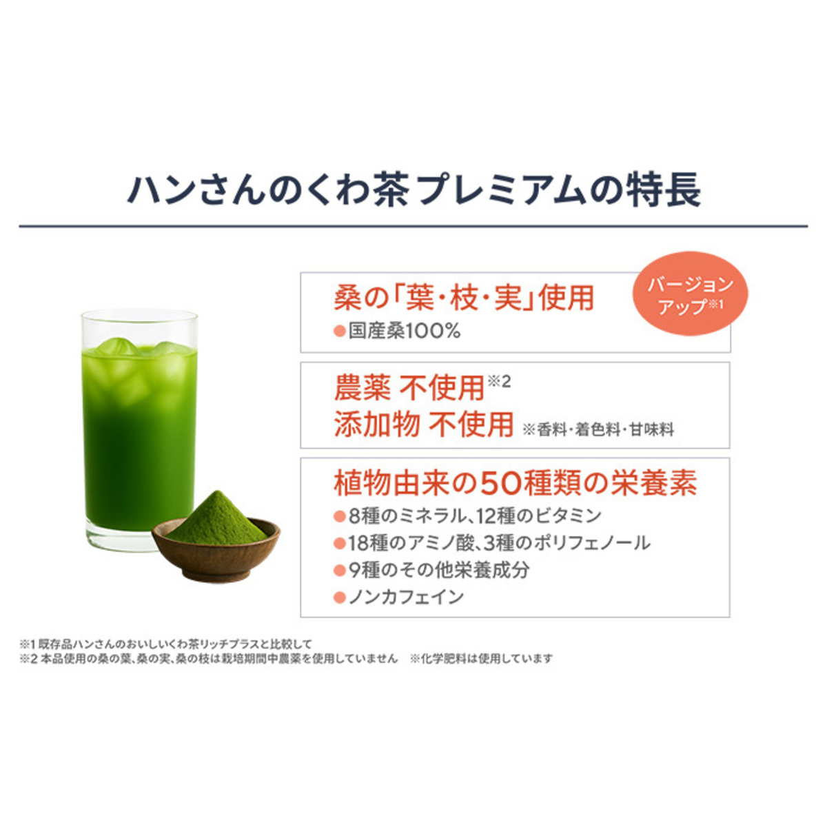 国産桑葉、国産桑の実、国産桑の枝を使用したくわ茶。パウダー状で溶けやすい、お水、お湯、牛乳等に混ぜて飲むタイプです。茶がらが出ないので手間いらずで、ノンカフェイン*なのでいつでも気軽にお召し上がりいただけます。本品使用の桑の葉、桑の実、桑の枝は、栽培期間中に農薬を使用していません(化学肥料は使用しています)