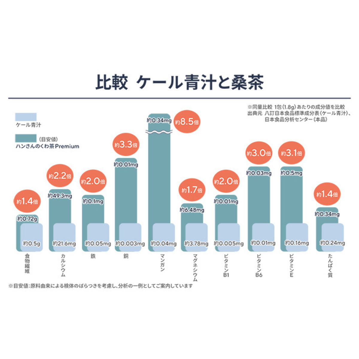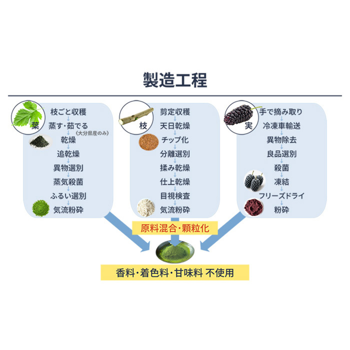 [アレルギー物質特定原材料8品目] なし [目安量] 1日1〜2包 [保存方法] 高温多湿、直射日光を避けて保存してください [栄養成分表示] (1包1.8g)あたり エネルギー 5.1kcal たんぱく質 0.34g 脂質 0.1g 炭水化物 1.05g ー糖質 0.32g ー食物繊維 0.72g 食塩相当量 0g カルシウム 49.3mg 鉄 0.1mg カフェイン 0g ポリフェノール 30mg r-アミノ酪酸 0.14mg ※この表示値は、目安です [お召し上がり方] コップに水またはお湯150ml〜180mlを入れ、本品1包(1.8g)を加え、かき混ぜ溶かしてからお召し上がりください [注意事項] ※体質・体調によってまれに合わない場合がございます。その場合は使用を中止してください ※天産物原料を使用しておりますので、色にばらつきが生じる場合がありますが品質に問題ありません ※健康を気づかう方へ お食事を食べながら飲むことをお薦めします [原料原産地] 桑葉粉末(桑葉(国産))、桑枝粉末(桑枝(国産))、桑の実粉末(デキストリン、桑の実(国産)) [原産国] 日本 [原材料] 桑葉粉末(桑葉(国産))、デキストリン、桑枝粉末(桑枝(国産))、桑の実粉末(デキストリン、桑の実(国産))