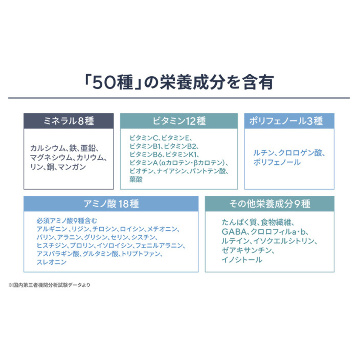 香料、着色料、甘味料不使用。食物繊維、ミネラル(カルシウム、鉄、亜鉛、マグネシウム、カリウム、銅、マンガン)やビタミン(VB1、VB6、VC、VE、VK、葉酸)やポリフェノール(ポリフェノール、ルチン、クロロゲン酸、イソクエルシトルリン)の栄養成分を含有しています*