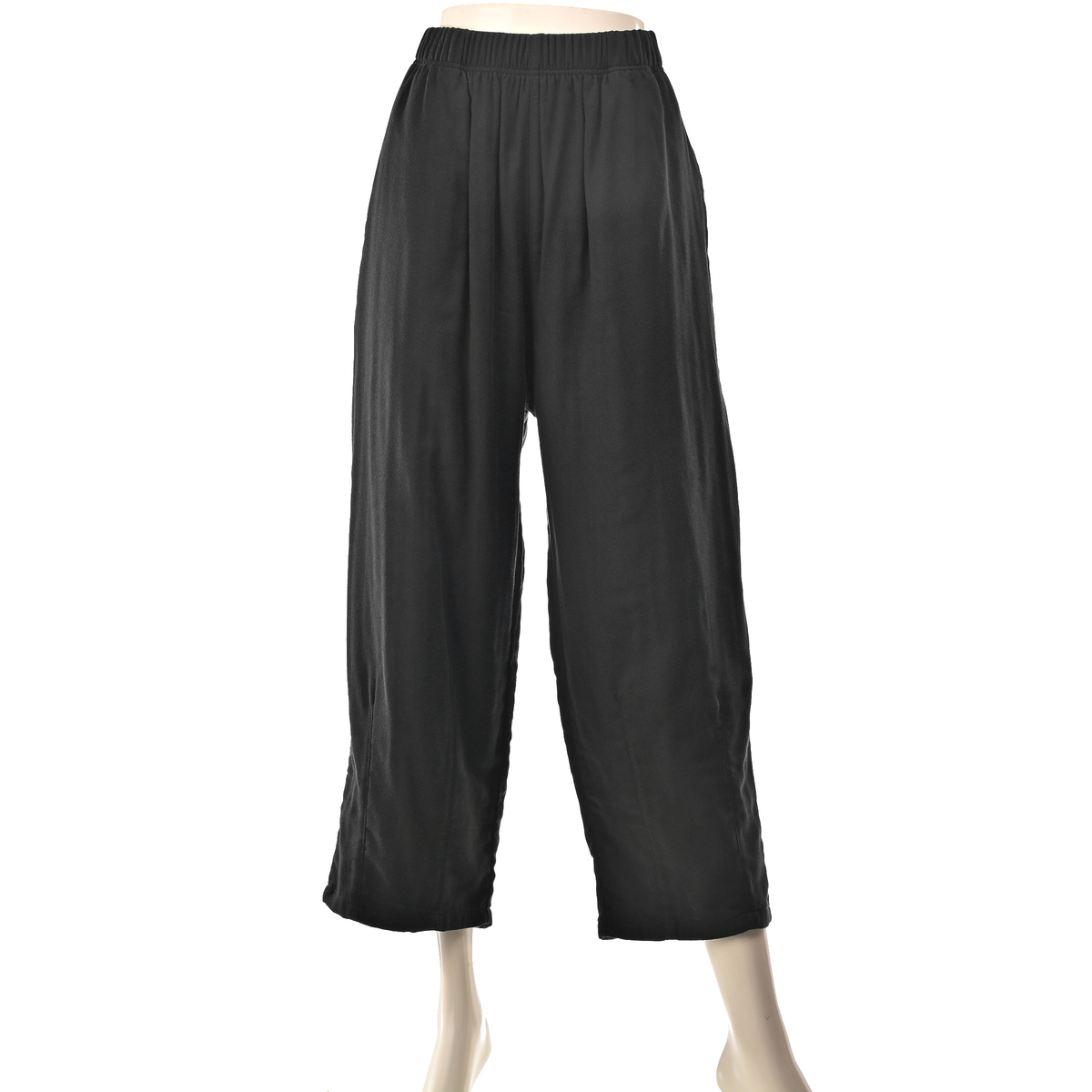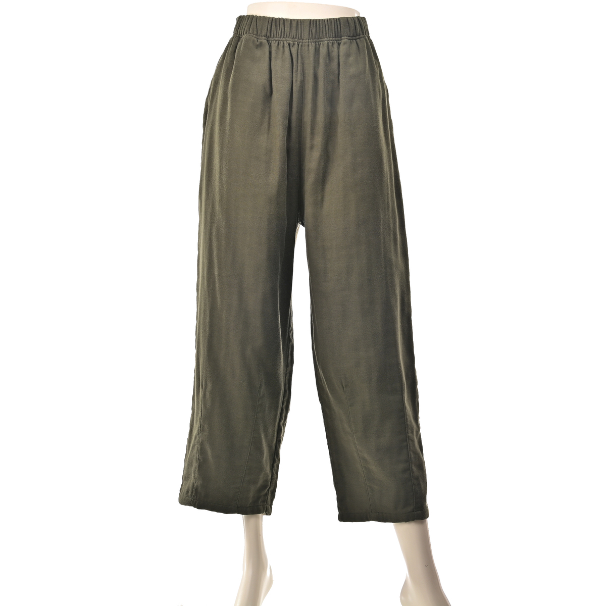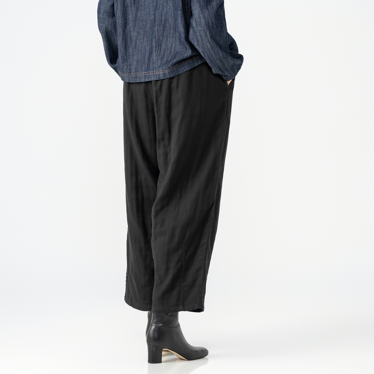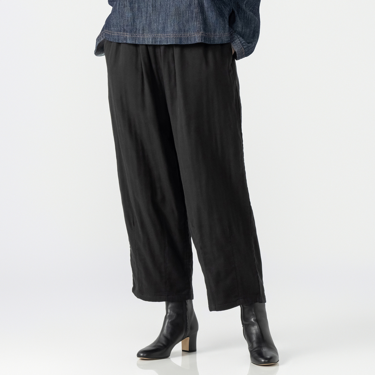 ウエストは総ゴム仕様で着脱がラクラク、リラックス感のあるコクーンパンツです。裾にかけてボリュームを持たせたバルーンシルエットで、片足前後2本ずつの長いダーツがつくるほんのり裾すぼまりのカーブが、足元をシャープに見せてくれます