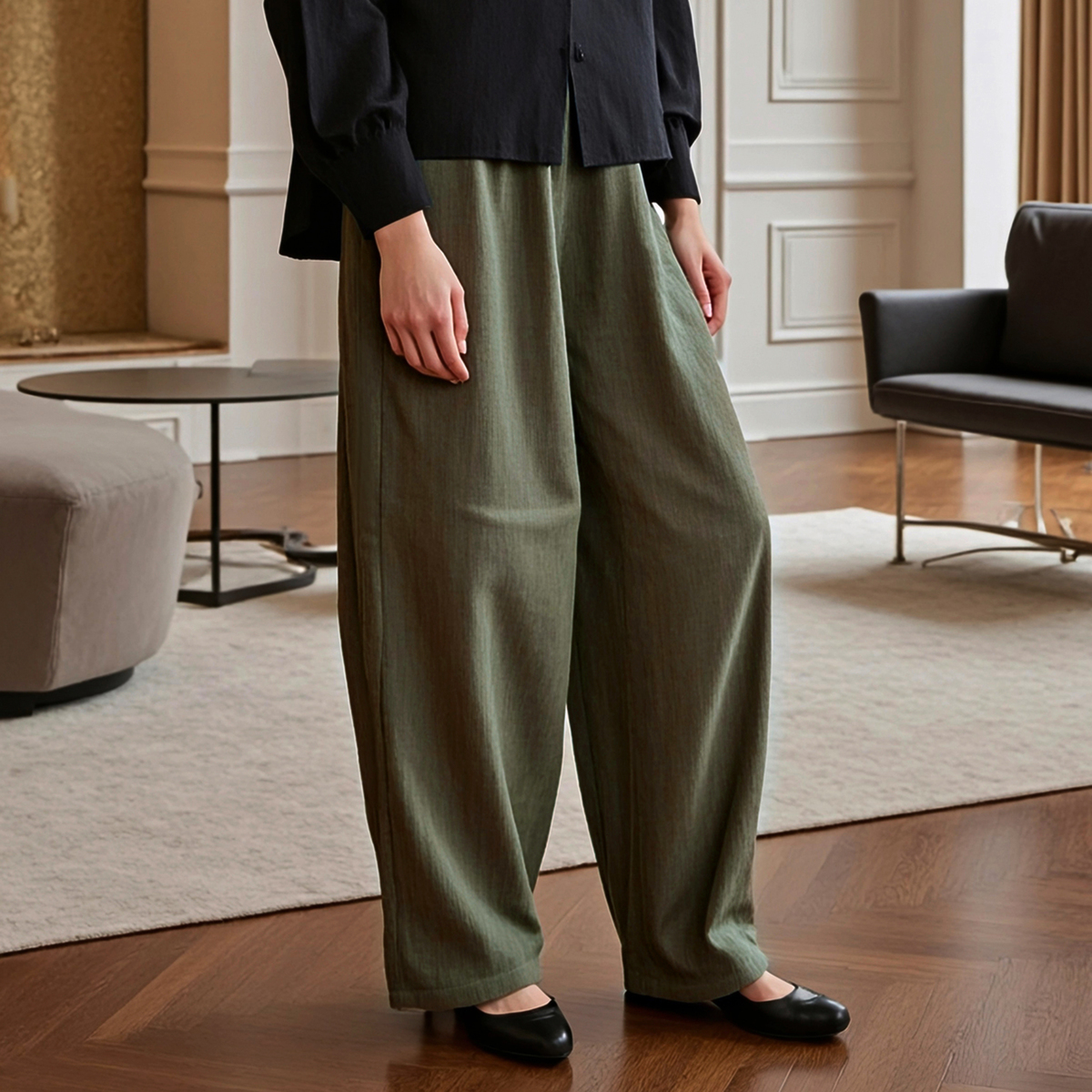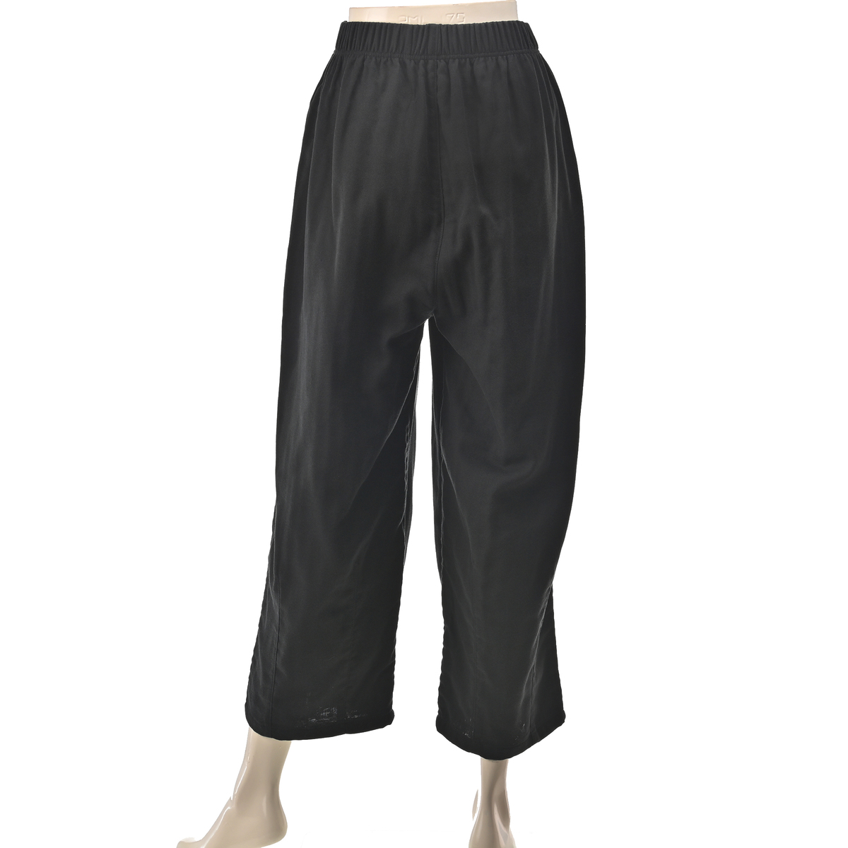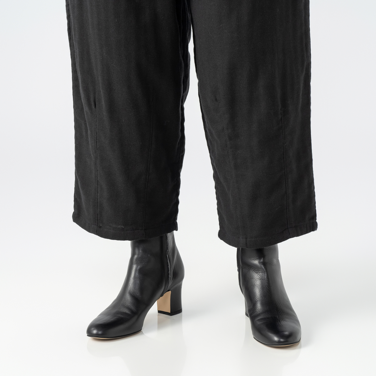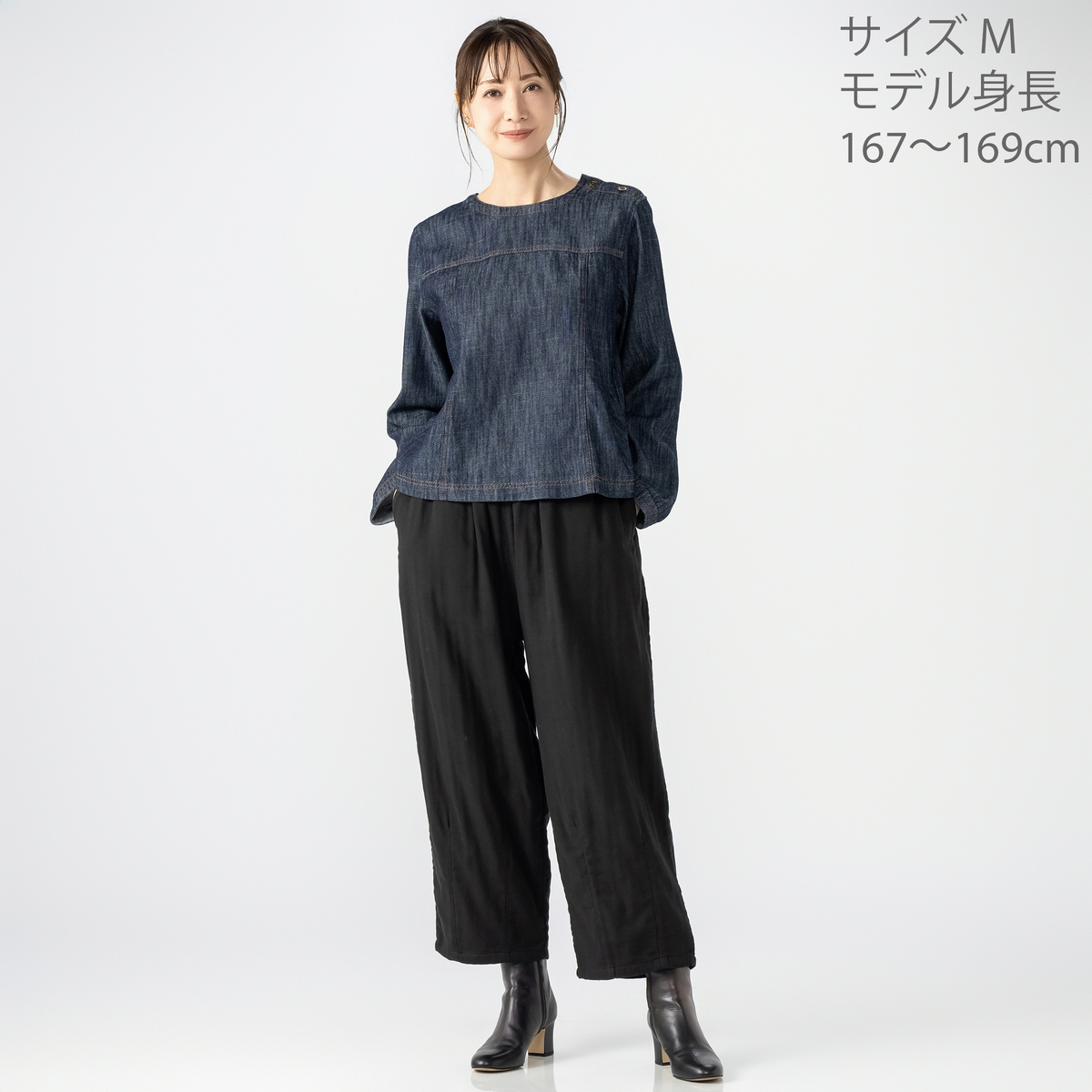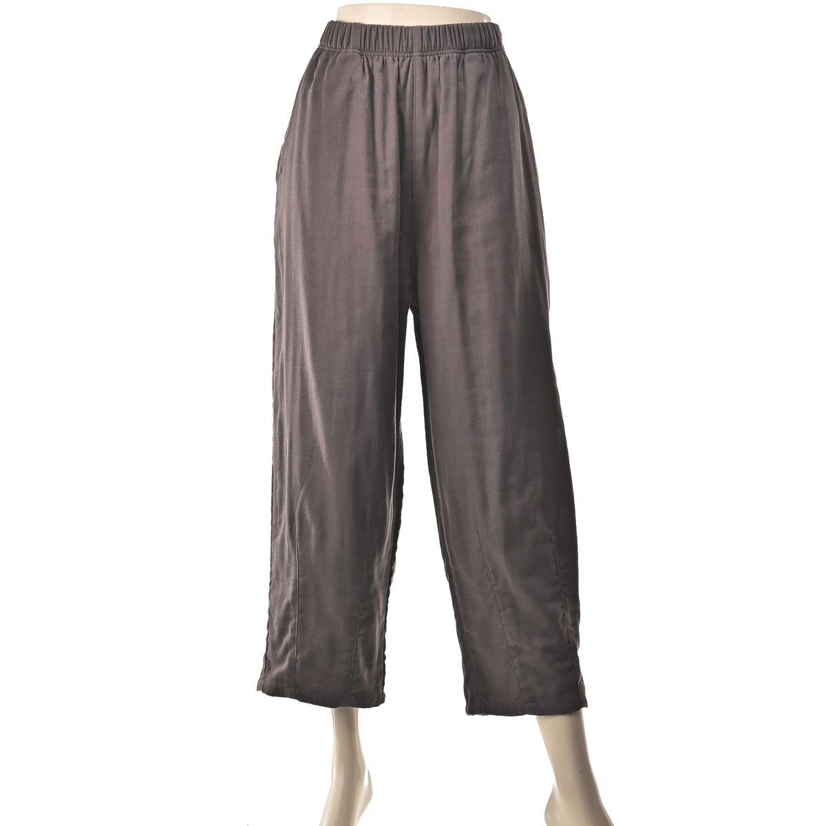 ウエストは総ゴム仕様で着脱がラクラク、リラックス感のあるコクーンパンツです。裾にかけてボリュームを持たせたバルーンシルエットで、片足前後2本ずつの長いダーツがつくるほんのり裾すぼまりのカーブが、足元をシャープに見せてくれます