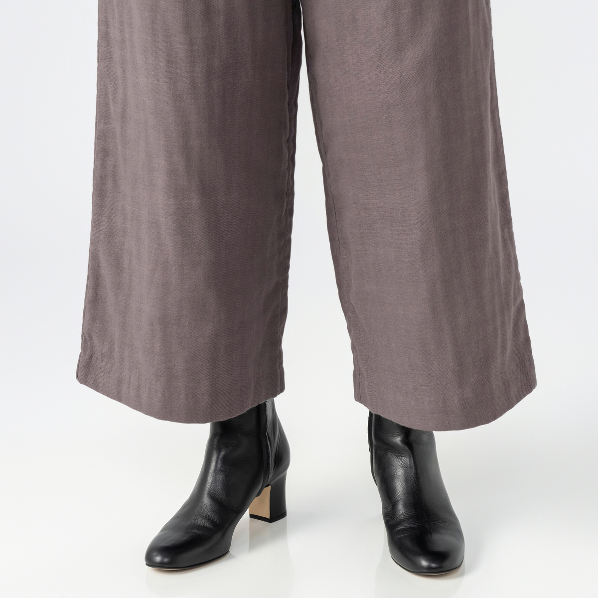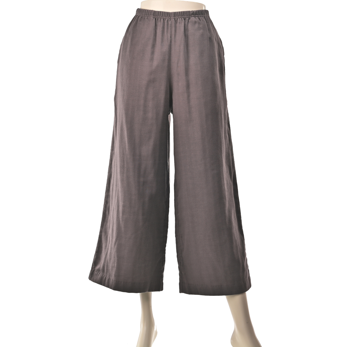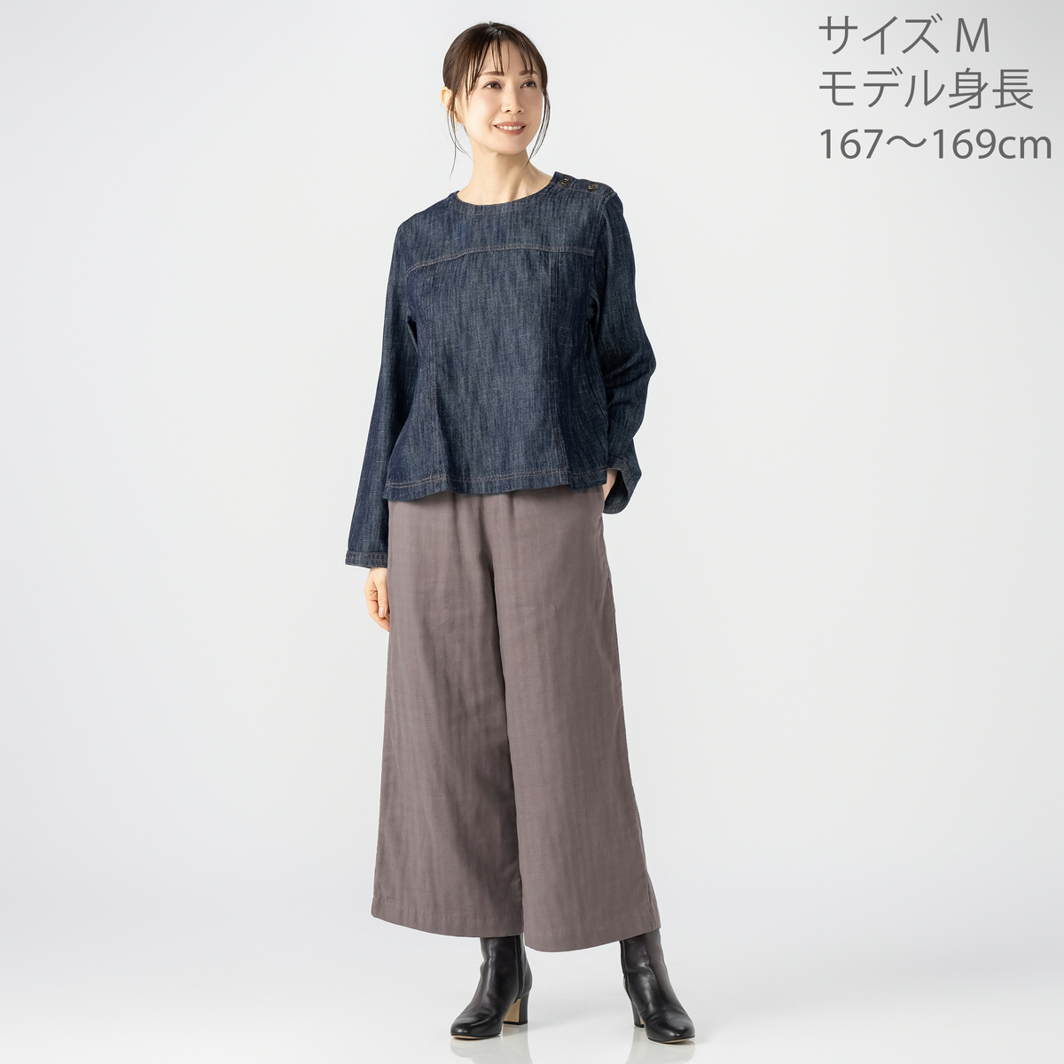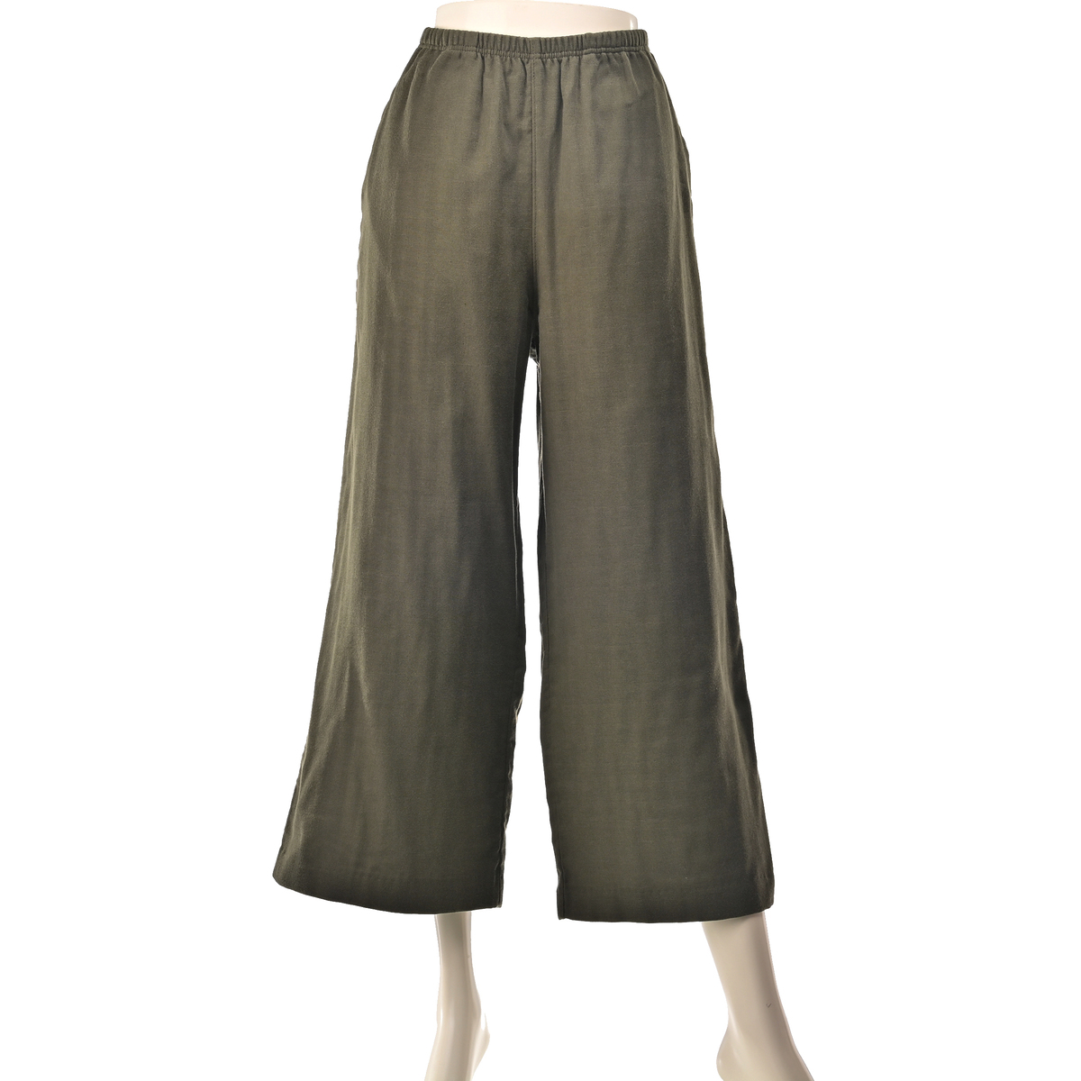 たっぷりとしたボリューム感のゆったりとしたワイドシルエット。身体のラインを拾いにくく、軽やかな抜け感に。ウエストは総ゴム仕様。たっぷりとギャザーを施したリラックス感のあるストレスフリーな穿き心地です