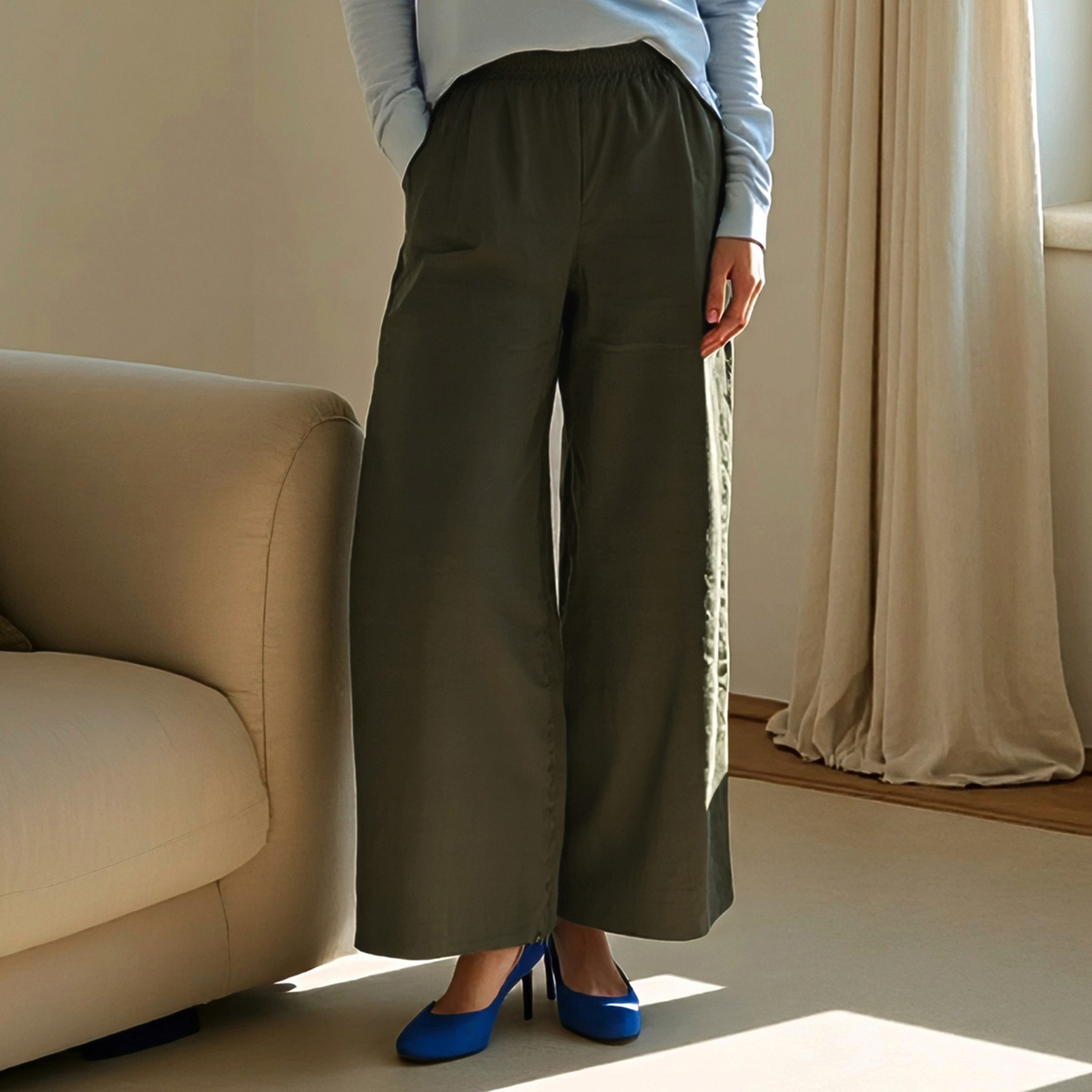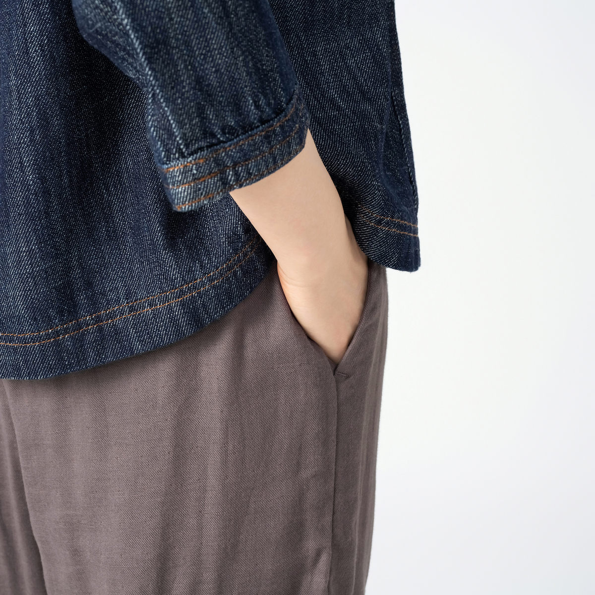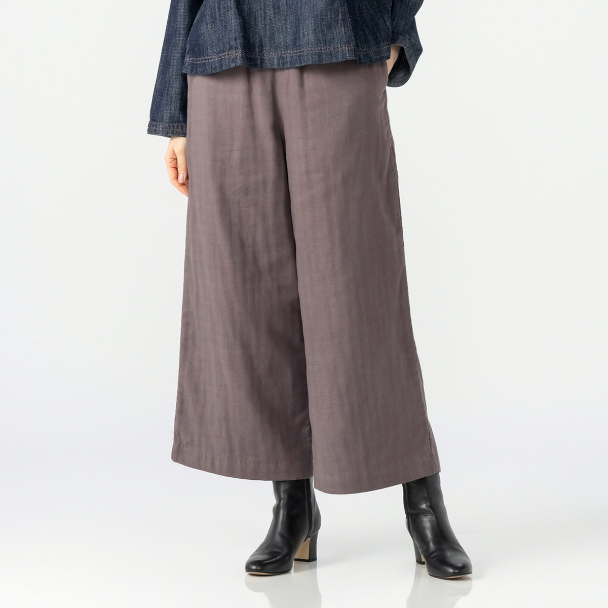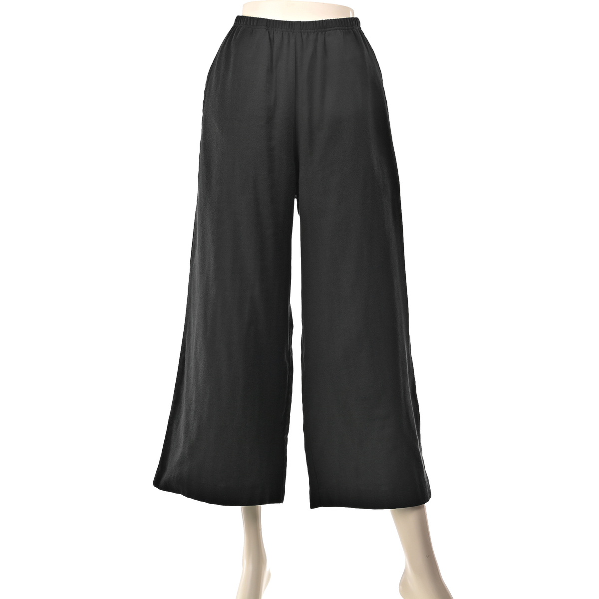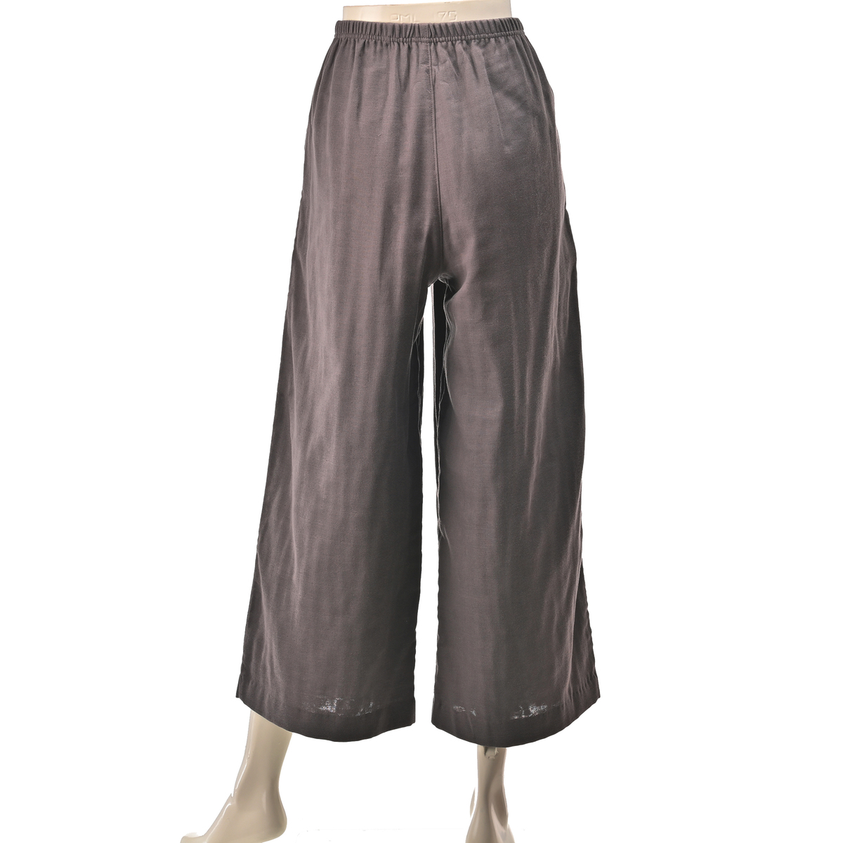 たっぷりとしたボリューム感のゆったりとしたワイドシルエット。身体のラインを拾いにくく、軽やかな抜け感に。ウエストは総ゴム仕様。たっぷりとギャザーを施したリラックス感のあるストレスフリーな穿き心地です