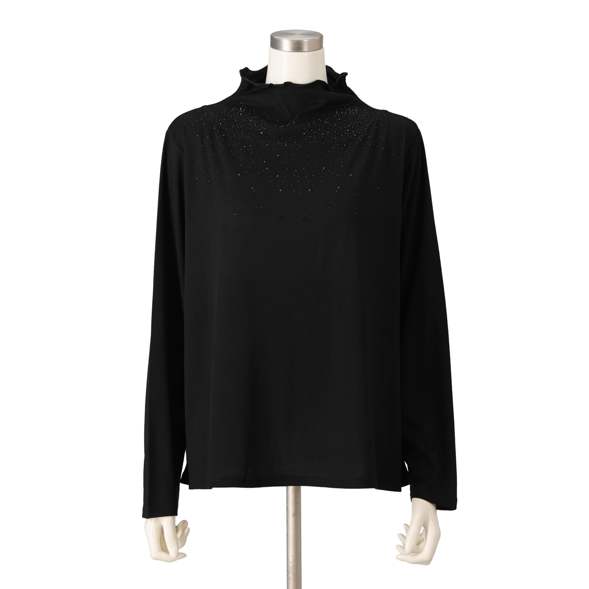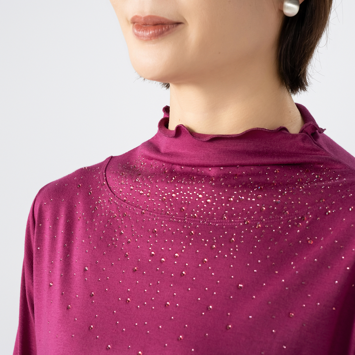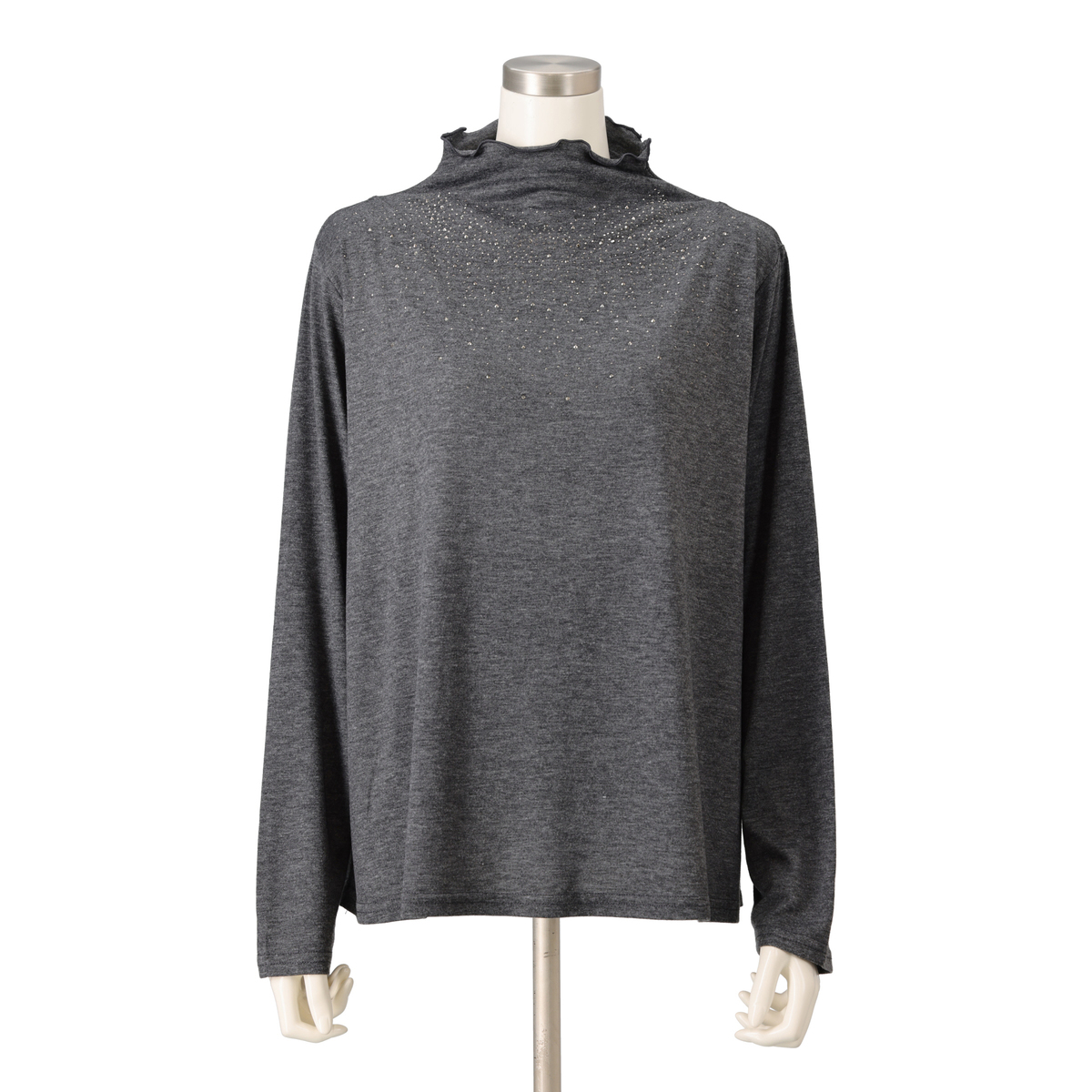 繊細なビジューを散りばめたプルオーバー。ラウンドにビジューを施した優しいラインで、ビジューの色も身頃と同系色のものをつけ、派手すぎず上品なイメージに仕上げました。ハイネックの端はメロウ始末で、お顔周りをフェミニンに彩ります