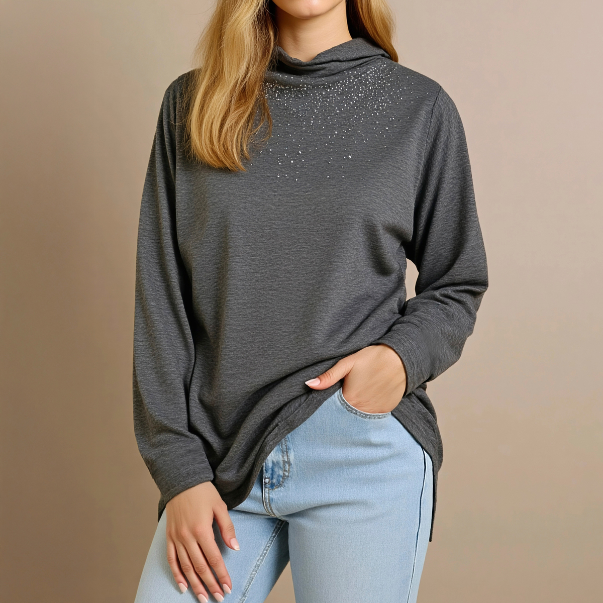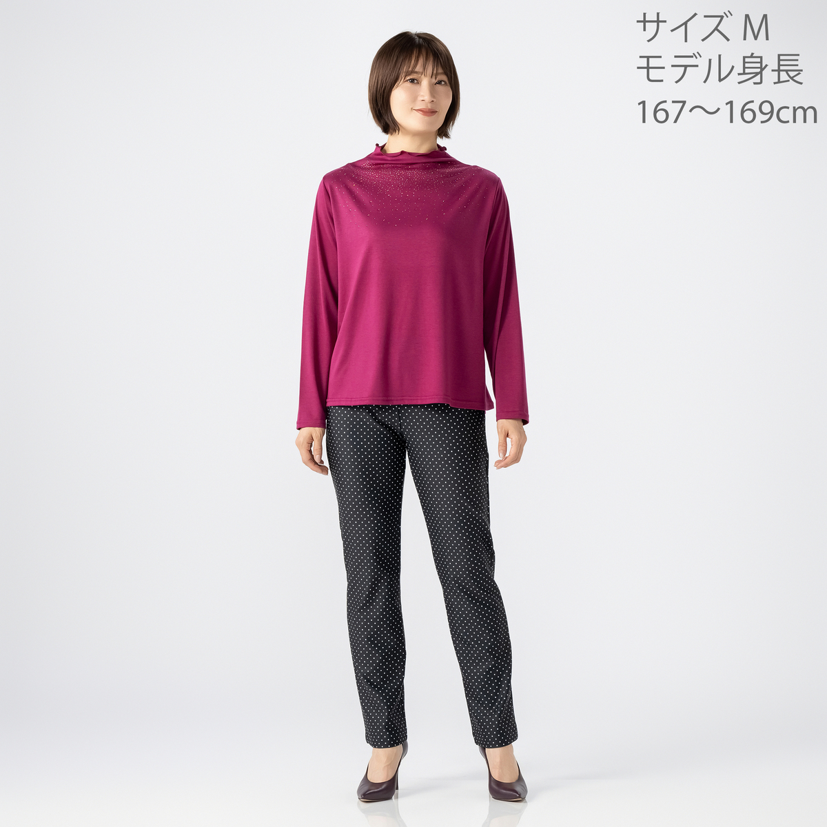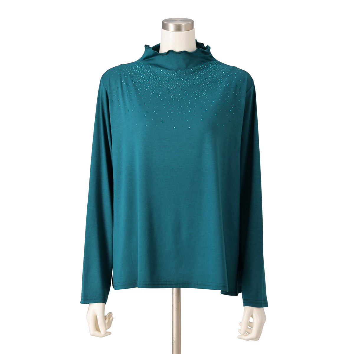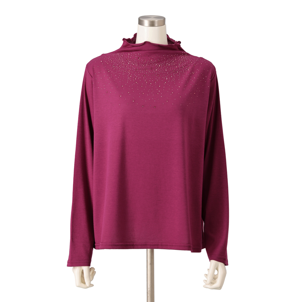 繊細なビジューを散りばめたプルオーバー。ラウンドにビジューを施した優しいラインで、ビジューの色も身頃と同系色のものをつけ、派手すぎず上品なイメージに仕上げました。ハイネックの端はメロウ始末で、お顔周りをフェミニンに彩ります