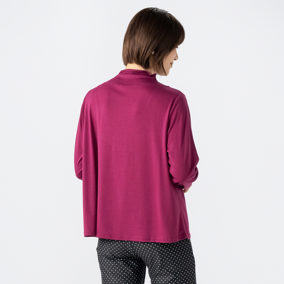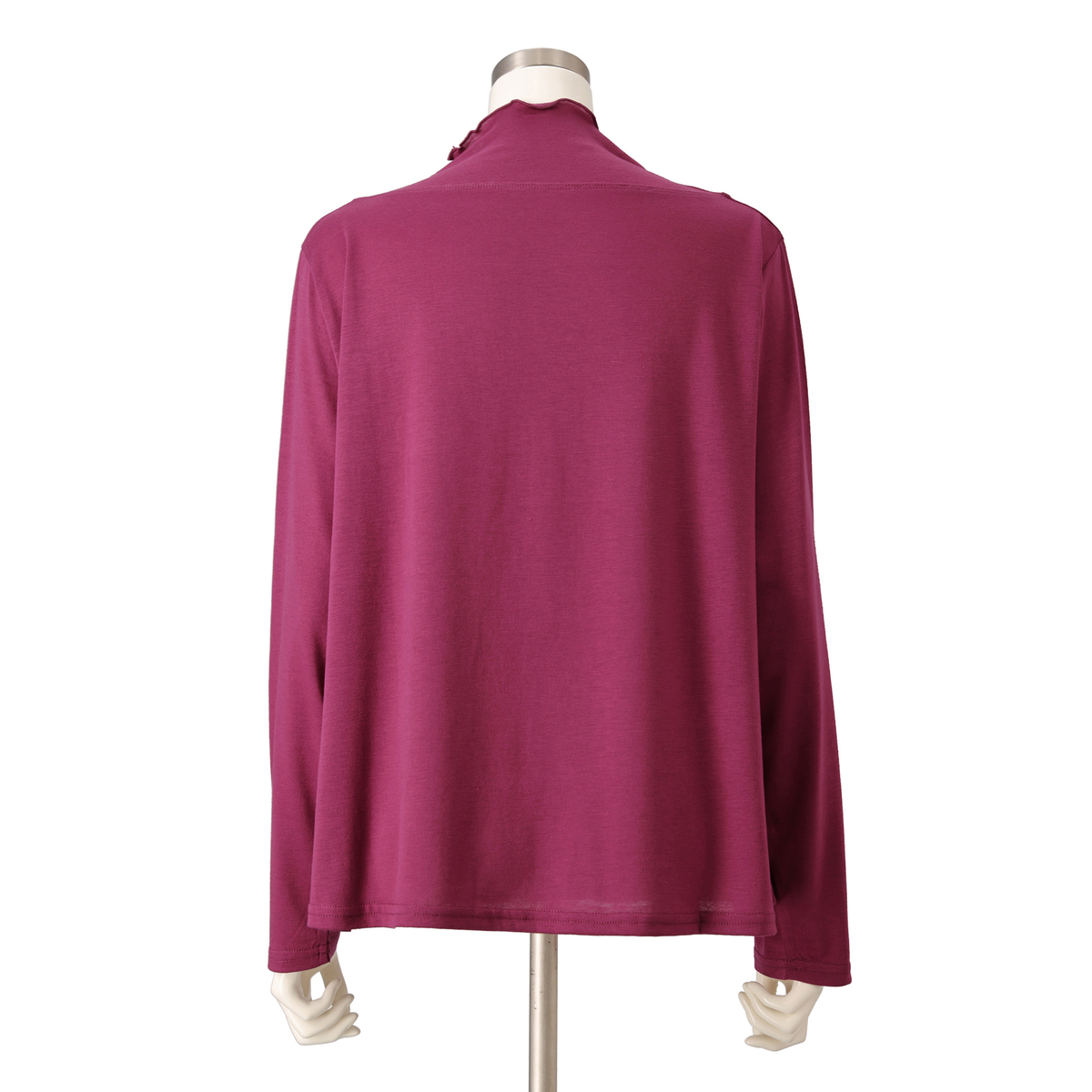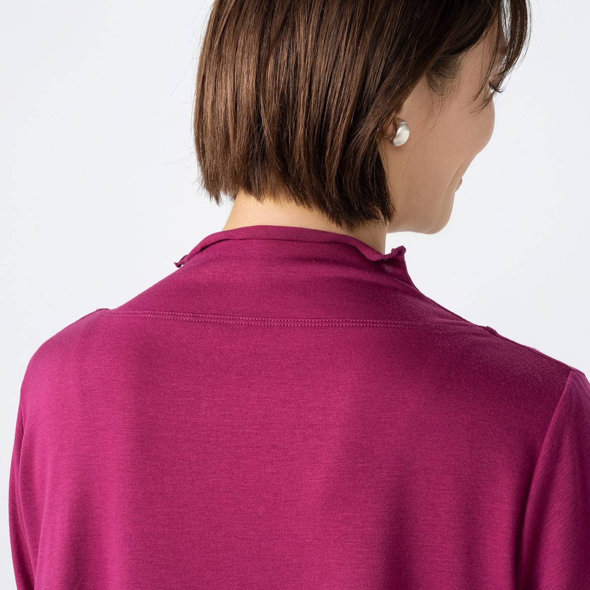 しなやかで肌触りが心地よいジャージー素材を使用。ストレッチもしっかり効いた、薄手で軽い素材です。上品な光沢感もあるので、カジュアルにもエレガントにもお召しいただけます