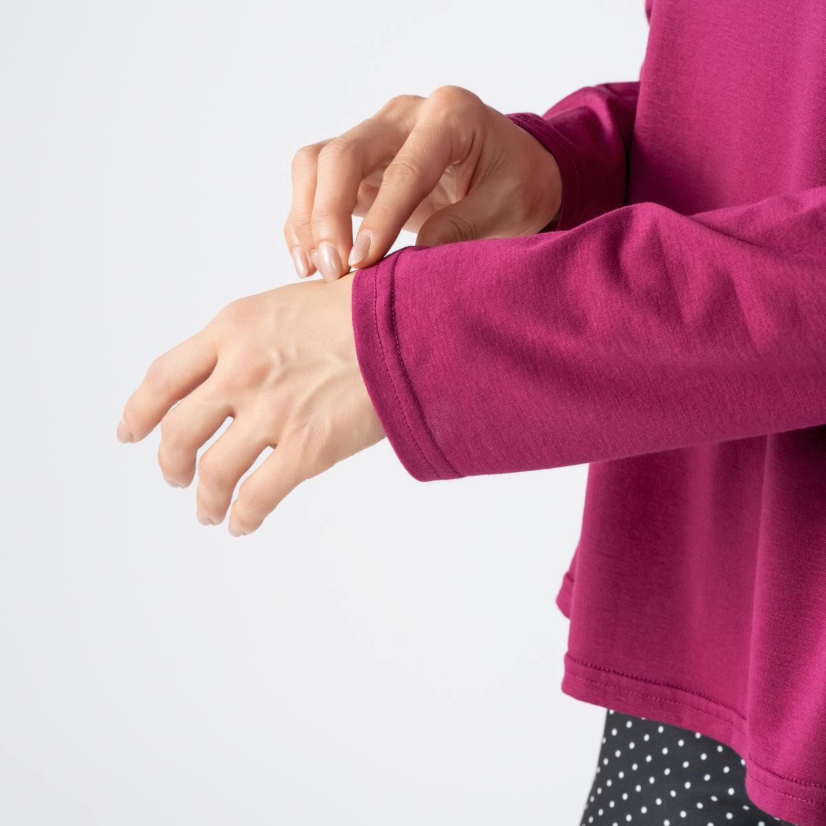ゆるやかなAラインシルエットに、肩はセットインスリーブでコンパクトながら、袖幅も身幅も適度なゆとりを持たせた楽な着心地。一枚着としてはもちろんインナーとしてもすっきり着られます