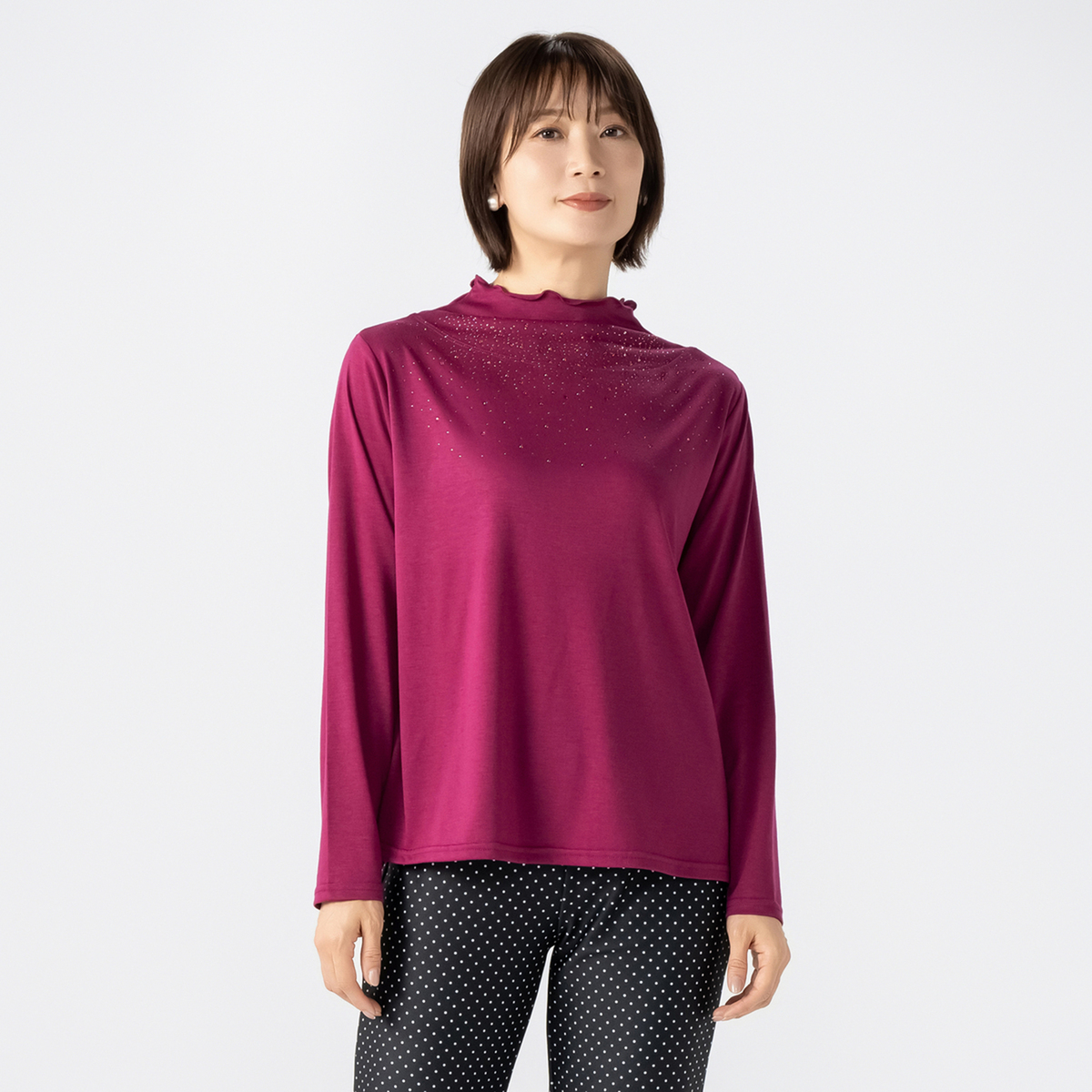繊細なビジューを散りばめたプルオーバー。ラウンドにビジューを施した優しいラインで、ビジューの色も身頃と同系色のものをつけ、派手すぎず上品なイメージに仕上げました。ハイネックの端はメロウ始末で、お顔周りをフェミニンに彩ります