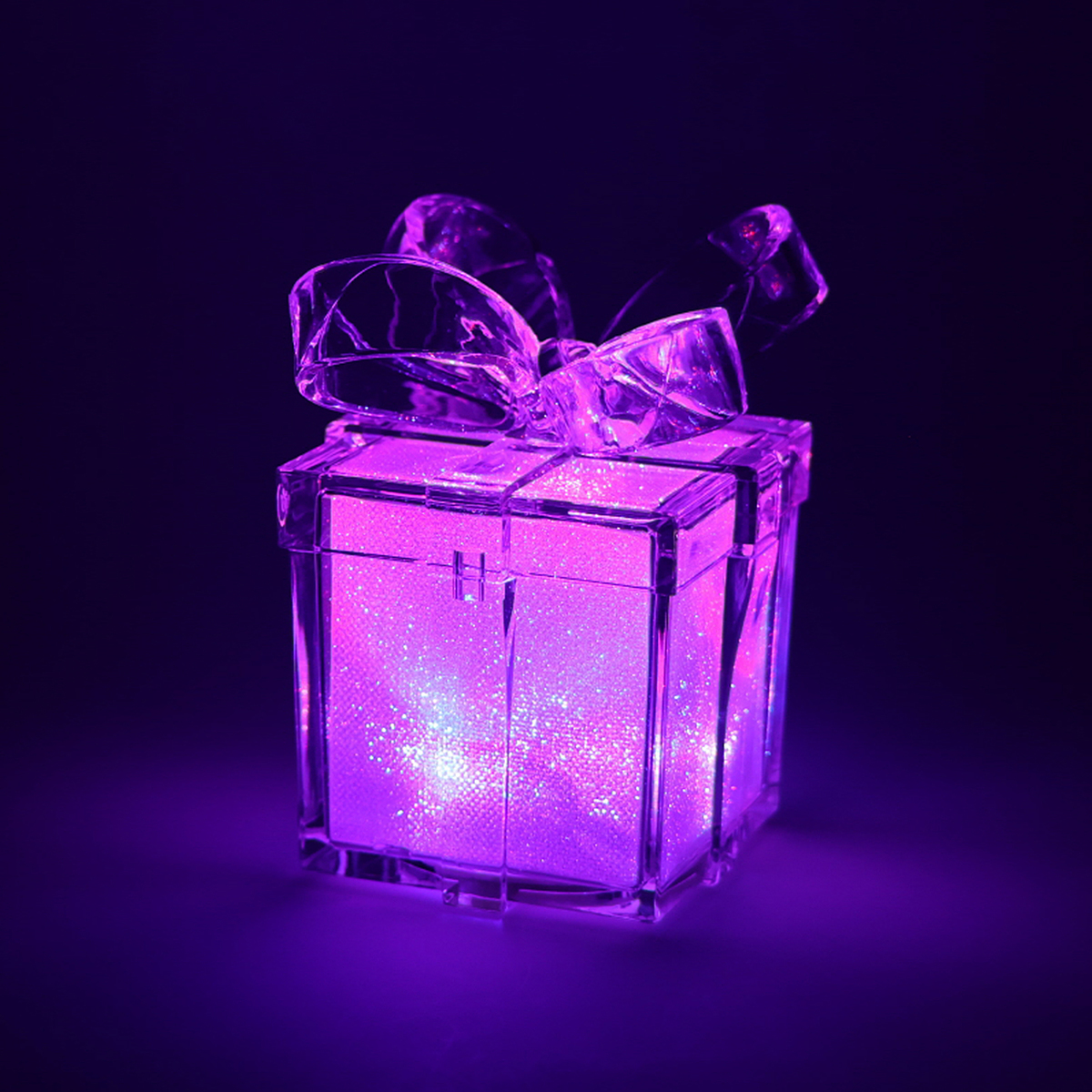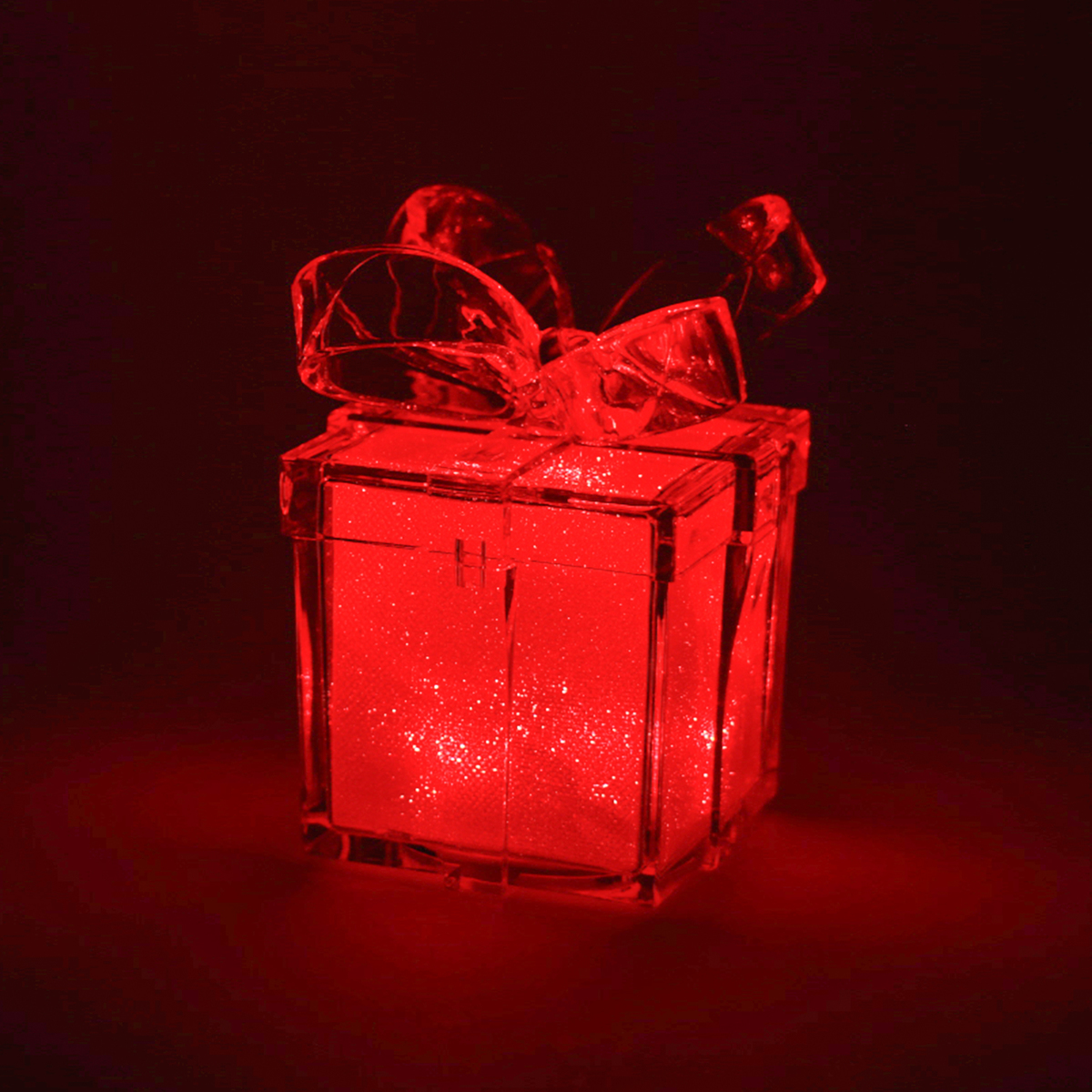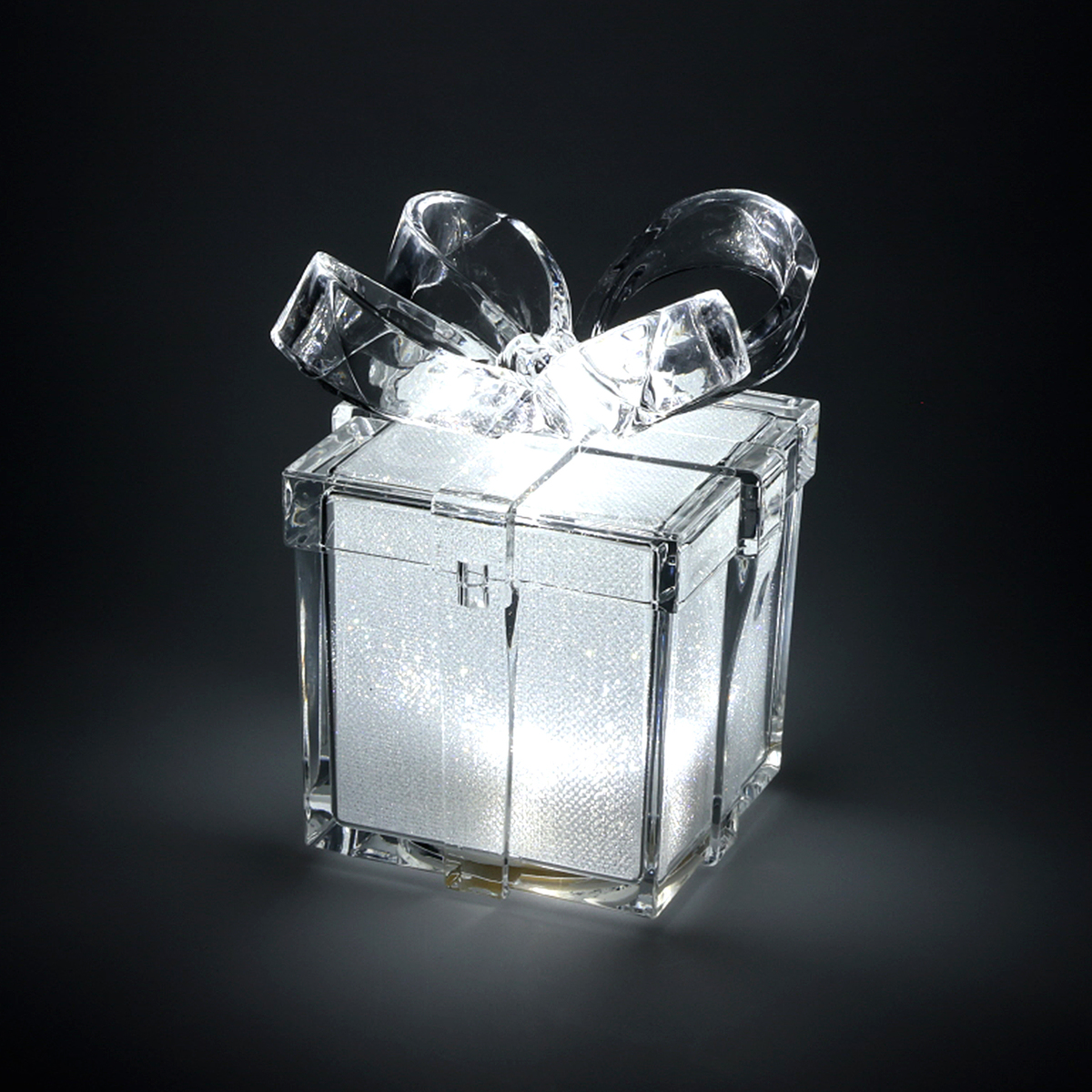 クリスマスのシーズンを華やかに演出する、ギフトボックス型のテーブルデコレーション。電池式なので、電源やコードの位置を気にせず飾れます