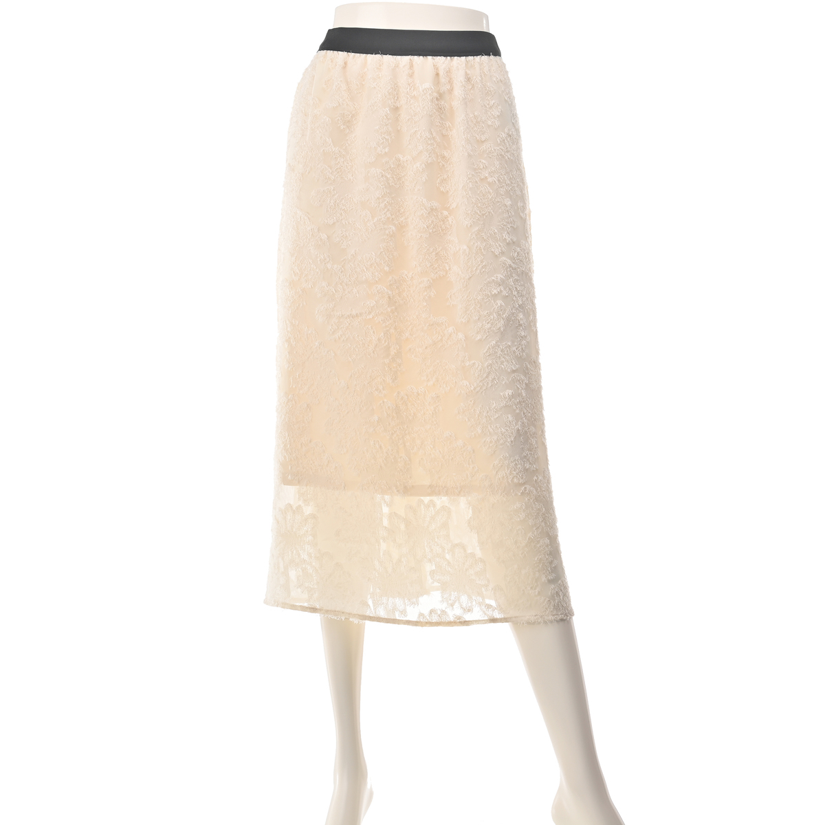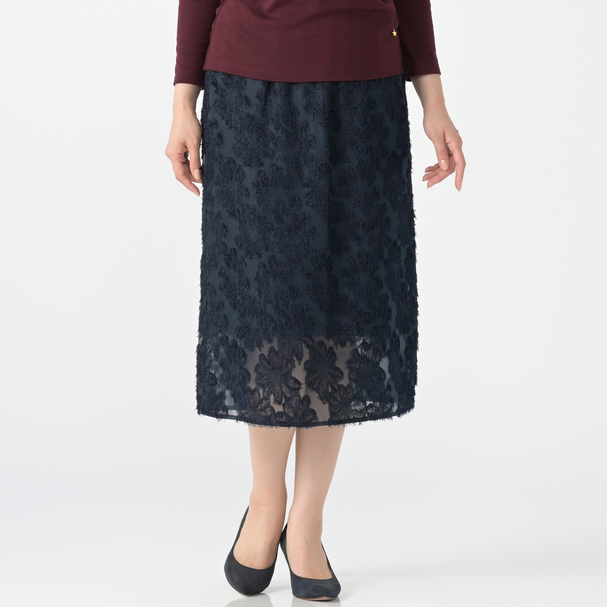 カットジャガードのIラインスカートで、シンプルなシルエットながらも華やかな装いに。ウエスト全体はゴム仕様ですが、スッキリさせているので、トップスはインでもアウトでもお洒落に着こなせそうです