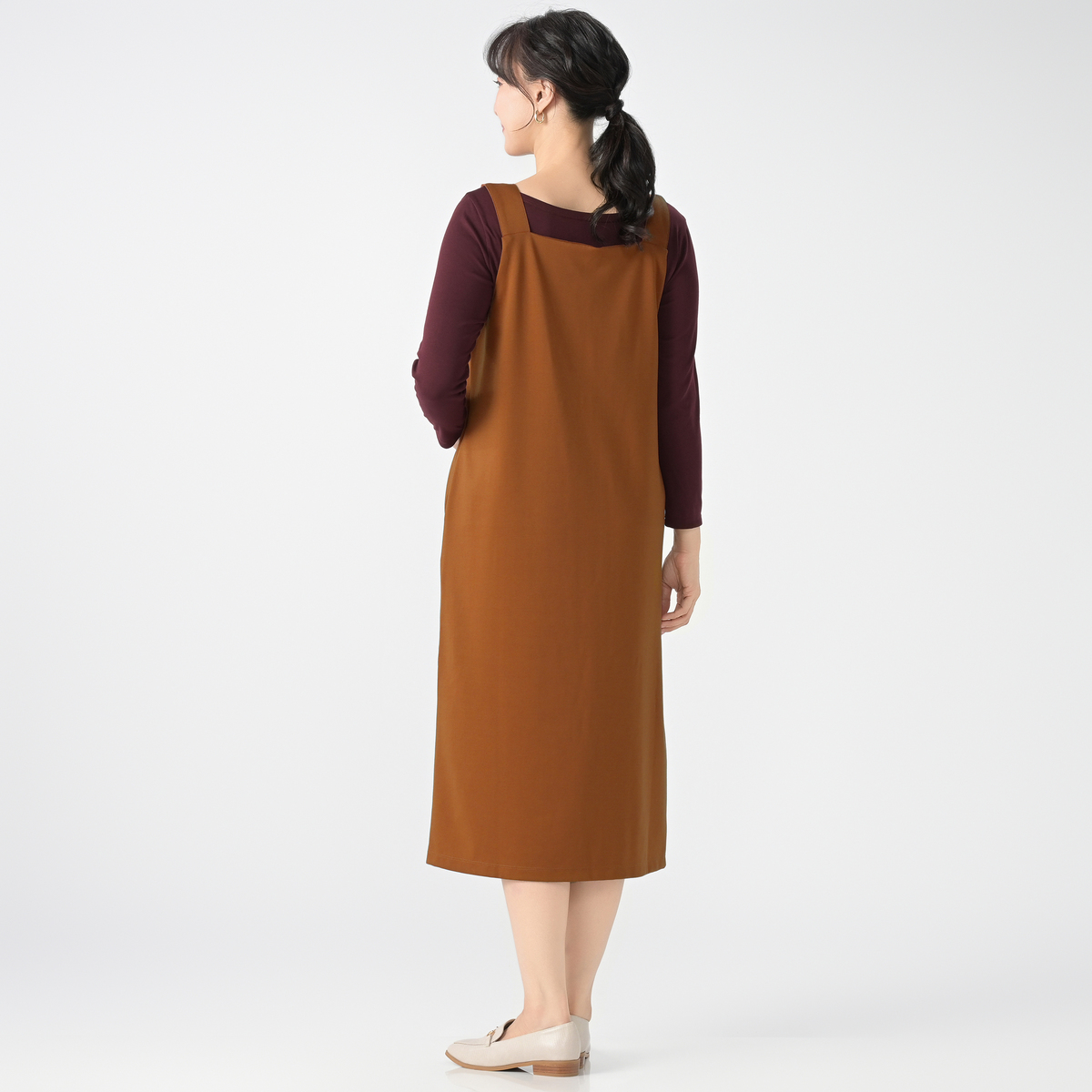 エニワイズ加工のなめらかな生地が心地よいジャンスカ。エニワイズ加工は繊維中に油脂分が含まれているのでしっとりなめらかな肌触りです。ほどよい落ち感ときれいな表面感が、きちんと感のある印象を与えます