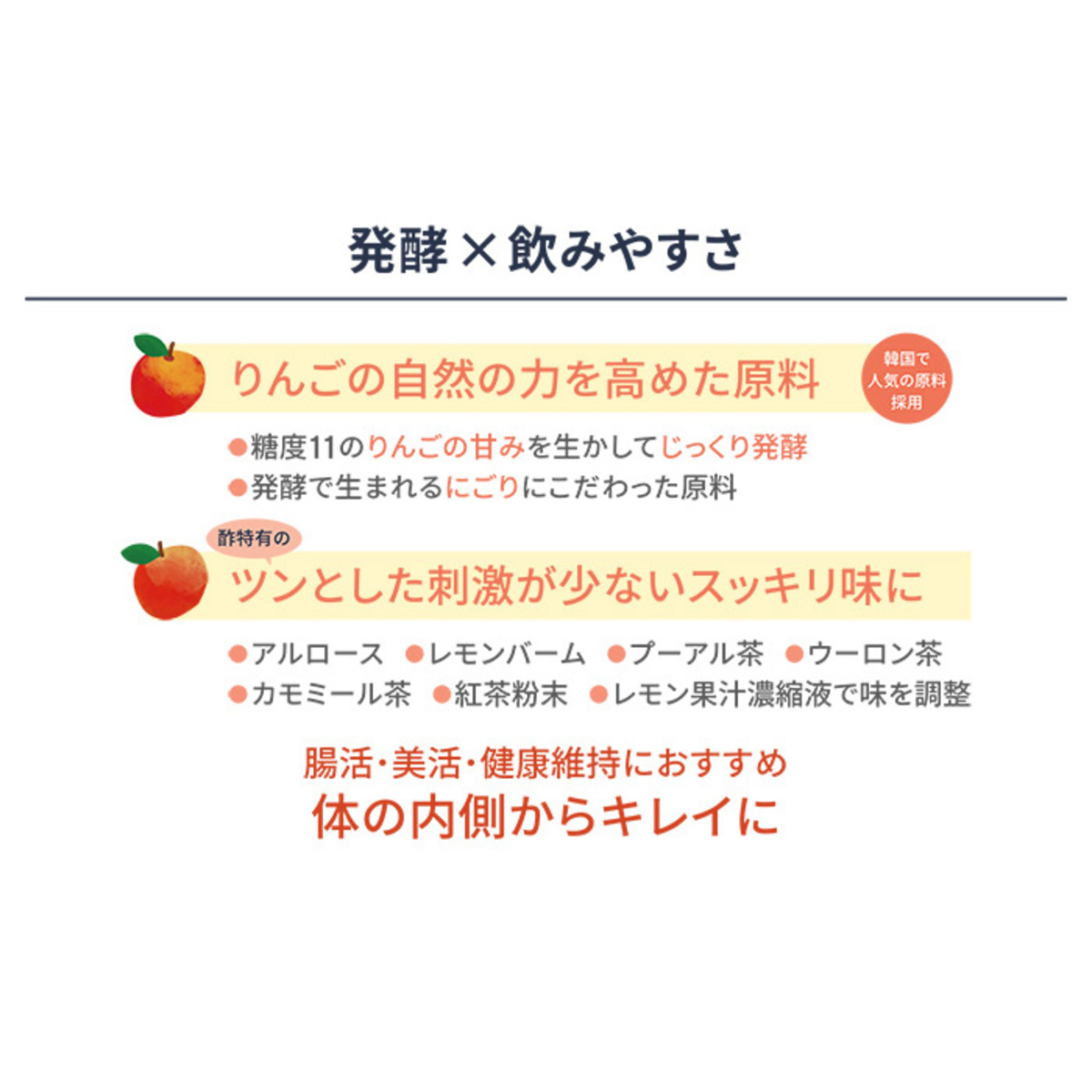 製品に占めるりんご酢の配合割合は55%。水や炭酸水で薄めてお召し上がりいただけます*。ポリフェノールを含有。1包15mlあたり約16kcalです