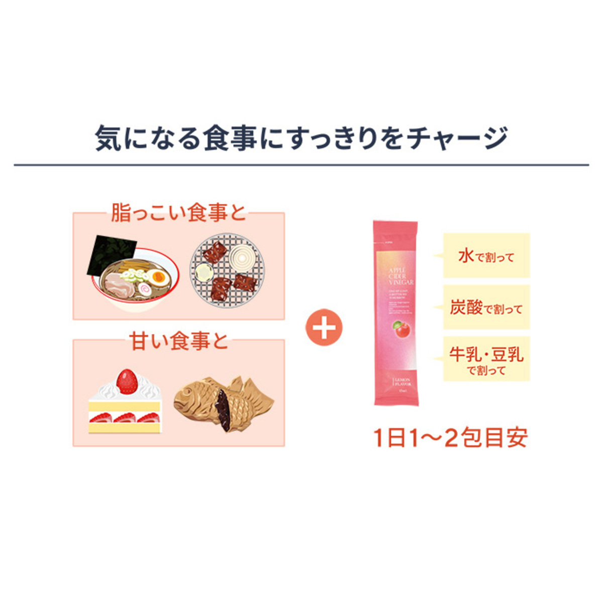 *1日1〜2包を目安に、1包を60mlの水や炭酸水で薄めてお召し上がりください。濃さはお好みに合わせて調整してください
