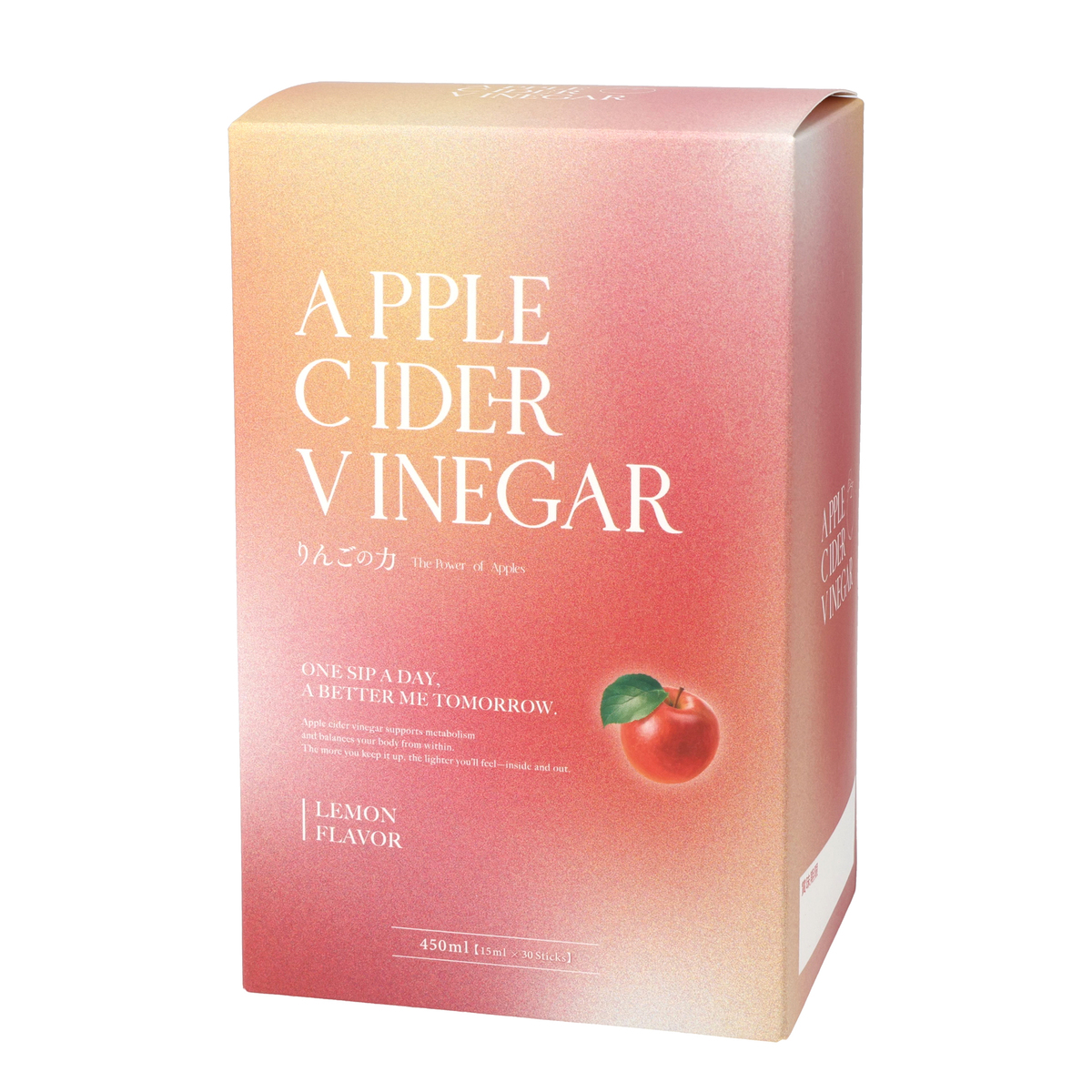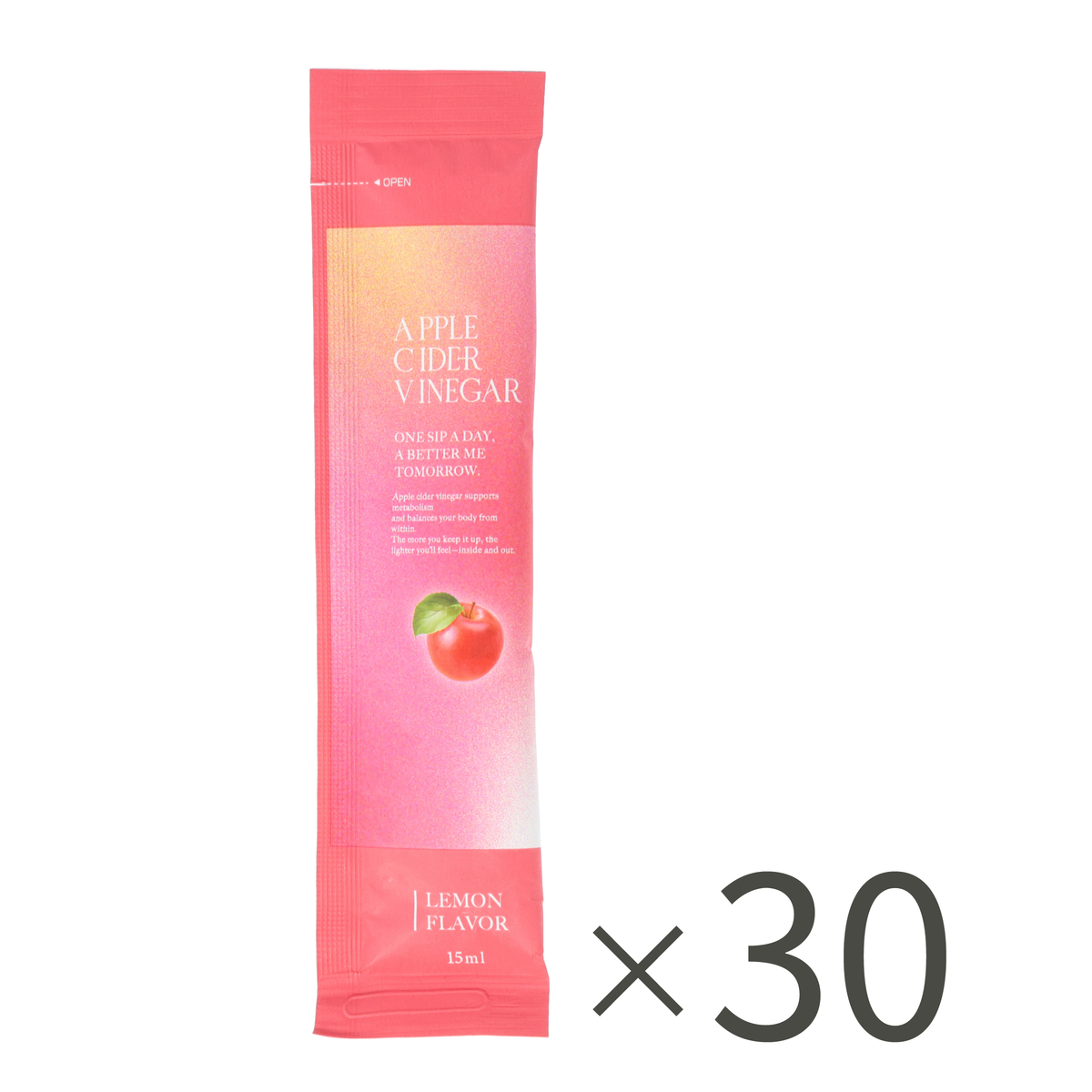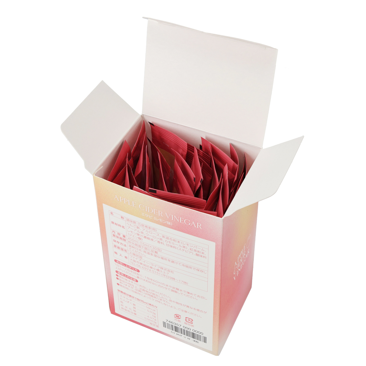 [アレルギー物質特定原材料8品目] なし [内容量] 450ml(15ml×30包) [内容量] 1日1〜2包 [お召し上がり方] 1日1〜2包を目安に、1包を60mlの水や炭酸水で薄めてお召し上がりください。濃さはお好みに合わせて調整してください [栄養成分表示]1包(15ml)あたり エネルギー…16kcal たんぱく質…0.03g 脂質…0g 炭水化物…4.07g 食塩相当量…0.0043g [保存方法] 直射日光・高温多湿な場所を避けて冷暗所で保存してください [注意事項] ※開封後はすぐにお召し上がりください ※製品の特性上、沈殿物が発生したり、色や物性が異なる場合がございますが、品質には問題ありません ※開封時に包装材によってケガをしないよう、ご注意ください [原産国] 韓国 [原材料] りんご酢、アルロース、茶混合粉末(レモンバーム、プーアル茶、ウーロン茶、カモミール茶)、紅茶粉末、レモン果汁濃縮液/香料、甘味料(ステビア)、酸味料(クエン酸)