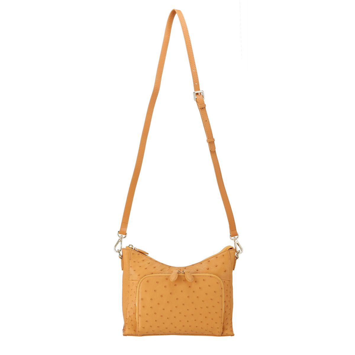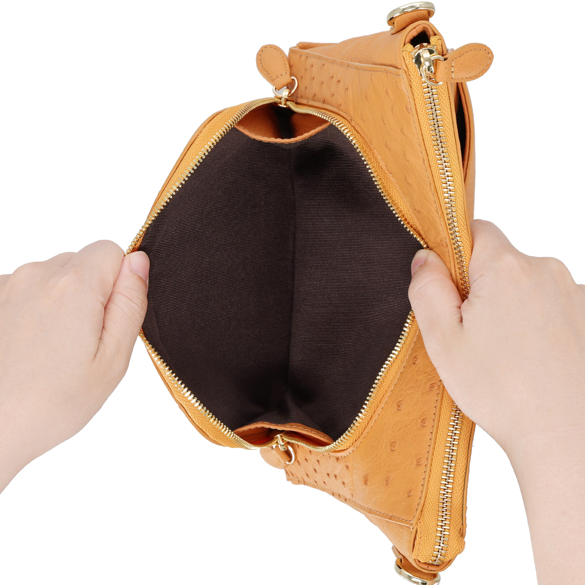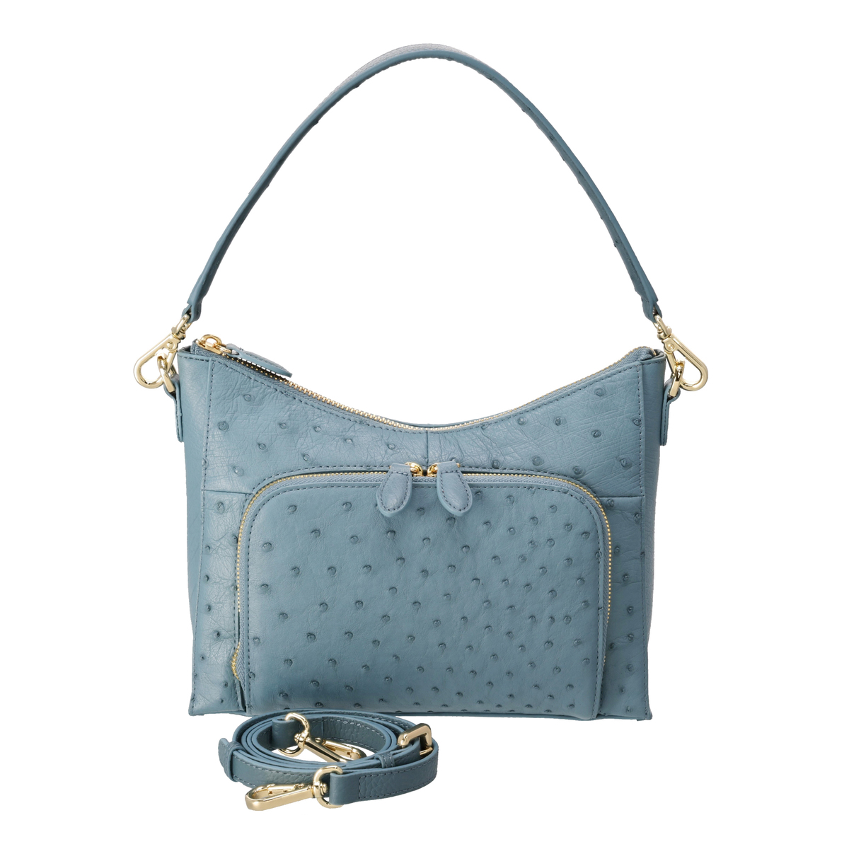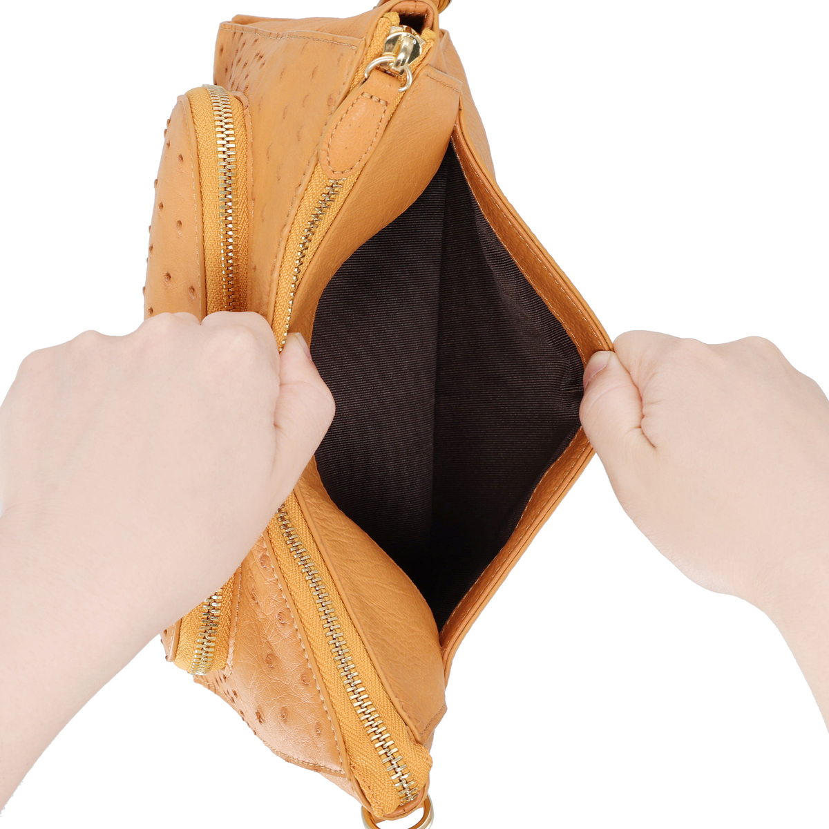 本体前面・背面・側面、ハンドル表面にオーストリッチ革を使ったショルダーバッグ。前面にクイルマーク付きの部位を使用しているので、その経年変化まで楽しんで頂けます。底面やハンドルの裏面、ショルダーには牛革を使用した、フルレザー仕立てです