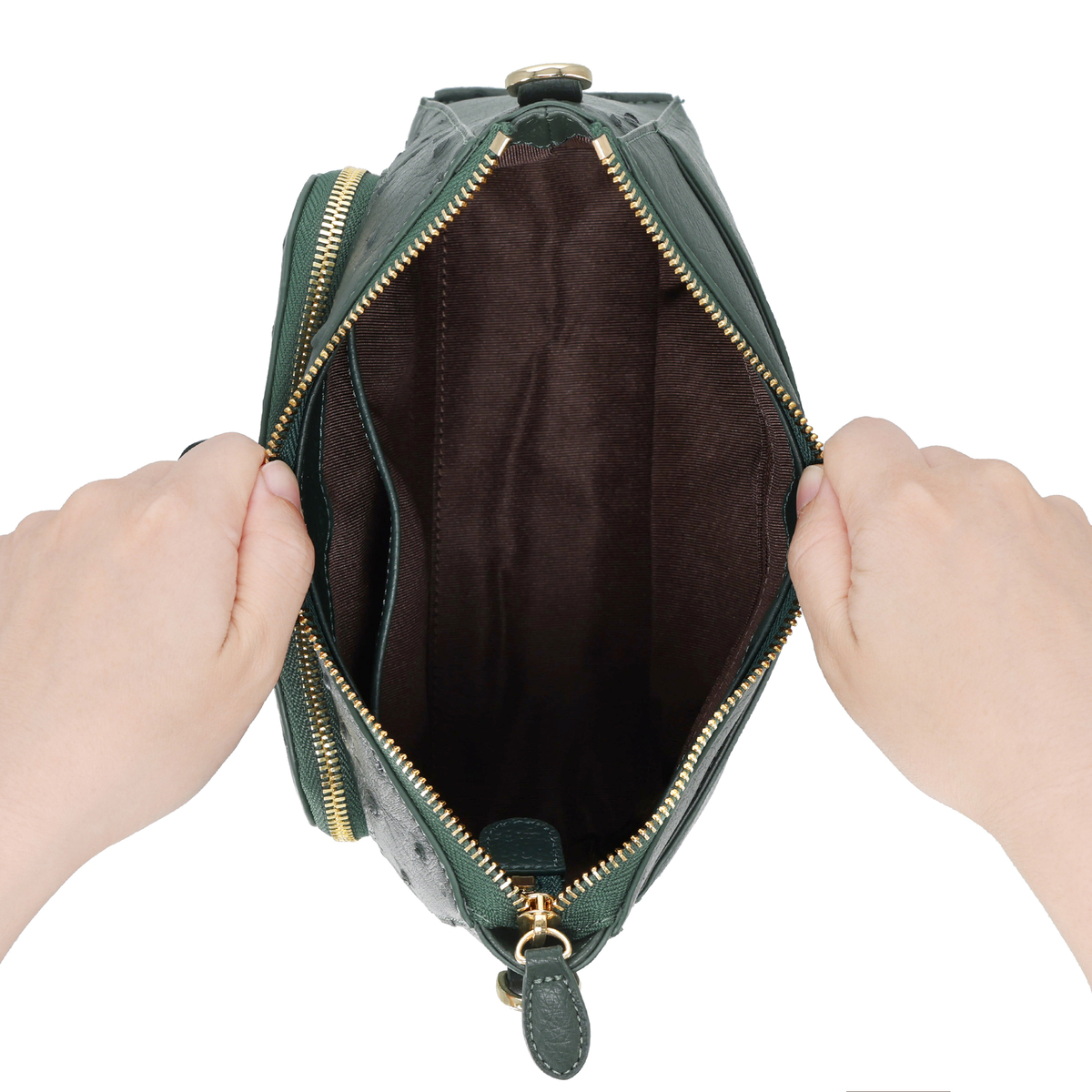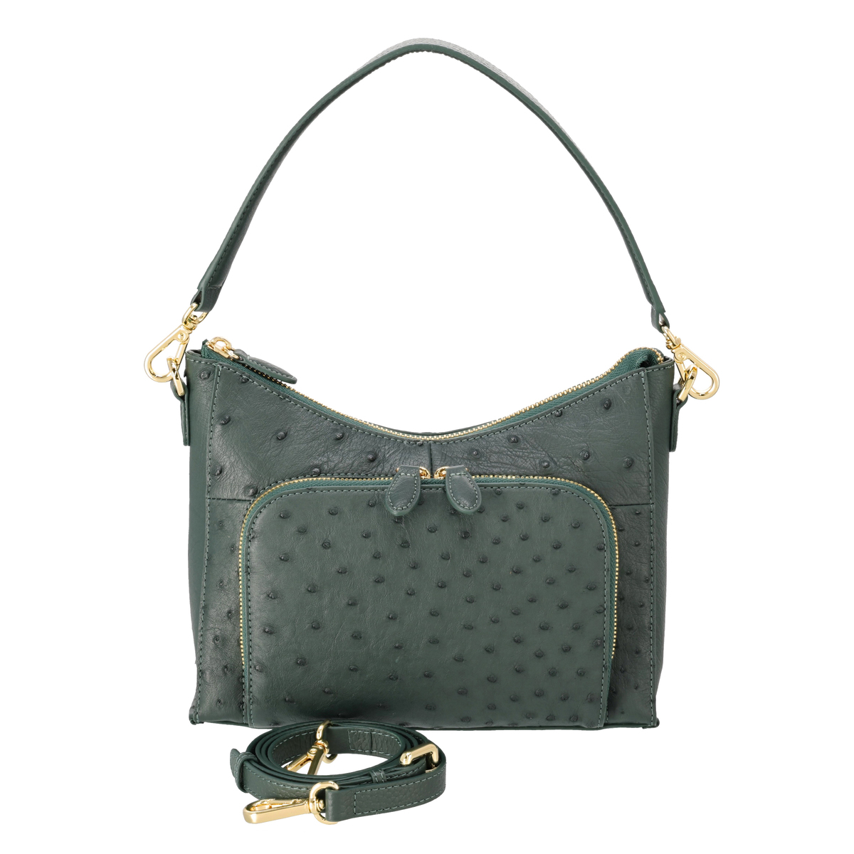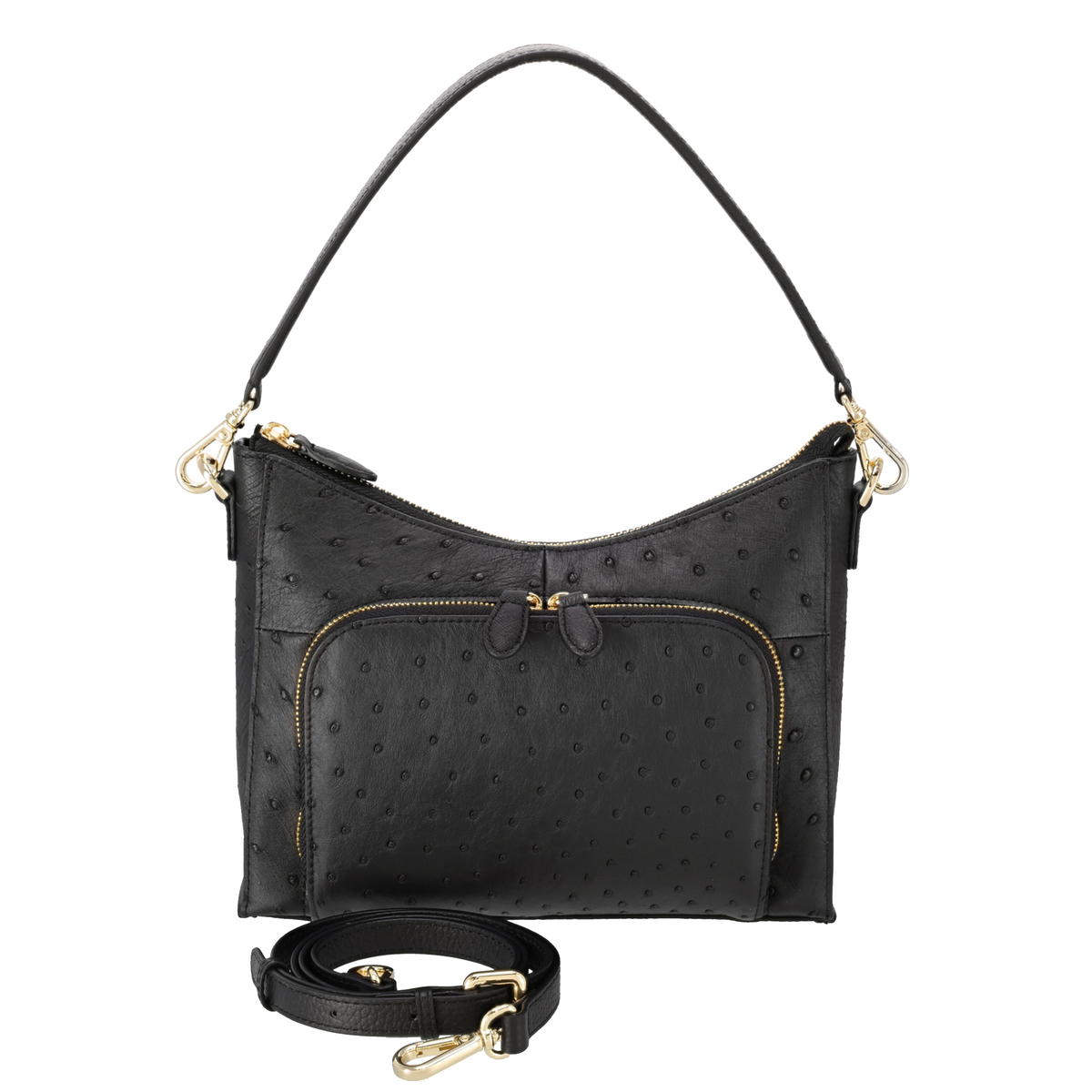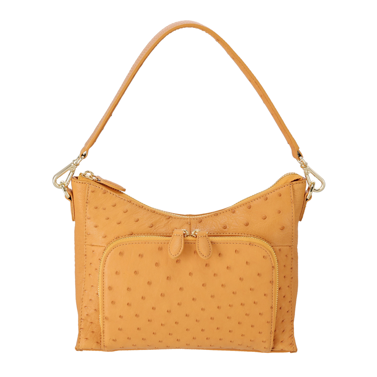 本体前面・背面・側面、ハンドル表面にオーストリッチ革を使ったショルダーバッグ。前面にクイルマーク付きの部位を使用しているので、その経年変化まで楽しんで頂けます。底面やハンドルの裏面、ショルダーには牛革を使用した、フルレザー仕立てです