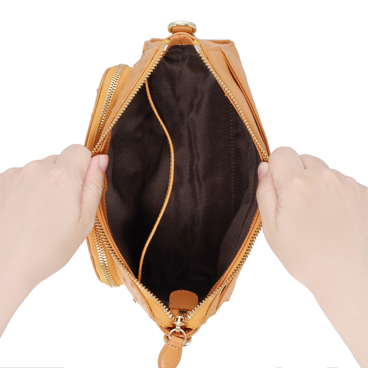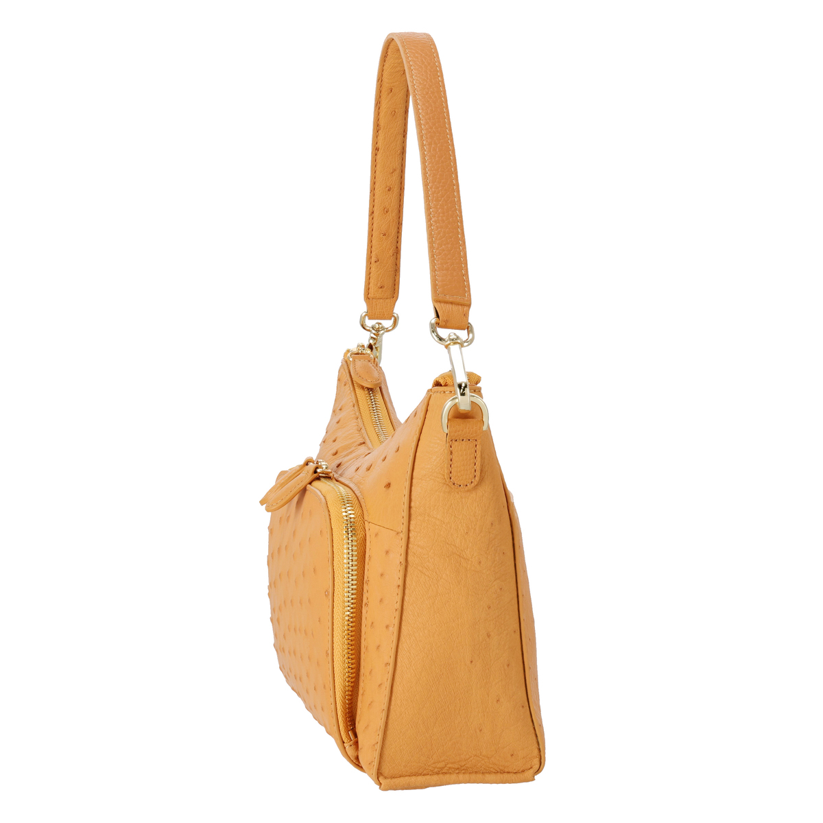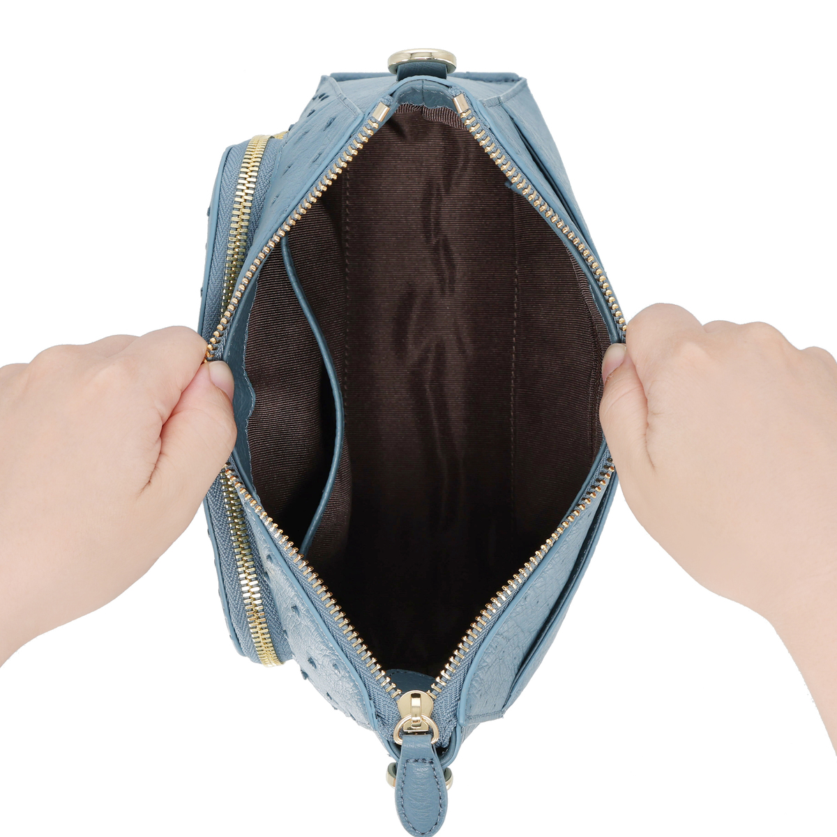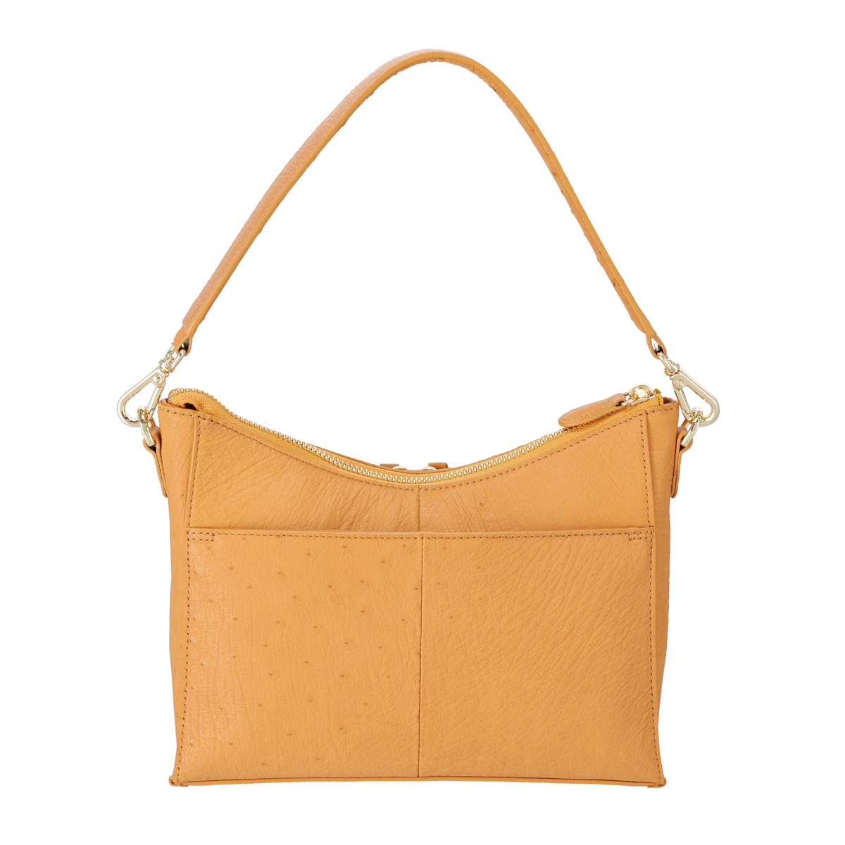 本体前面・背面・側面、ハンドル表面にオーストリッチ革を使ったショルダーバッグ。前面にクイルマーク付きの部位を使用しているので、その経年変化まで楽しんで頂けます。底面やハンドルの裏面、ショルダーには牛革を使用した、フルレザー仕立てです