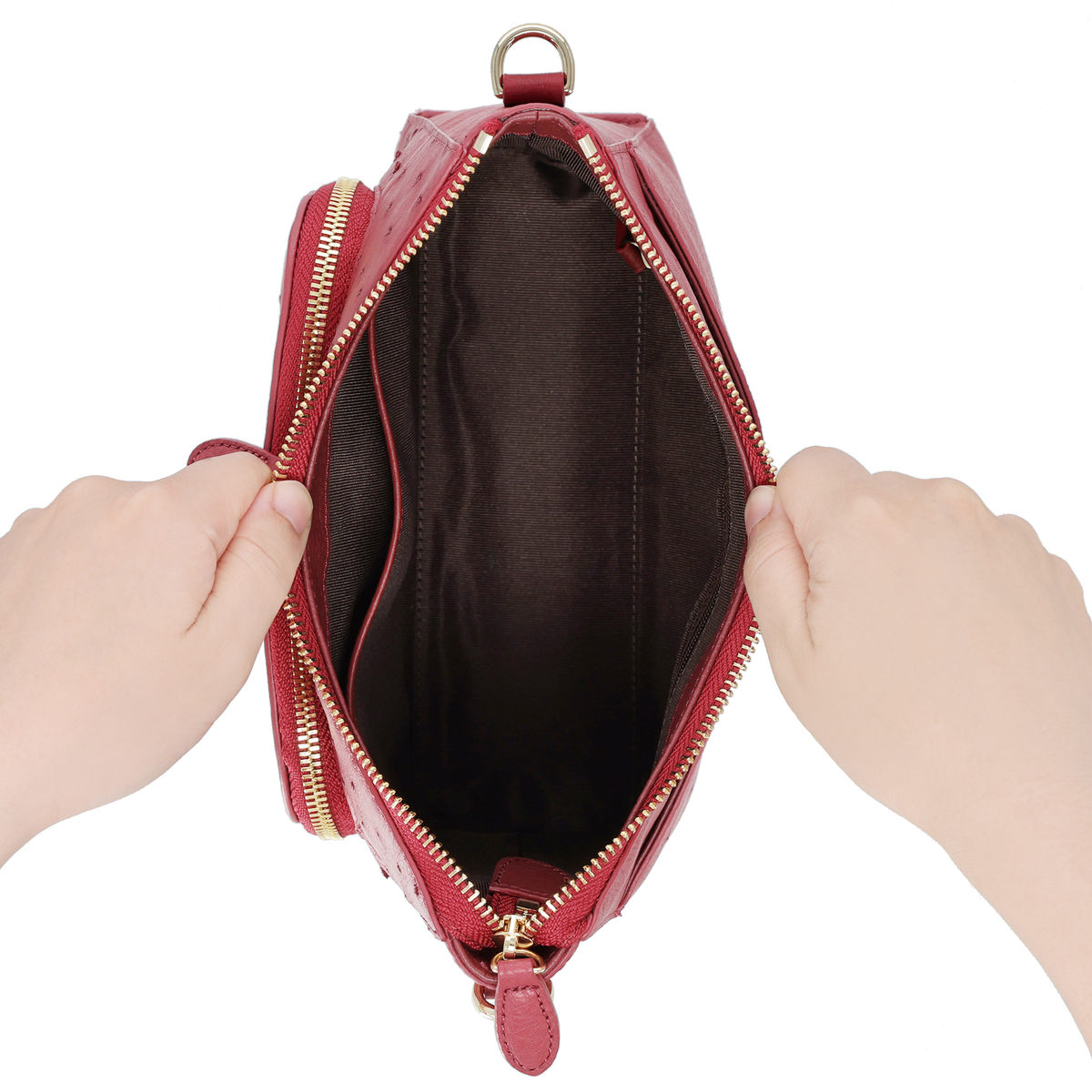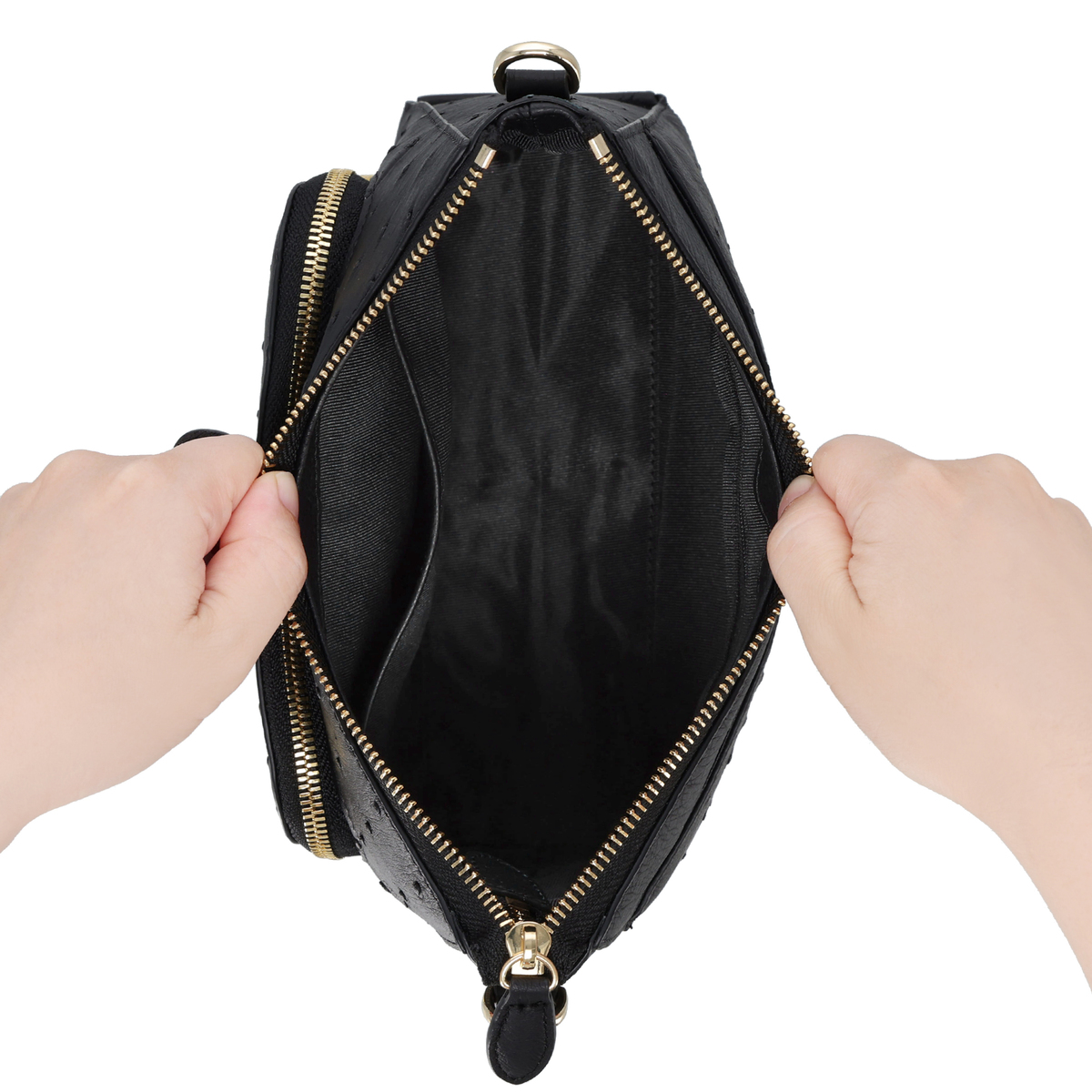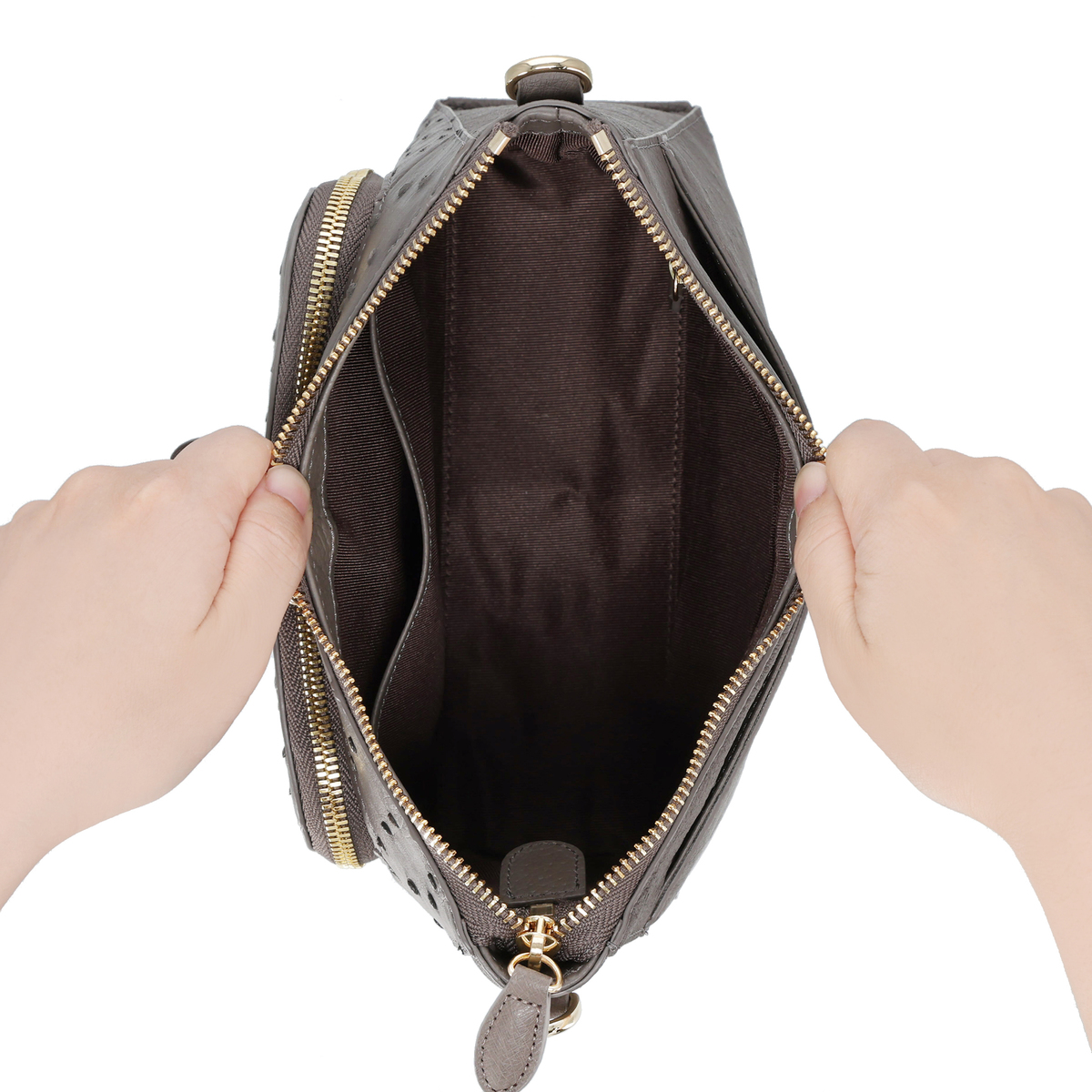 [サイズ(約)] 縦18.5×横24×マチ7.5cm ハンドル立ち上がり:20cm ショルダー立ち上がり:56〜61cm [重量(約)]※付属品含む 380g [素材] 表地:オーストリッチ革 牛革 裏地:牛革・ポリエステル [仕様] 付属(取り外し可):ショルダーベルト×1 ハンドル×1 開閉:ファスナー式 底ビョウ:無 [ポケット] 内側:オープンポケット×1 ファスナーポケット×1 外側:オープンポケット×1 Wファスナーポケット×1 【ベトナム製】