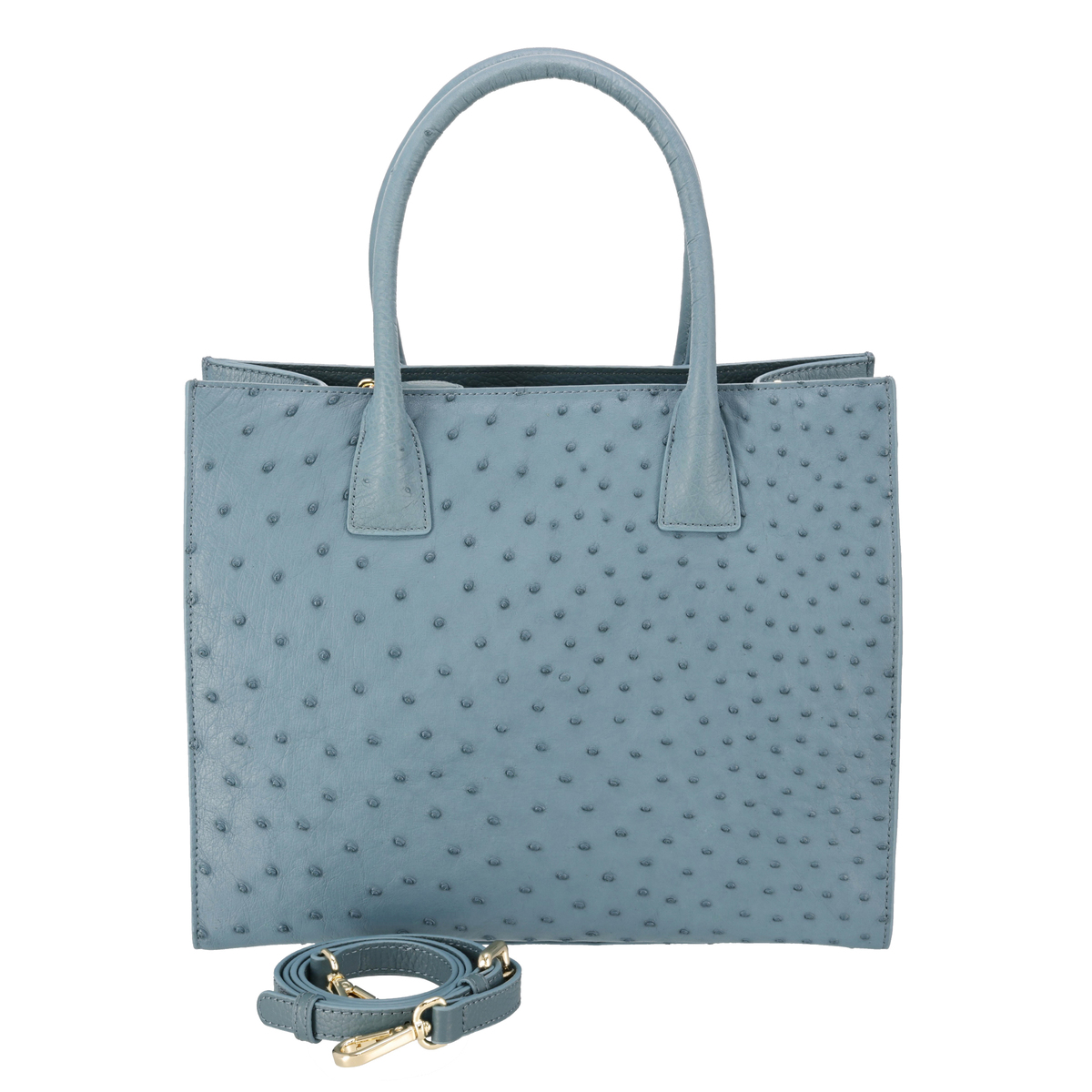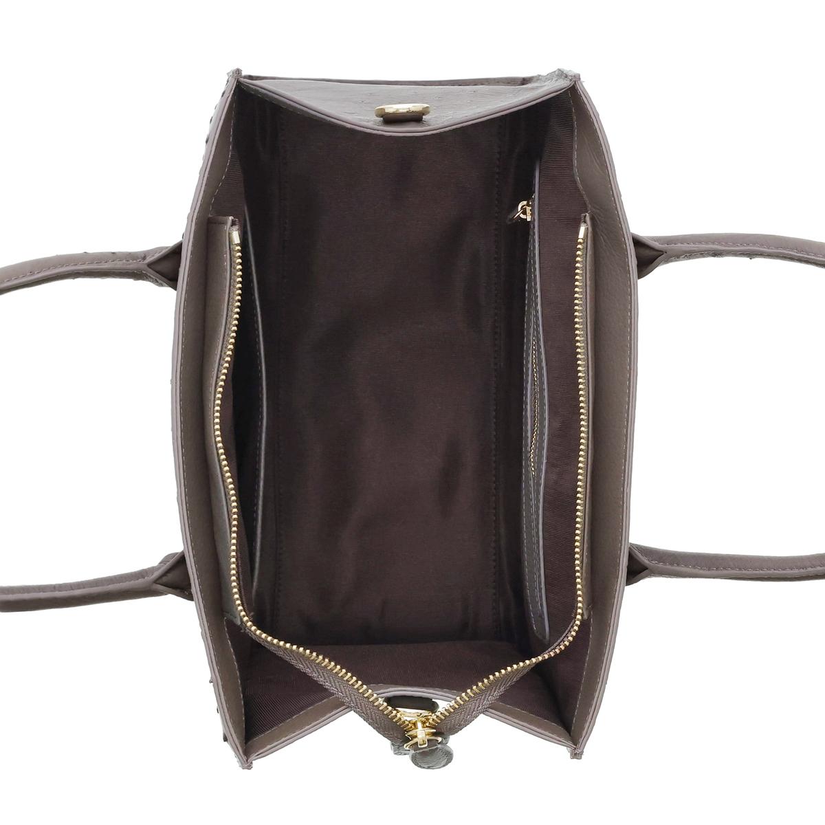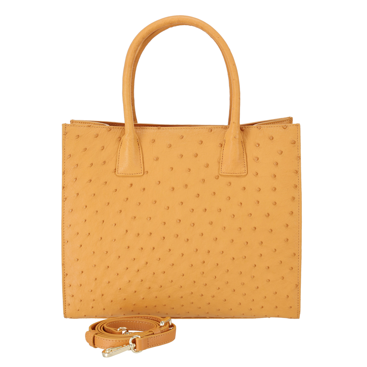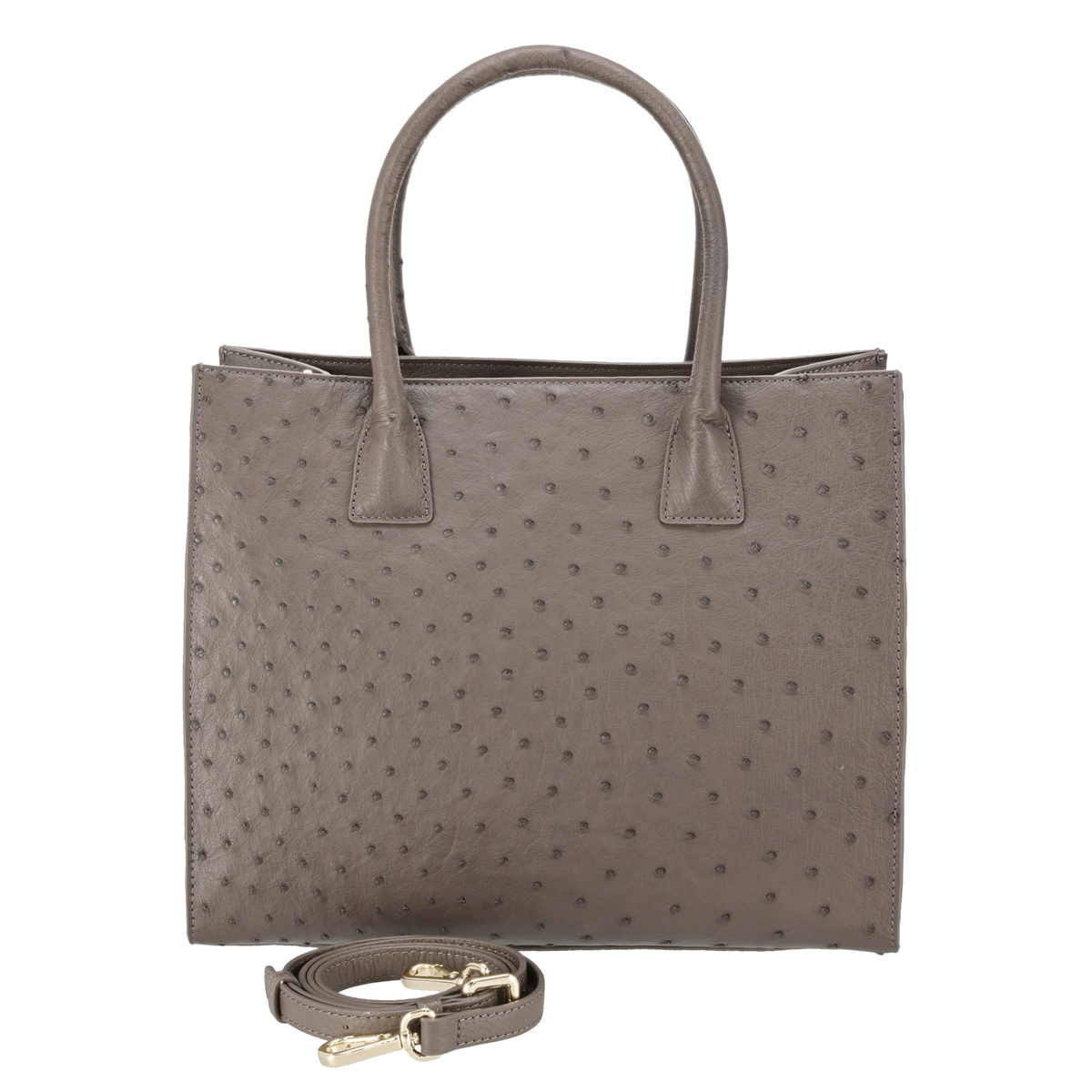 前後面にクイルマーク付オーストリッチ革を使用したトートバッグ。ハンドル、底面、側面すべてオーストリッチ革仕立てです。スッキリとした印象を与えるスクエア型で、付属のショルダーを付ければ2WAY使いも可能です