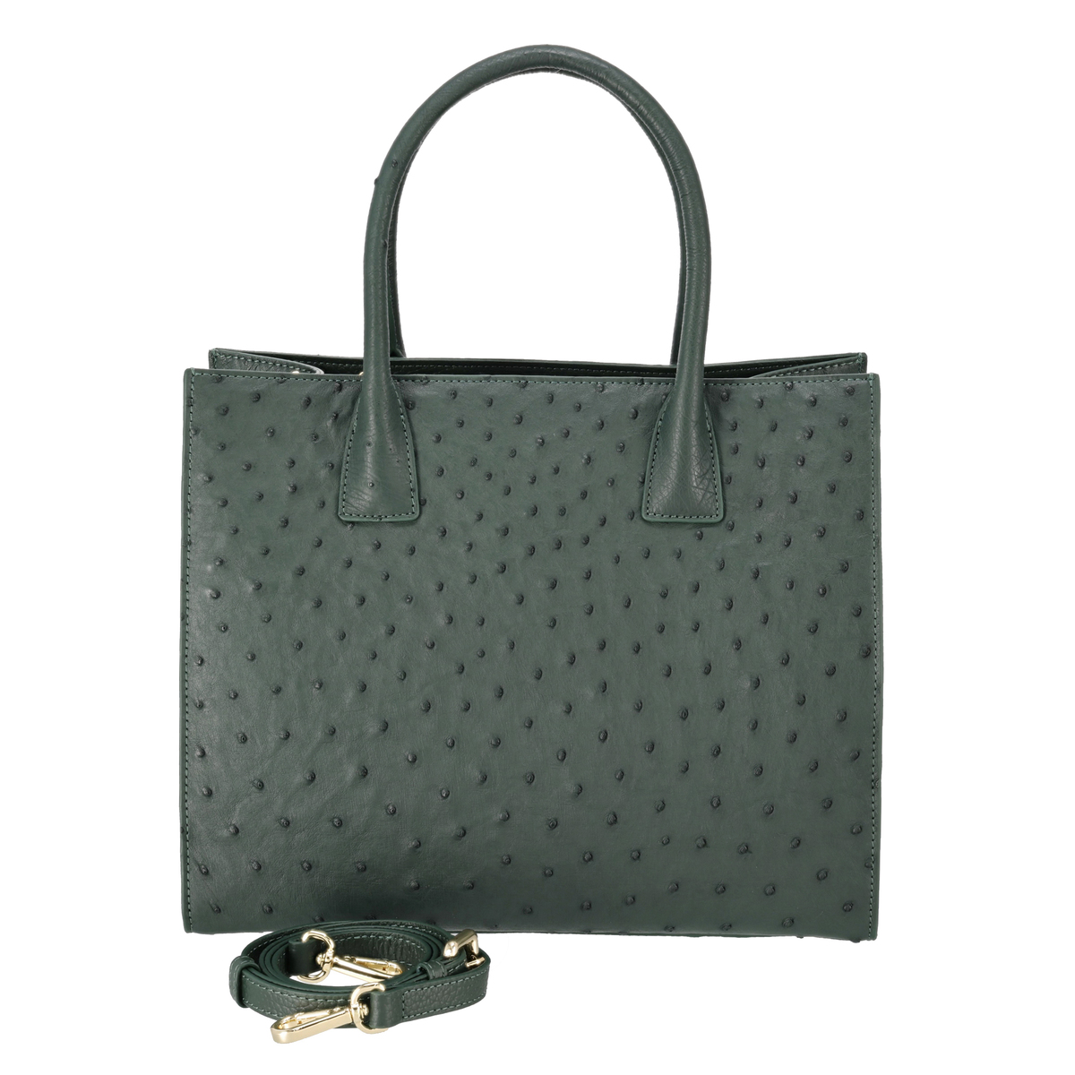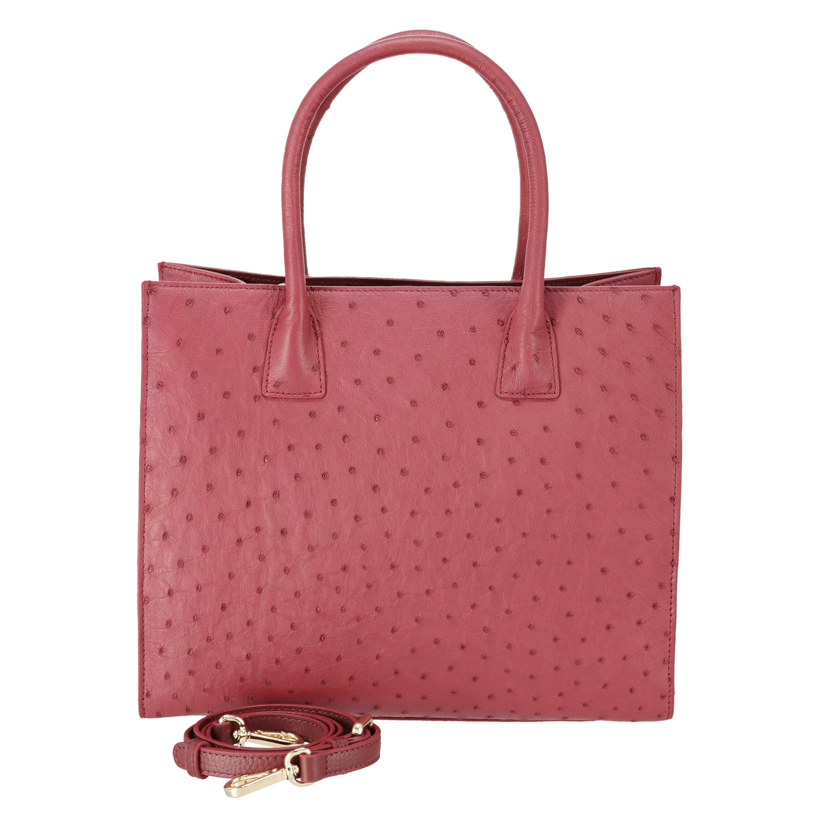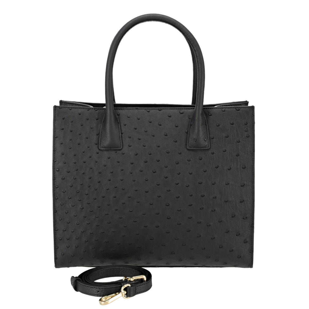 前後面にクイルマーク付オーストリッチ革を使用したトートバッグ。ハンドル、底面、側面すべてオーストリッチ革仕立てです。スッキリとした印象を与えるスクエア型で、付属のショルダーを付ければ2WAY使いも可能です