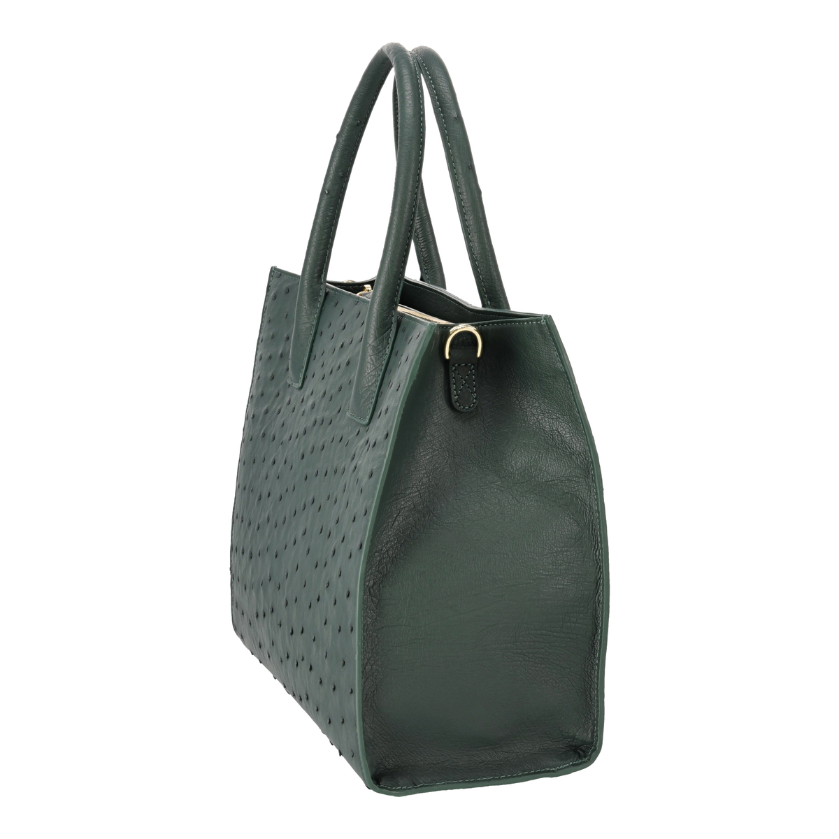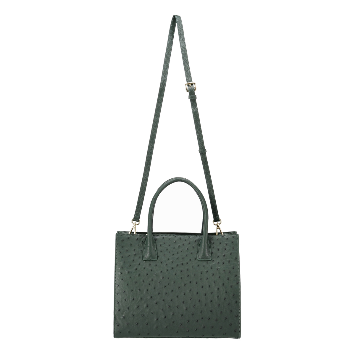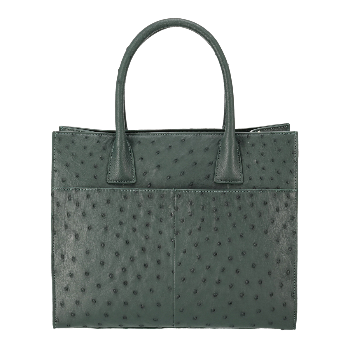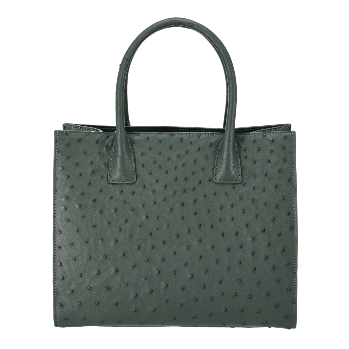前後面にクイルマーク付オーストリッチ革を使用したトートバッグ。ハンドル、底面、側面すべてオーストリッチ革仕立てです。スッキリとした印象を与えるスクエア型で、付属のショルダーを付ければ2WAY使いも可能です