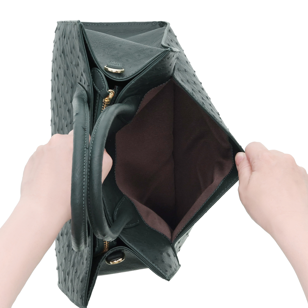 [サイズ(約)] 縦25×横30×マチ10cm ハンドル立ち上がり:14cm ショルダー立ち上がり:54〜60cm [重量(約)]※付属品含む 550g [素材] 表地:オーストリッチ革 持ち手:オーストリッチ革 底:オーストリッチ革 裏地:牛革、ポリエステル [仕様] 付属(取り外し可):ショルダー×1 開閉:ファスナー式 底ビョウ:有 [ポケット] 内側:ファスナーポケット×1、オープンポケット×1 外側:オープンポケット×1 【ベトナム製】