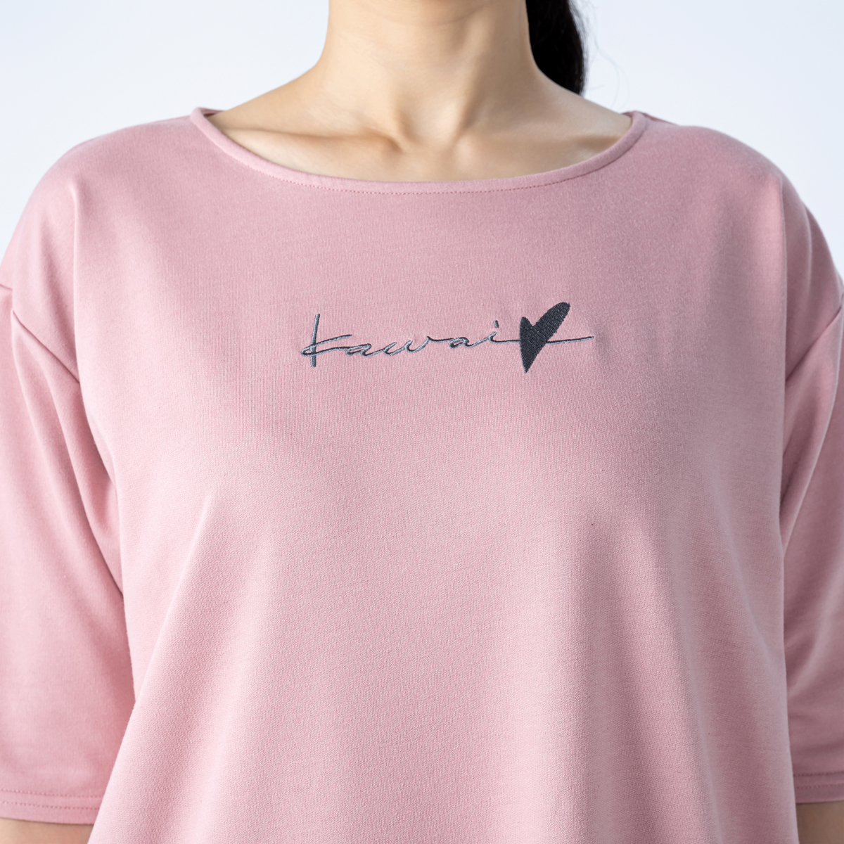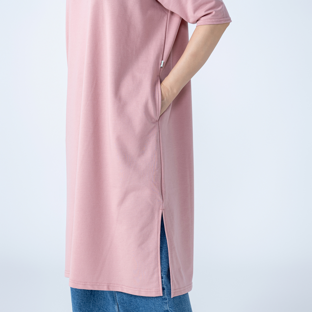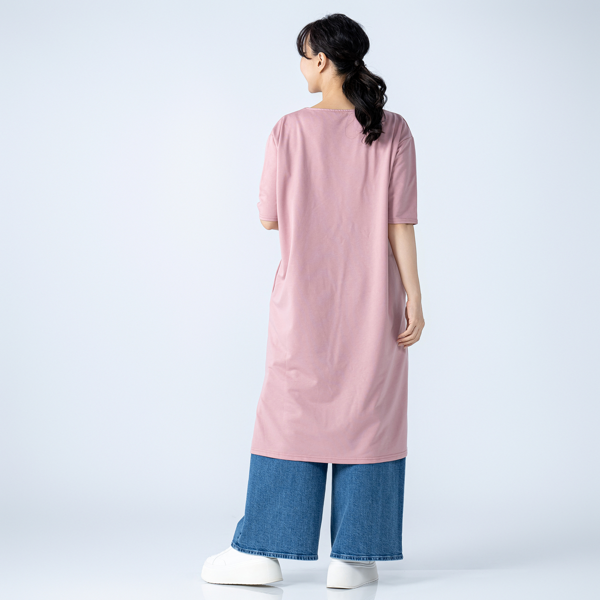 ゆったりとしたシルエットで、体のラインを拾いにくい、リラックスして着られるチュニックです。前身頃に施された、かわいらしい刺繍がポイントになっています