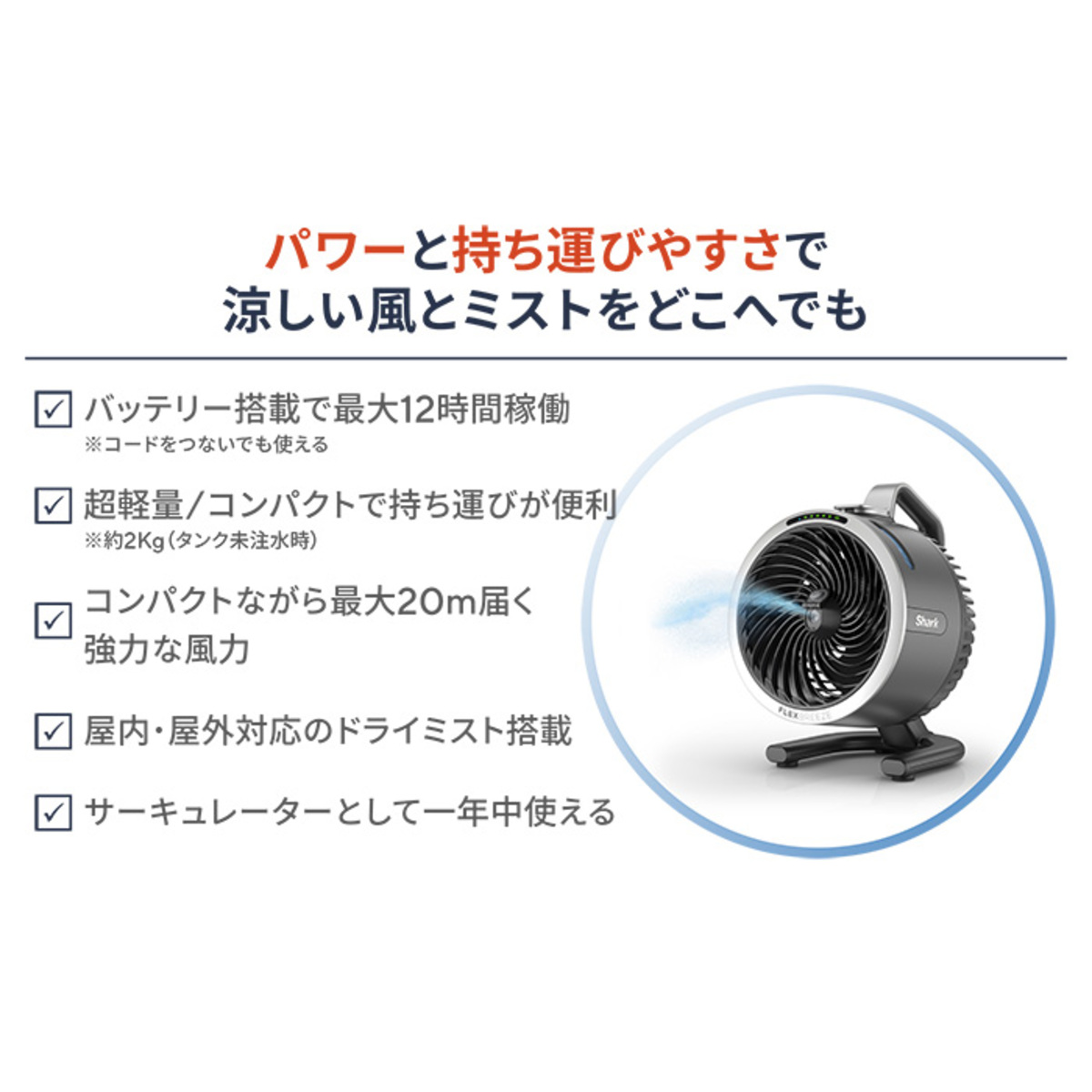 [商品内容] ・サーキュレーター本体 ・充電アダプター [サイズ] 高さ29.1×幅21.2×奥行22.0cm [重量] 2.0kg [コード長さ] 1.8m [タンク容量] 170ml [消費電力] 36W [充電時間] 約3時間充電で1.5時間(風量5)〜12時間(風量1)使用可能 [使用方法] 1.本体を家庭用電源につなぎ、充電 2.ON/OFFスイッチを押す 3.お好みの風量、上下角にあわせて使用 4.ミスト機能を使う場合は、給水口から水を入れ、ミストの蓋を開け、ON/OFFボタンを押す ※ブーストモードは風量5よりさらにパワフルなモードです。ブーストモードをコードレスで利用する場合は、バッテリーを長持ちさせるため20分後に自動的に風量が下がります。コンセントに接続されている場合は、制限なくブーストモードをお使いいただけます。扇風機天面の風量ボタンを押し、風量5の次がブーストモードです [注意事項] ※本製品の改造や修理をしない ※本製品を水などの液体に浸さない ※ミストの近くで電気製品を使わない ※ミストの給水に温水/熱湯/香水やオイルを使用しない ※本製品付属のアダプターを使用のこと ■取り扱い説明を充分にご確認の上、ご使用下さい 【中国製】 [お手入れ] <ミストシステム> 1. 扇風機天面の電源ボタンを8秒間長押しし、ロックモード(取説P.12)を有効にします。お手入れ中の誤作動を防ぐため、すべての機能が一時的に無効になります 2. タンク注水口のフタを開けて、蒸留酢(酸度5%)の溶液をタンクに入れ、5〜7分間放置します。15分以上放置しないでください 3. タンク注水口から溶液を捨てます 4. タンクに水(水道水またはろ過水)を入れ、タンク給水口のフタとミストキャップが完全に密閉されていることを確認します。扇風機を約10秒間振った後、フタを開けて水を捨てます 5. 再度タンクに水を入れ約10秒間振り、フタを開けて水を捨て、タンクをしっかりすすぎます 6. 扇風機天面の電源ボタンを8秒間長押しし、ロックモード(取説P.12)を解除します 7. 風通しの良い場所にタンク注水口のフタを開けた状態で24時間置き、自然乾燥させます <扇風機外> 12か月毎または必要に応じて、湿らせたきれいな布で扇風機の外側の汚れを拭き取ってください <扇風機内部のお手入れ> 扇風機のガードは取り外しできません。内部の汚れが気になる場合は、市販の長細い掃除ブラシなどを使い、ガードやガード内部の羽根に付いたほこりを取り除いてください