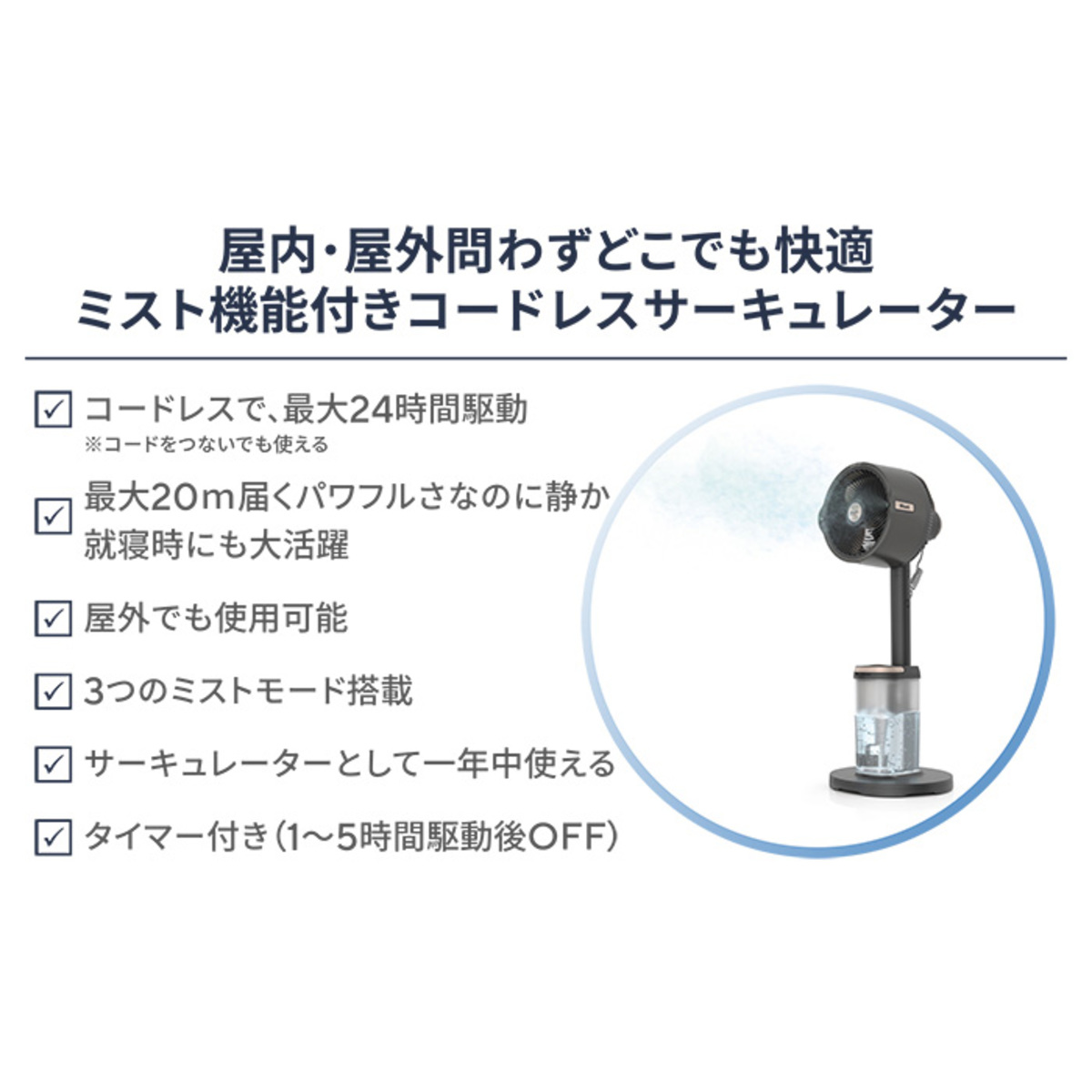 [商品内容] ・扇風機(本体) ・リモコン(単四電池×2(モニター用)) ・タンク ・充電アダプター ・ミストホースクリップ ・ミストホース ・ポール ・ベース ・ボルト ・六角レンチ ※組み立て式 [サイズ] 高さ93.4×幅35.5×奥行36.9cm [重量] 7.0Kg [コード長さ] 約1.8m [タンク容量] 4.5L [消費電力] 36W [充電時間] 約5〜6時間充電で2時間 (風量5)〜24時間(風量1)使用可能 [使用方法] <組み立て方> ・ミスト機能を使う場合は、タンクとミストホースを取り付けます ・扇風機機能のみ使う場合は、タンクとミストホースを取り外した状態でご使用下さい <電源のオン/オフ> ・扇風機本体またはリモコンの電源ボタンを押して電源をオン/オフします ・コンセントに接続しない状態で24時間未使用の場合、バッテリーを長持ちさせるために待機モードに切り替わります ・待機モード時は扇風機をリモコンで起動することはできません。扇風機本体の電源ボタンを押して起動して下さい <風量設定> ・風量は5段階で調整できます。扇風機本体の風量ボタンを押すと風量が順番に切り替わります。リモコンで操作する場合は、風量ボタンの左右矢印を押して風量を切り替えます <風量設定(ブーストモード)> ・ブーストモードは風量5よりさらにパワフルなモードです。ブーストモードをコードレスで利用する場合は、バッテリーを長持ちさせるため、20分後に自動的に風量が下がります。コンセントに接続されている場合は、制限なくブーストモードをお使いいただけます ・扇風機本体の風量ボタンを押し、風量5の次がブーストモードです。リモコンを使う場合は、リモコンのブーストボタンを押し、ブーストモードを起動します [注意事項] ※ミストの近くで電気製品を使わない ※ミストの給水に温水/熱湯/香水やオイルを使用しない ※本製品付属のアダプターを使用のこと ※電源コードを傷つけない、無理に曲げたり、引っ張らない。束ねて使用しない ※本製品を水などの液体に浸さない ※電気配線や電気製品に向けてミストを噴霧しない ※本製品付属の充電アダプターを使用のこと ■取り扱い説明を充分にご確認の上、ご使用下さい 【中国製】
