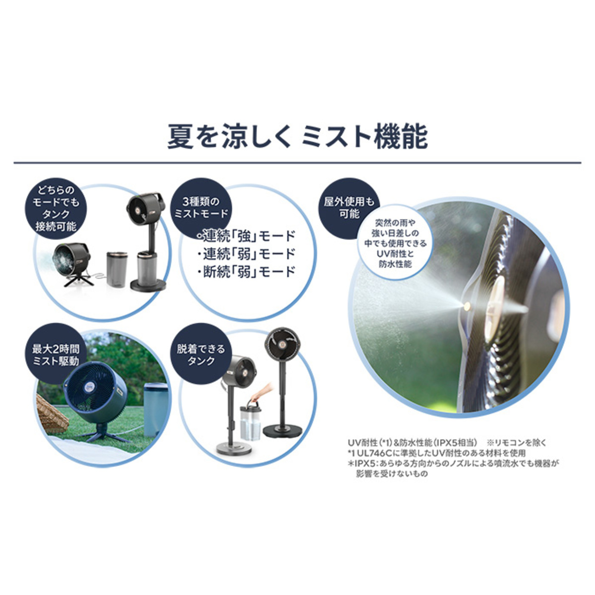屋外専用のミスト機能を搭載し、細かな粒子のミストが暑い季節のリフレッシュに役立ち、猛暑の熱中症対策にもおすすめ(*4)。お好みで選べる3つのミストモードや着脱式タンクで、いろいろな場所でミスト機能を楽しめます