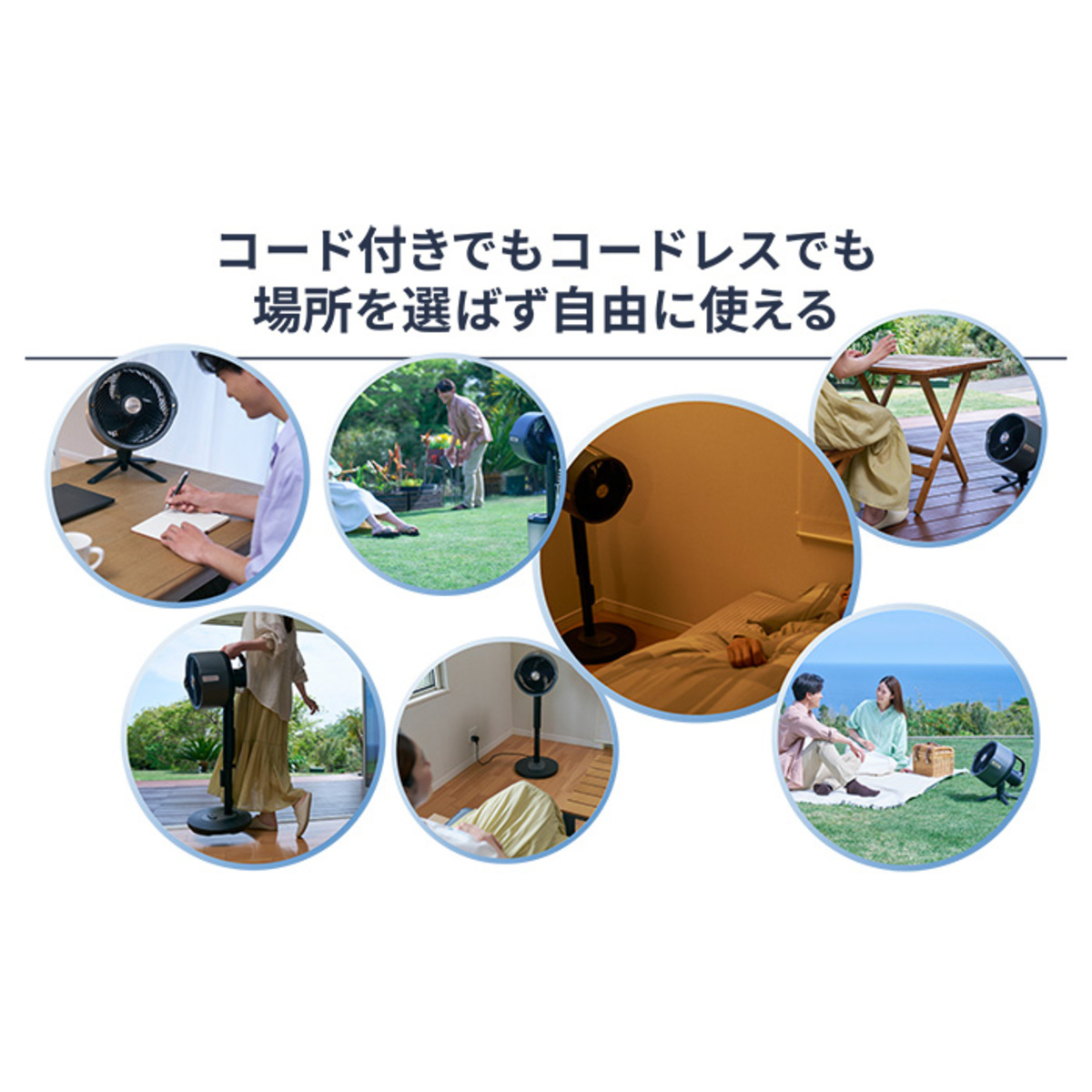 コードレスでもコード付きでも使える、屋内外対応のポータブルファン。ブーストモードでは最大20m先まで届く強い風を生み出します(*1)。屋外(*2)でも使用でき、コードレスでも最大24時間使用(*3)可能。また、サーキュレーターとして一年中活躍します