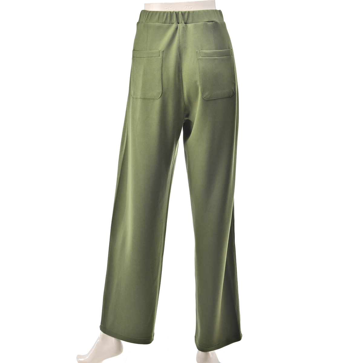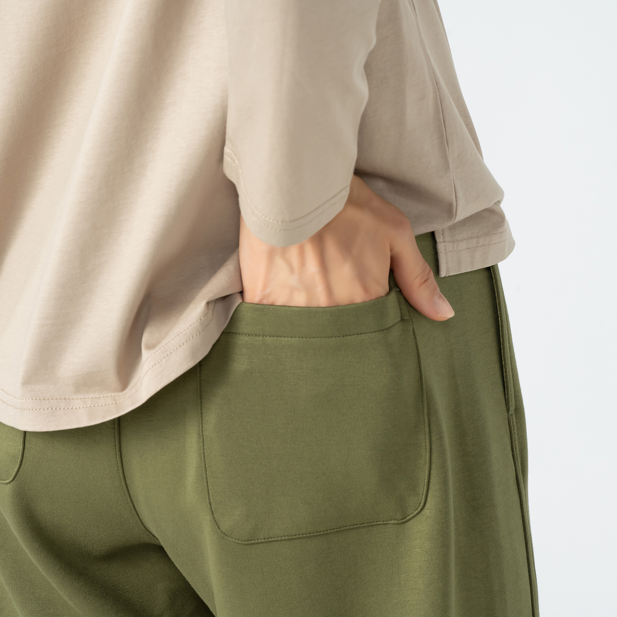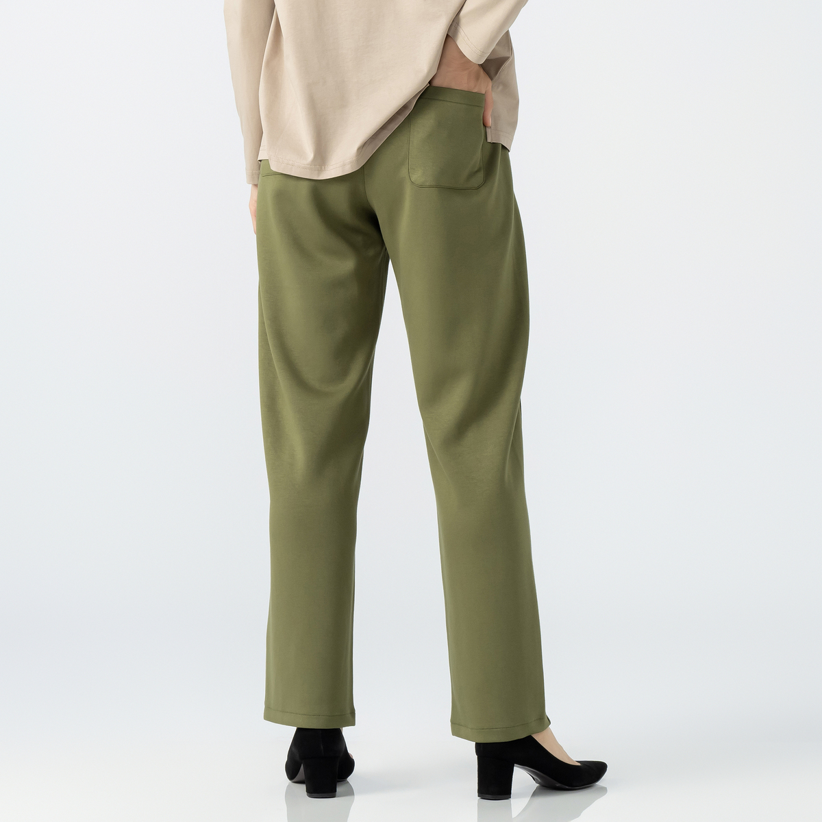 脇線の接ぎ目が無く、フロントのパネルラインに、少しカーブしたシルエットでこなれたニュアンスのカーブパンツ。ウエスト前はギャザー無し、後ろにギャザーを入れた総ゴム仕様で、フロントパネルラインにシームポケット付き、後ろはパッチポケット付きです