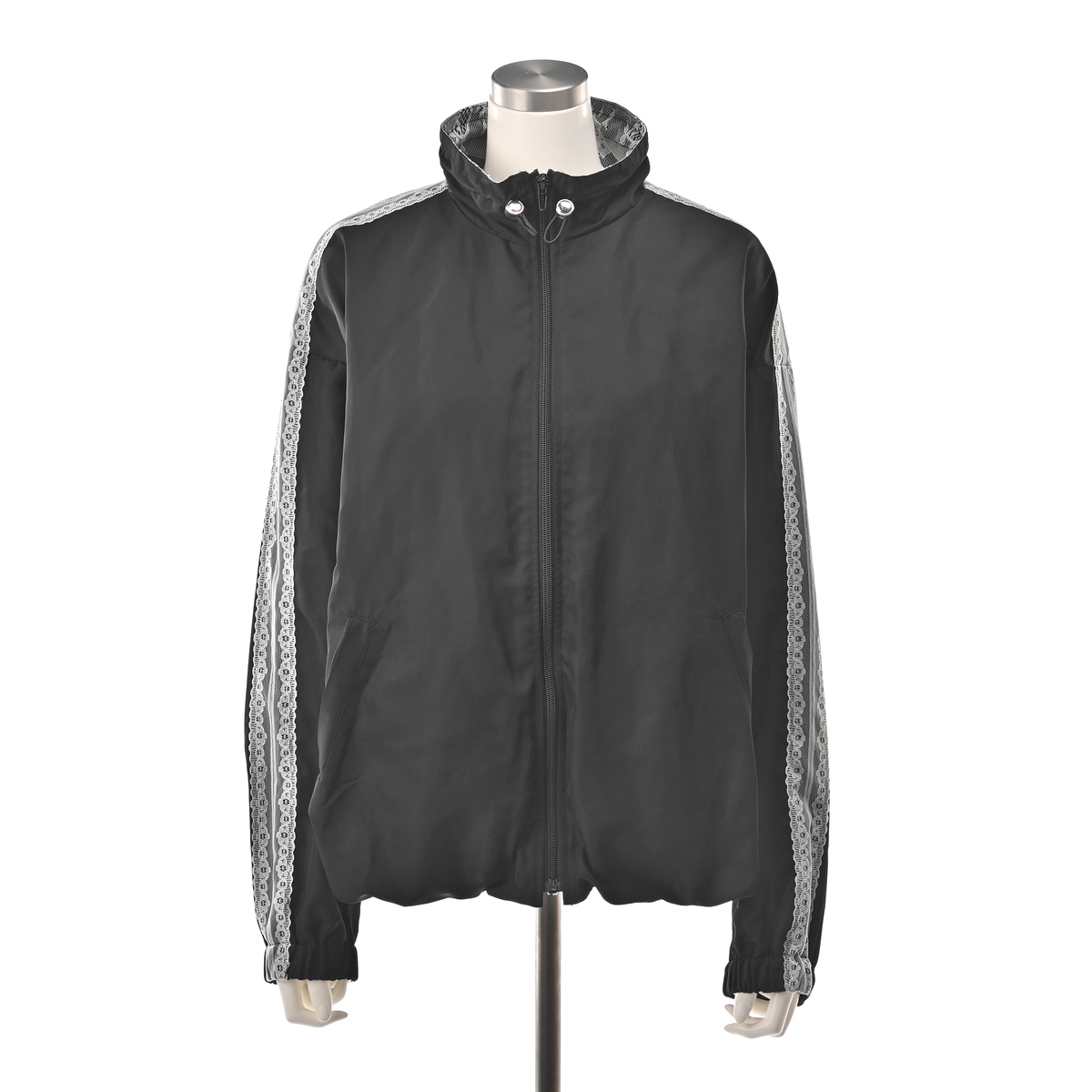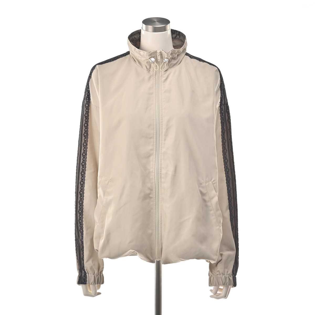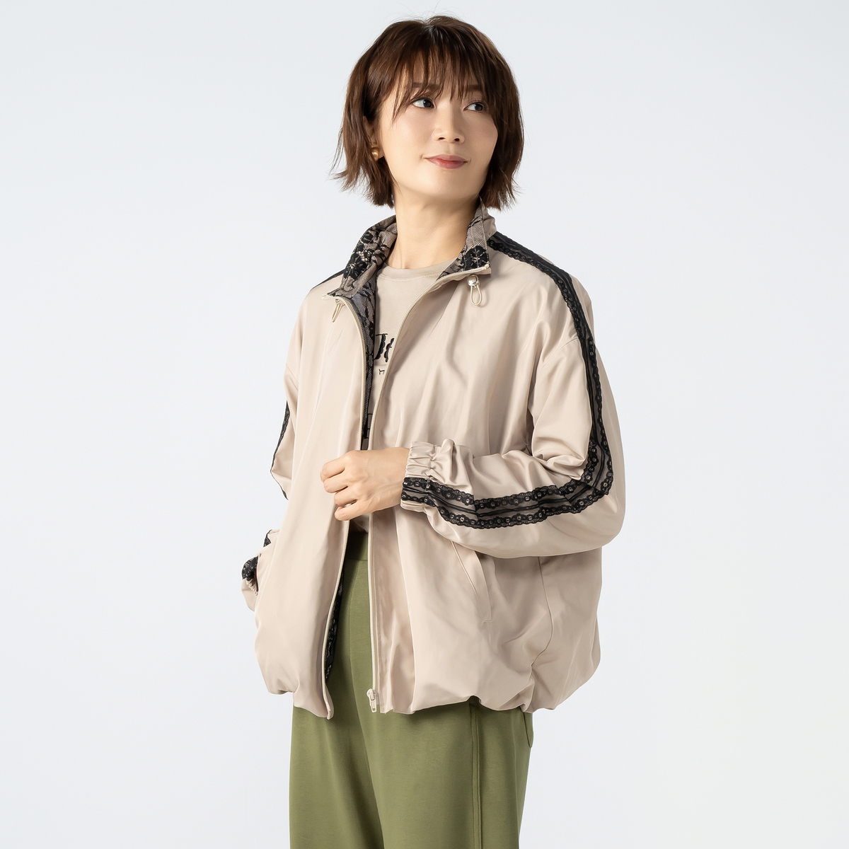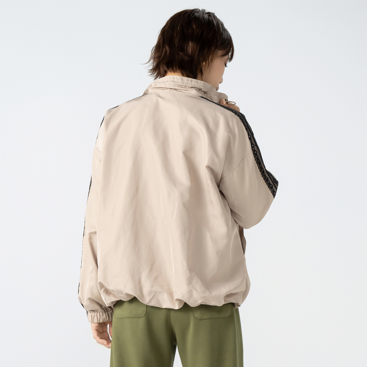 肩から袖にかけてあしらった配色レースが目を惹くトラックジャケット。ゆとりのあるシルエットで動きやすく、裾はゴム入りのギャザー仕様になっています