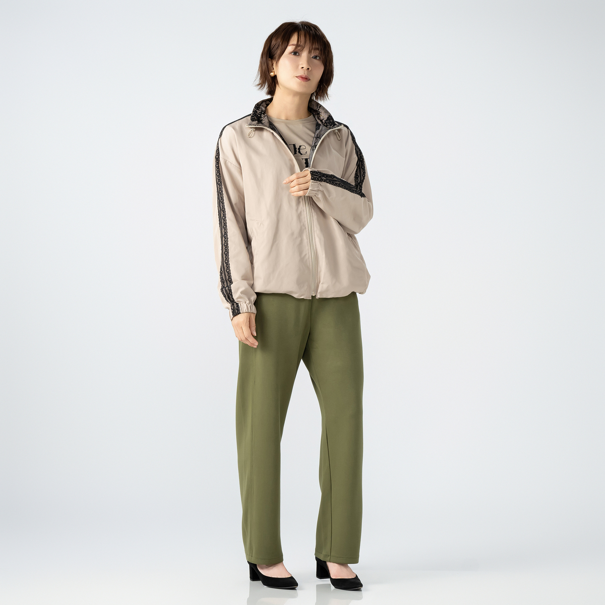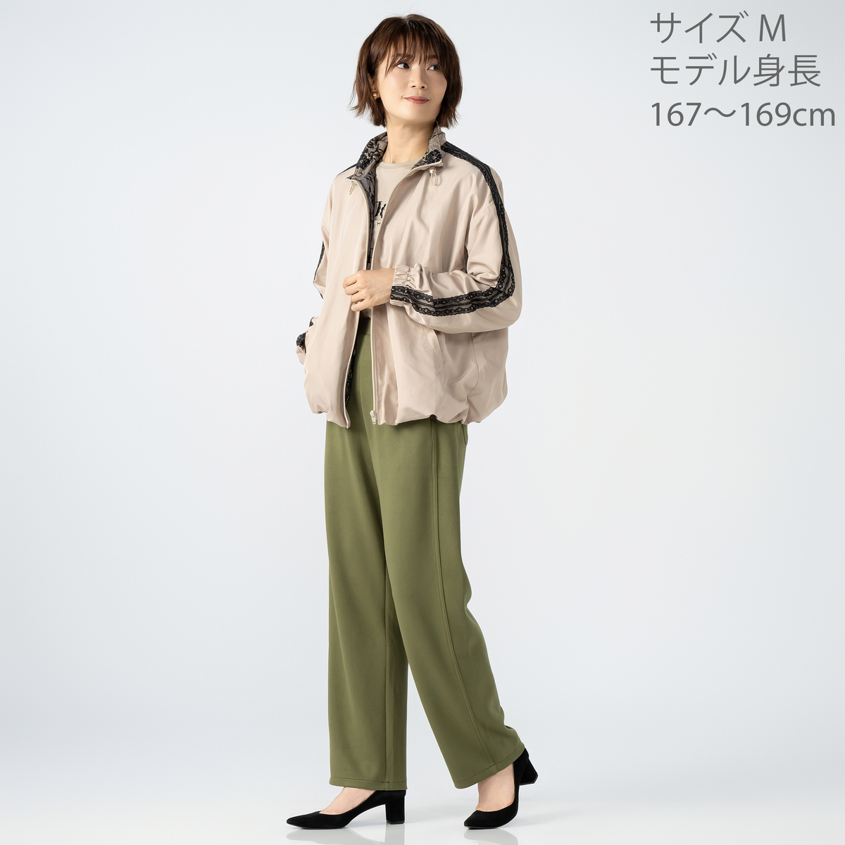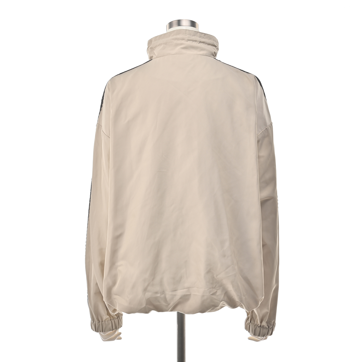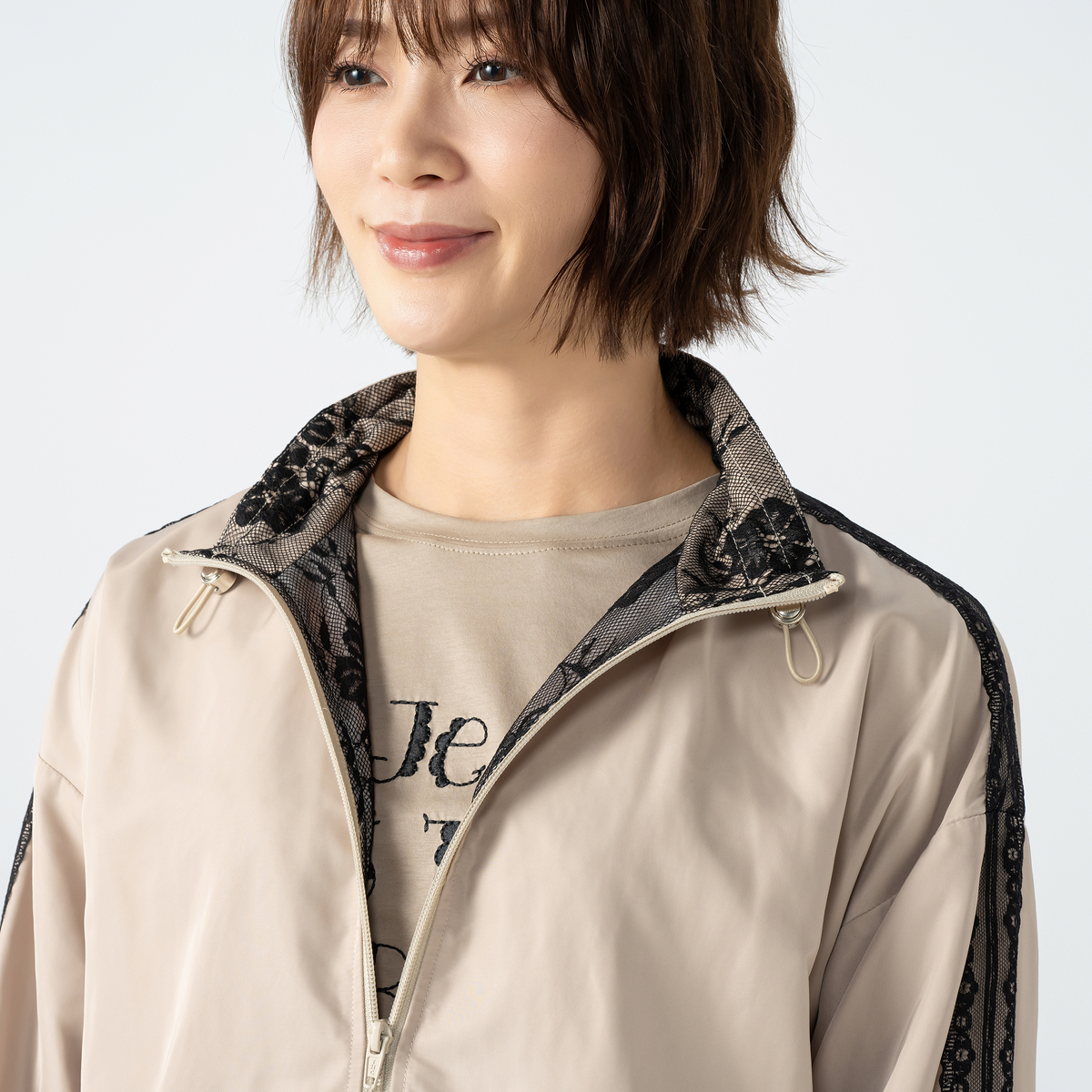 肩から袖にかけてあしらった配色レースが目を惹くトラックジャケット。ゆとりのあるシルエットで動きやすく、裾はゴム入りのギャザー仕様になっています
